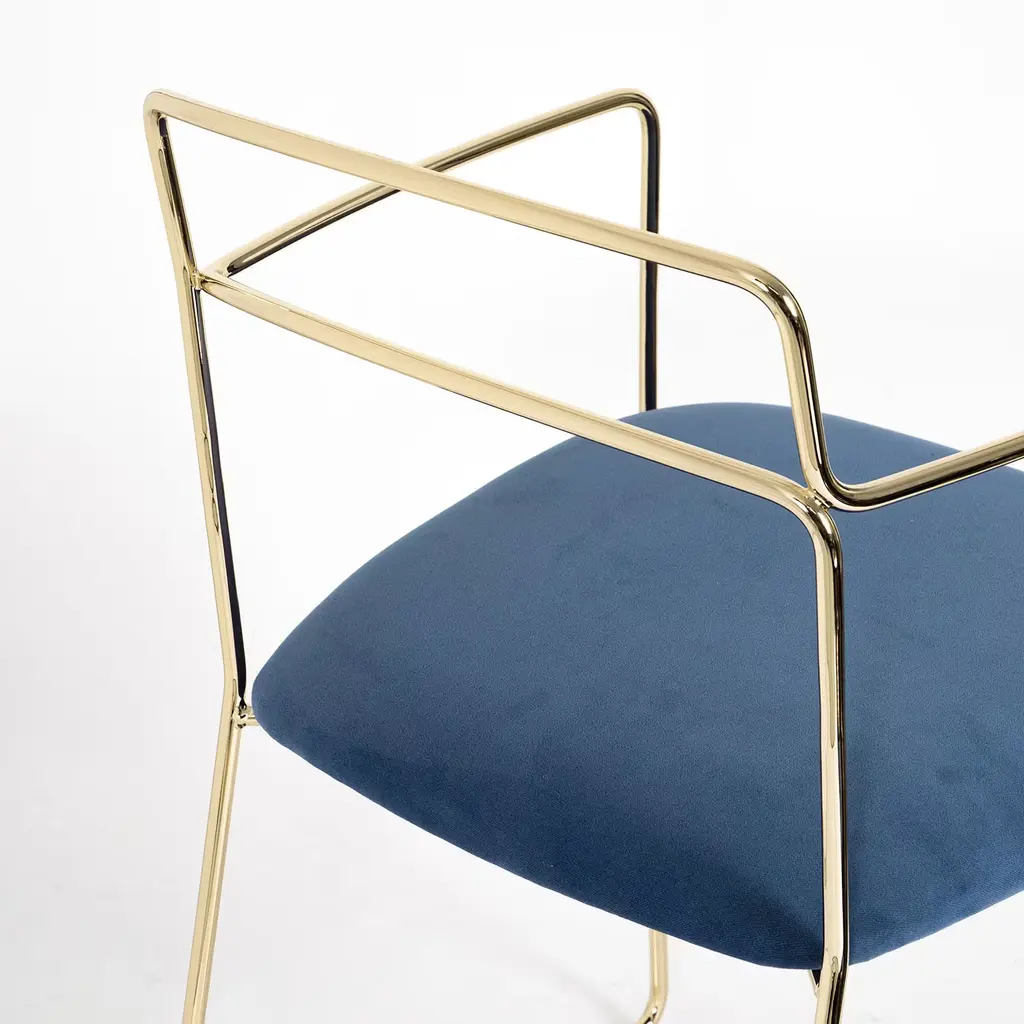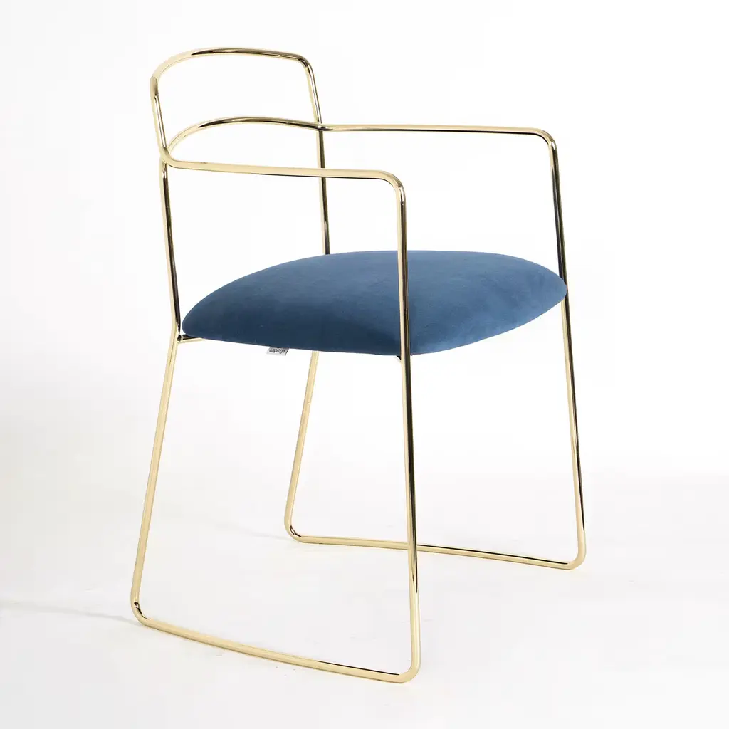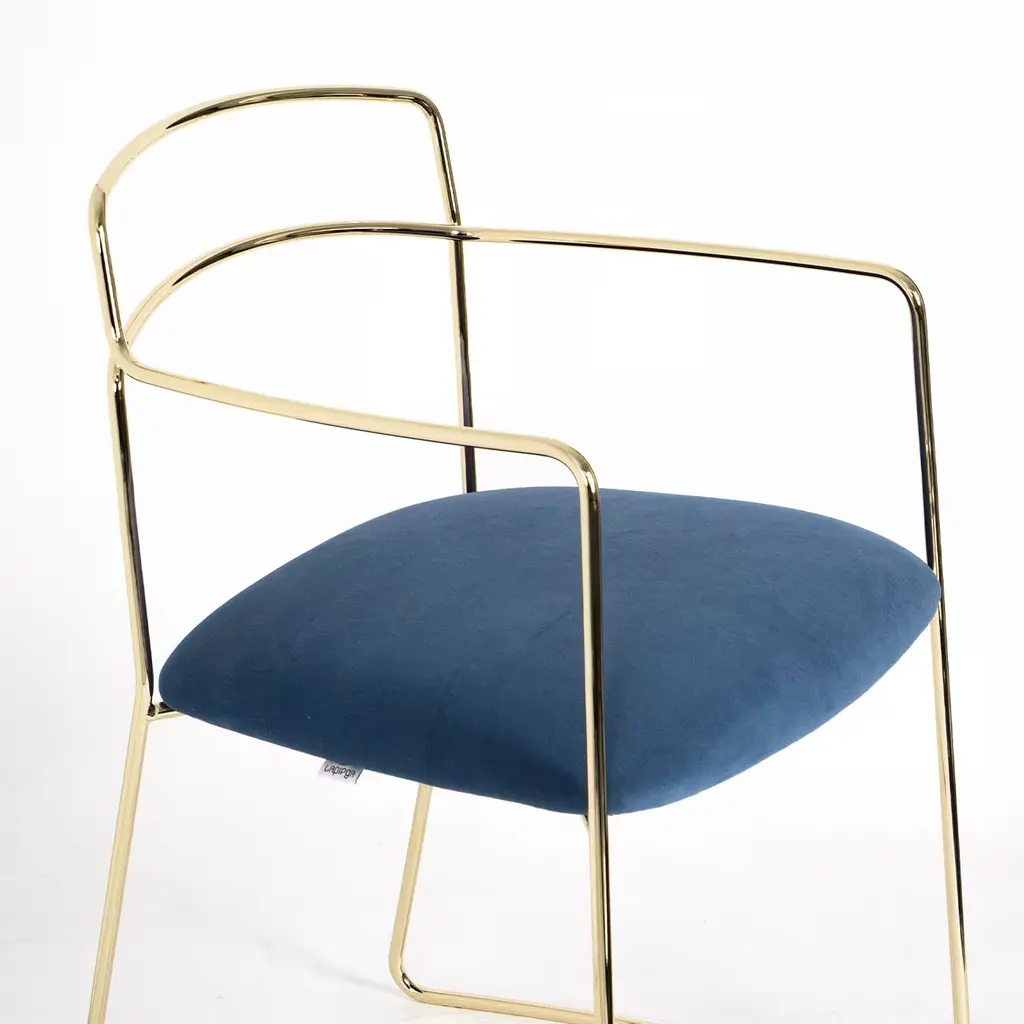 A testament to refined craftsmanship and contemporary design, this armchair is distinguished by a seamless profile, comprised of a continuous metal frame finished in polished gold. Softly padded, the seat is covered with blue velvet, customizable in color upon choice. Other metal finishes are also available upon request, please consult the Concierge for more details.