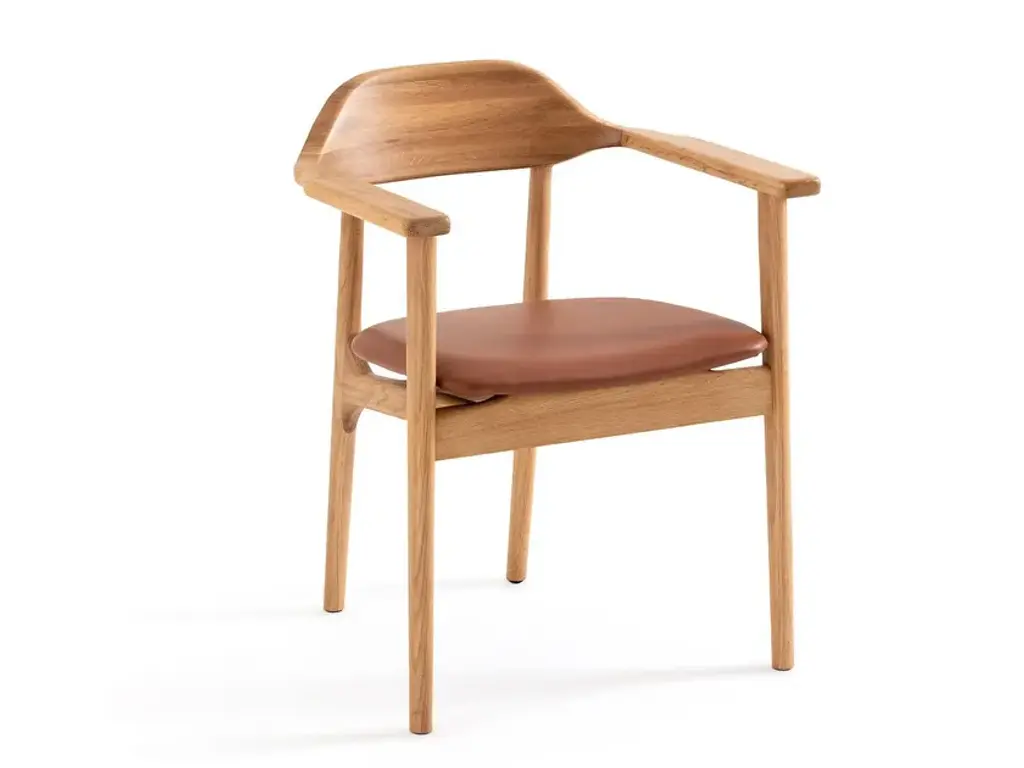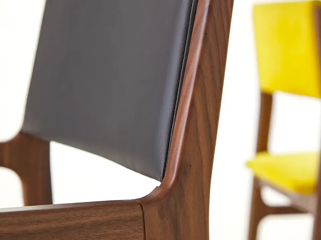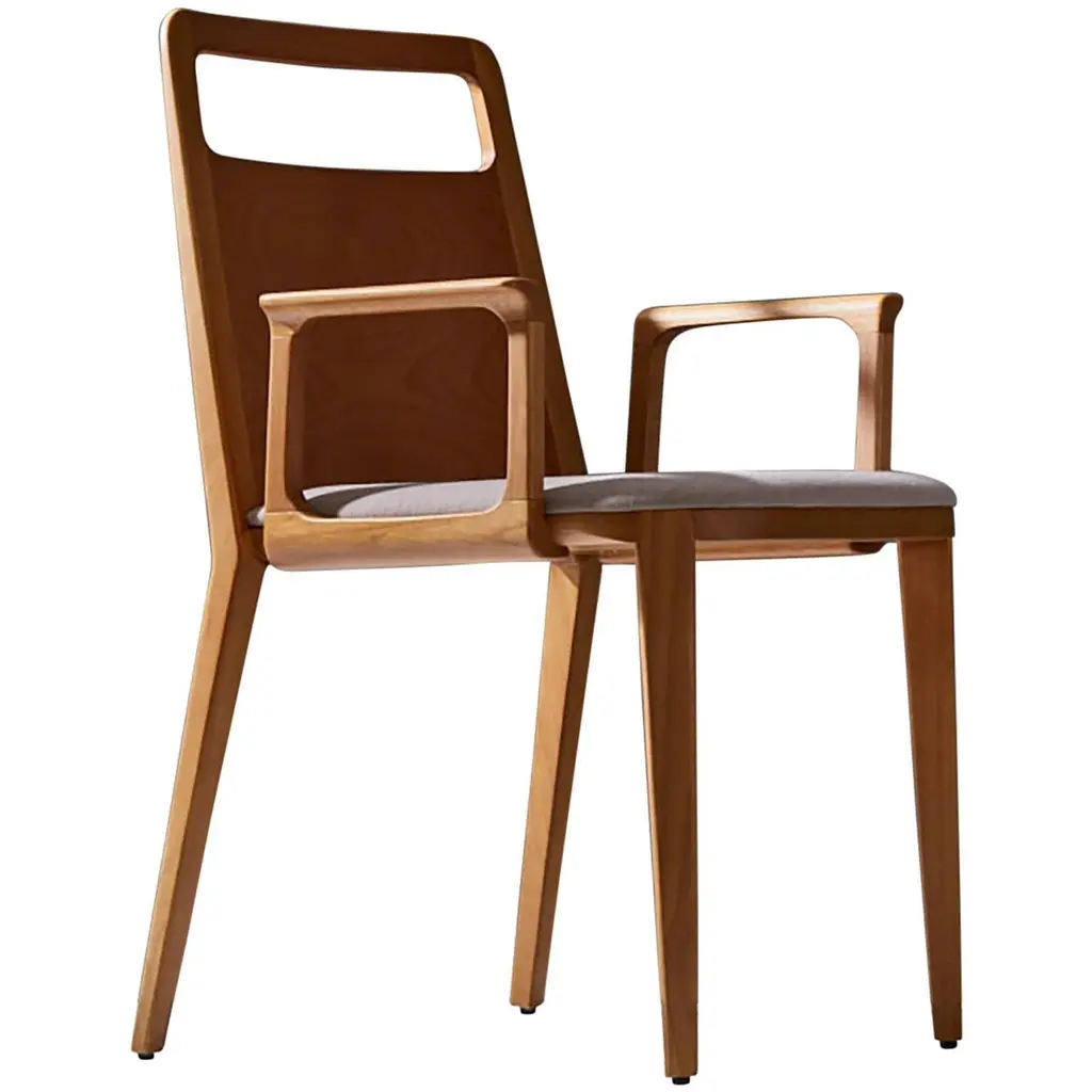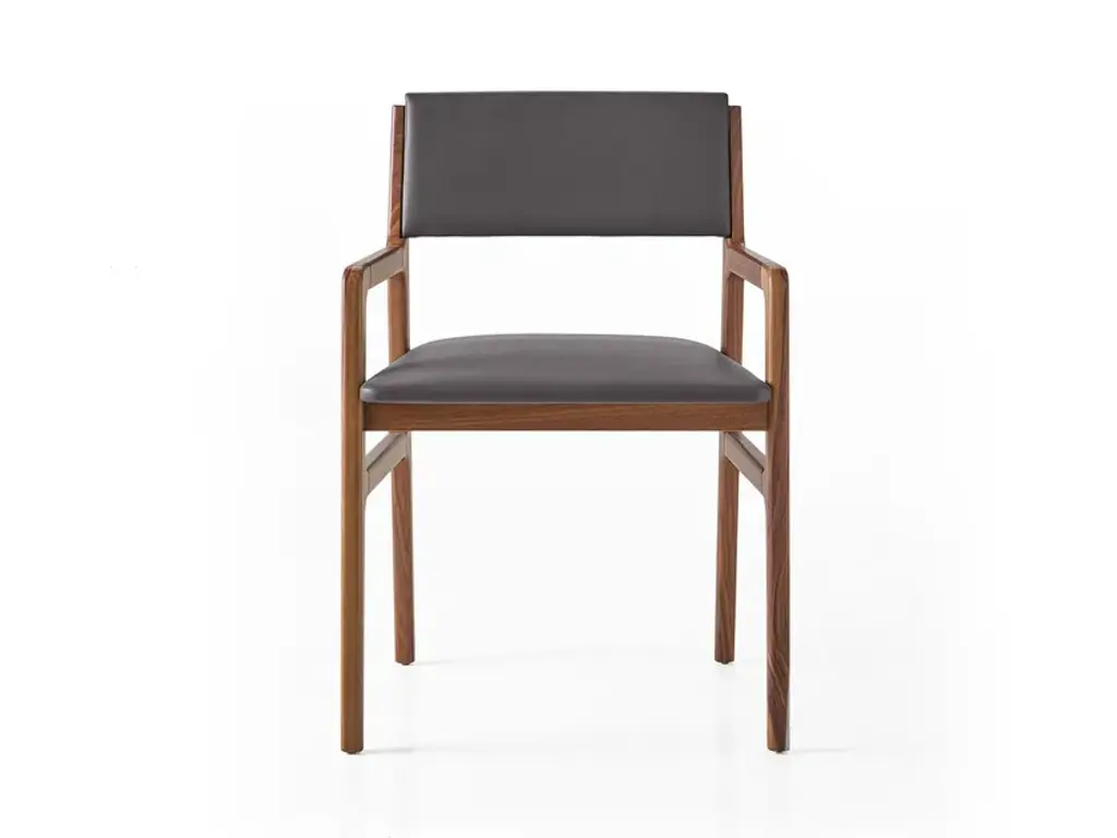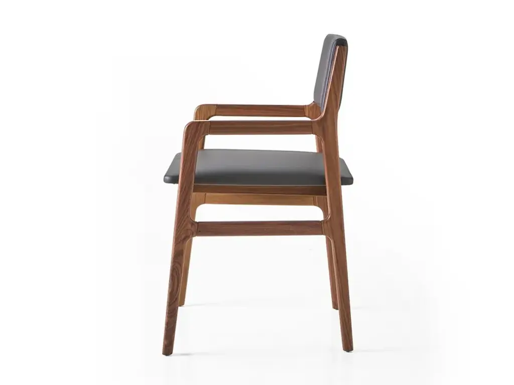 Upholstered wooden chair with armrests from the SHANGHAI collection. Chair with Canaletto frame, upholstered seat and back. Canaletto Olio finish, Moka Ecoleather cover (cat.A).13 finishes available - 3 covering cat. A (eco-leather/econbuk), cat. B (linen, velvet, bouclè), cat. C (leather).