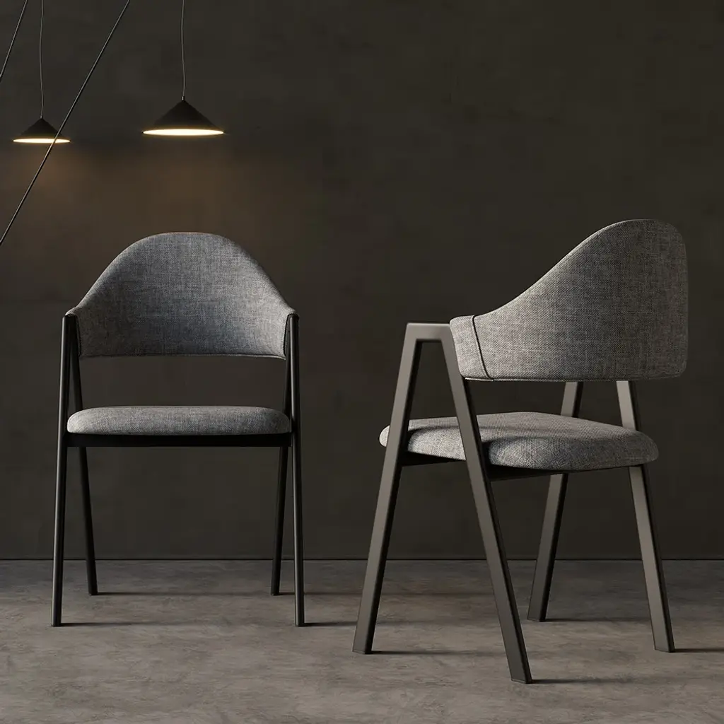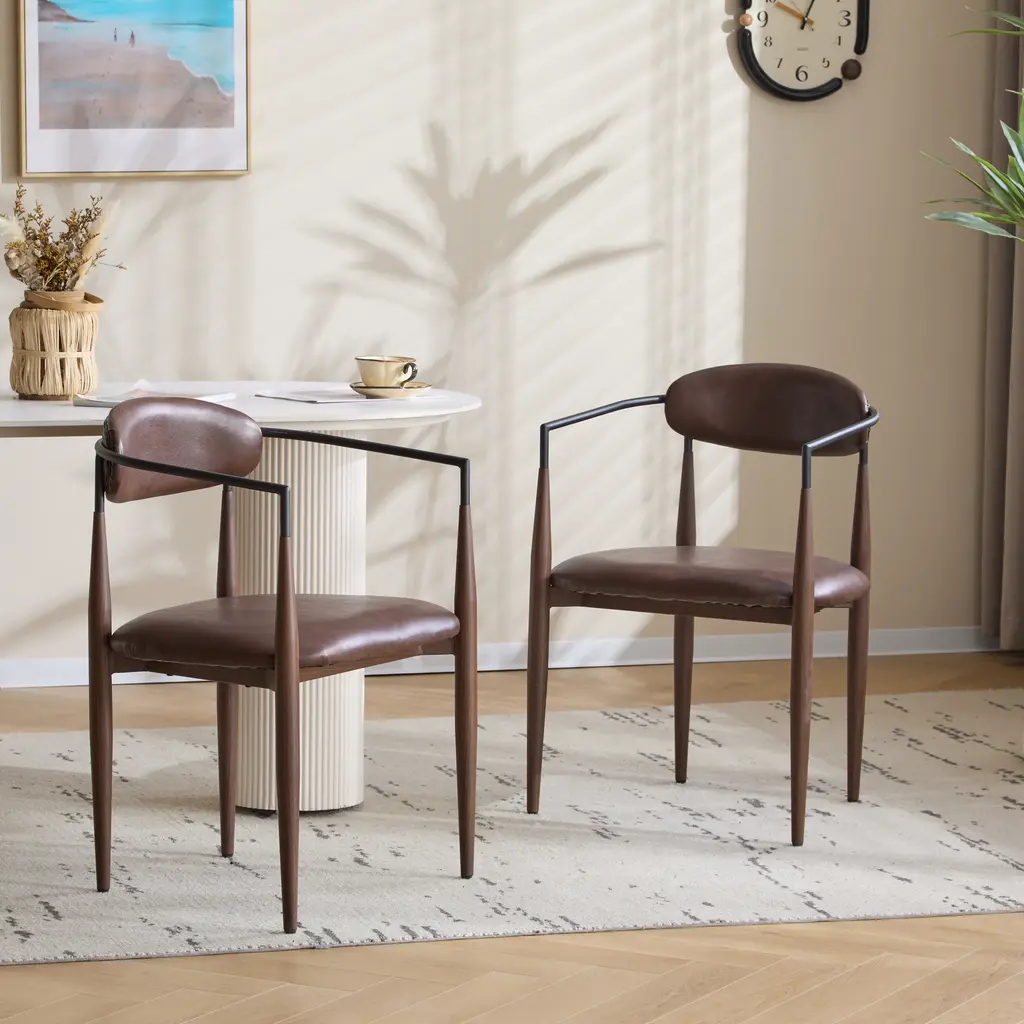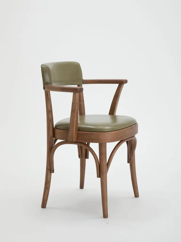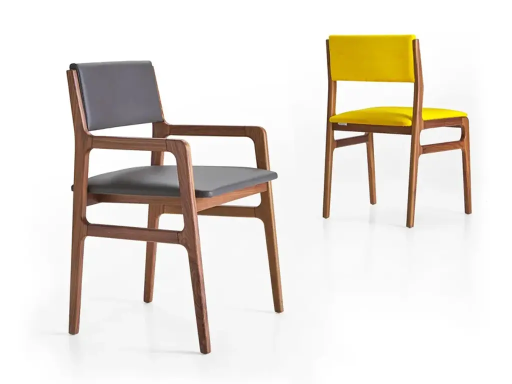 Upholstered wooden chair with armrests from the SHANGHAI collection. Chair with Canaletto frame, upholstered seat and back. Canaletto Olio finish, Moka Ecoleather cover (cat.A).13 finishes available - 3 covering cat. A (eco-leather/econbuk), cat. B (linen, velvet, bouclè), cat. C (leather).