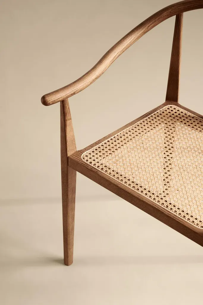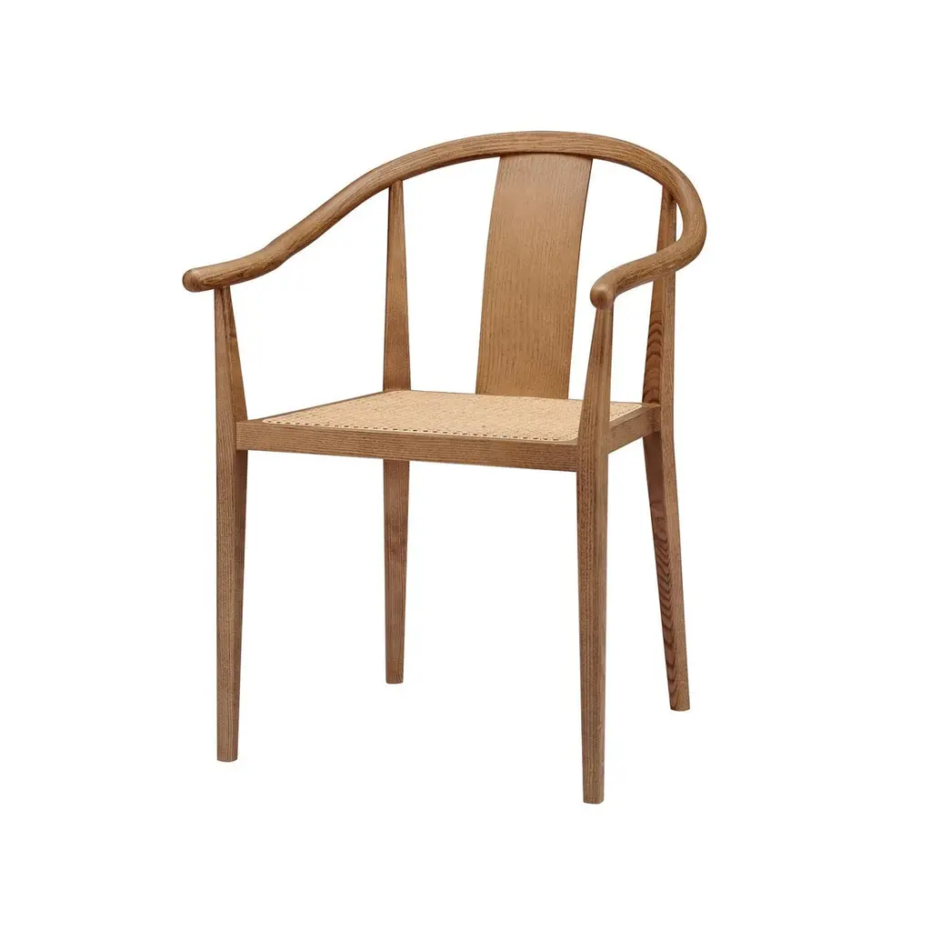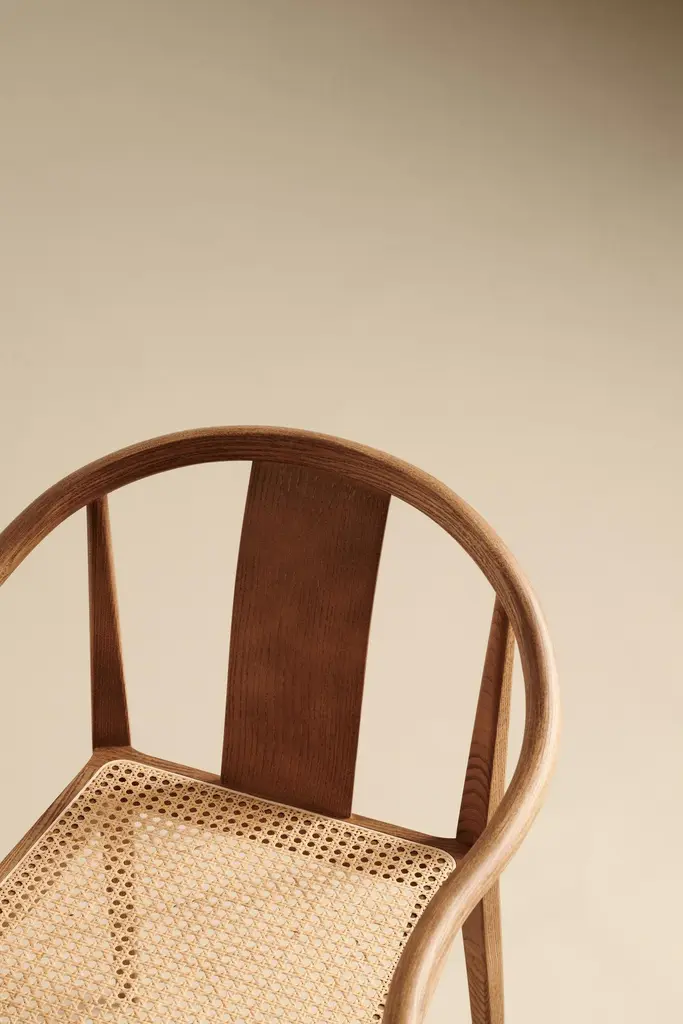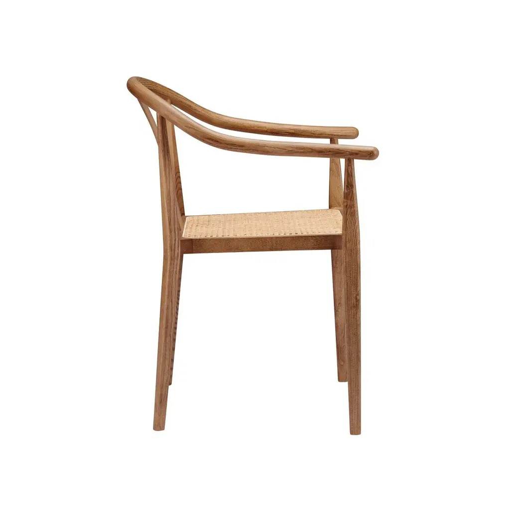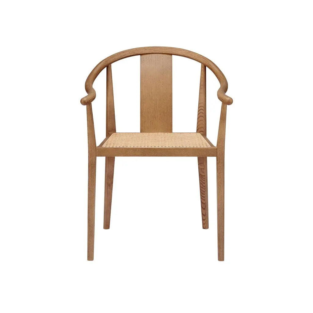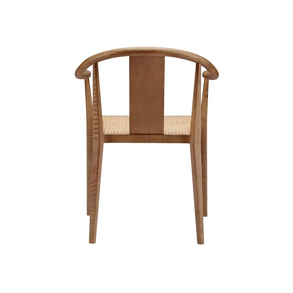 Scandinavian chair 'Shanghai' by Norr11Designed by Rune Krojgaard & Knut Bendik Humlevik, 2011Model in the picture: Frame: Light Smoked OakSeat: Natural RattanAvailable as well with paper cord, french rattan or various upholsteriesDimensions:W. 58,5 cmD. 57,7 cm H. 79,5 cm S.H. 45 cmArm rest 65 cmA modern interpretation of the ancient Chinese Horseshoe Chair. The Shanghai Chair features a steam bent solid ash wood frame and a seat of hand woven paper cord, french rattan or upholstery. The back and the armrest play a central role in the chair’s construction, giving it an iconic shape and firm support. The beauty of the ash wood is an integral part of this chair’s expression, creating a piece of furniture from a simple structure and minimal detailing, uniting Asian and Scandinavian furniture design.Fusing Scandinavian design with Asian aesthetics NORR11’s design language combines the past and the present in a timeless design. The inspiration is found in the nature and raw natural materials which are evident in the collections. The company’s headquarters, design studio and flagship showroom is in the city centre of Copenhagen showcasing the full design universe of NORR11.
