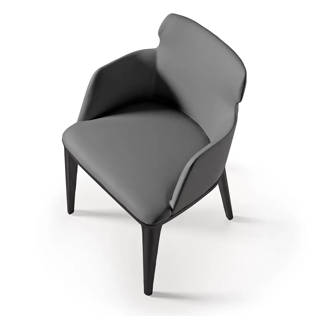 A smooth synthesis of aesthetic balance and comfort distinguishes this elegant chair, fine design available in multiple finishing and cover options as well as in armchair counterparts on request to the Concierge. The sculpted perimeter of the backrest is a common trait of the Shape Collection, tracing the contours of the soft padding in different-density polyurethane that also characterizes the seat, both covered in gray velvet. Tapered legs in dark-Tay-finished ensure excellent support.