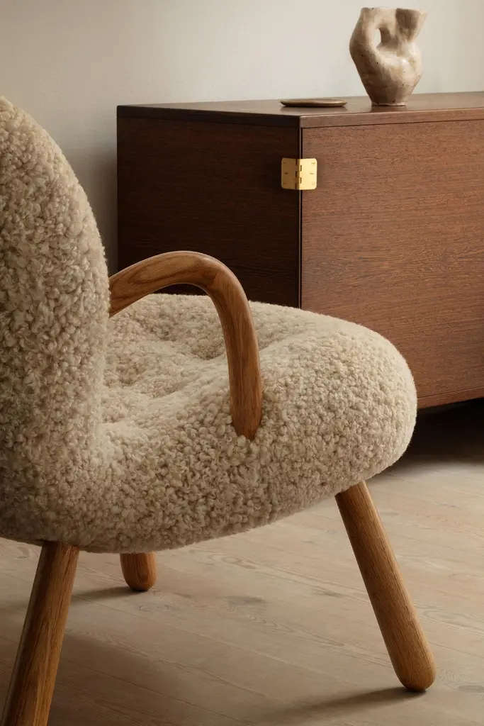 Official Re-Edition of the iconic Clam Chair by Arnold Madsen.The Clam Chair was designed in 1944 in Copenhagen by Danish upholsterer Arnold Madsen. In 1945 Arnold founded the furniture company Madsen & Schubell together with cabinetmaker Henry Schubell in order to produce this unique chair that became known in Danish as the: 'Muslingstol' (Clam Chair), due to its unique shape. This new edition has been crafted using a blend of traditional joinery techniques and modern technology, resulting in an authentic product of the highest quality. Dagmar is proud to re-launch this icon of the Danish Modern movement in collaboration with the estate of Arnold Madsen. The Clam Chair is available in a wide range of upholstery and wood finishes. Examples Shown: Moonlight Sheepskin + Fumed OakHeight: 82cm (32.3”)Depth: 80cm (31.5”)Width: 65cm (25.6”)Seat Height: 42cm (16.5")