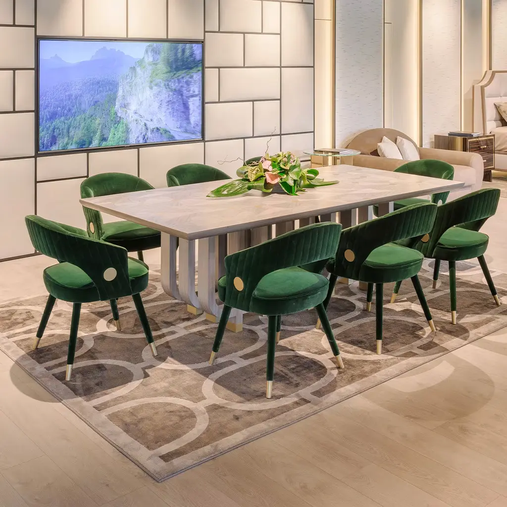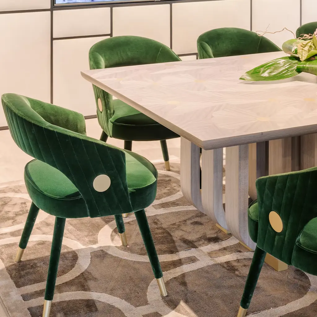 As it evocatively suggests its name, this polished wooden chair offers unique comfort provided by the thick seat (52cm height) and cutout, semi-circular backrest padded with polyurethane foam and covered with fabric in a captivating hue of green. Supported by four thin legs enriched with brass-finished metal details, this piece is available in other finishing options, please ask the Concierge for details.
