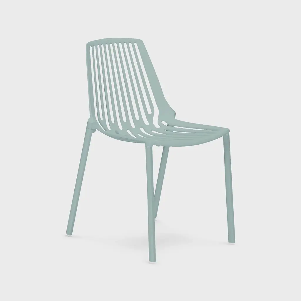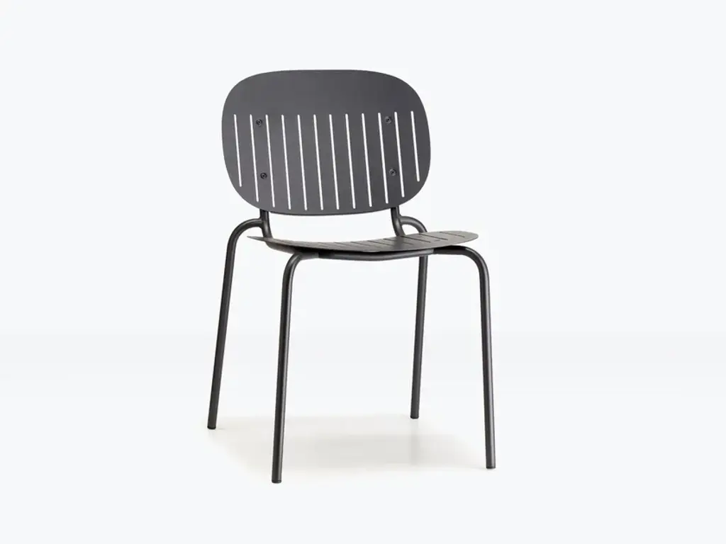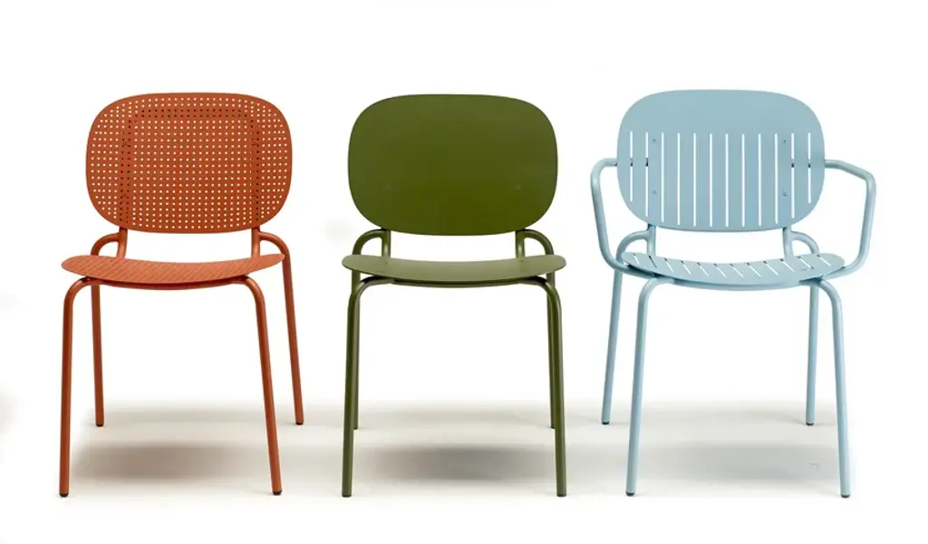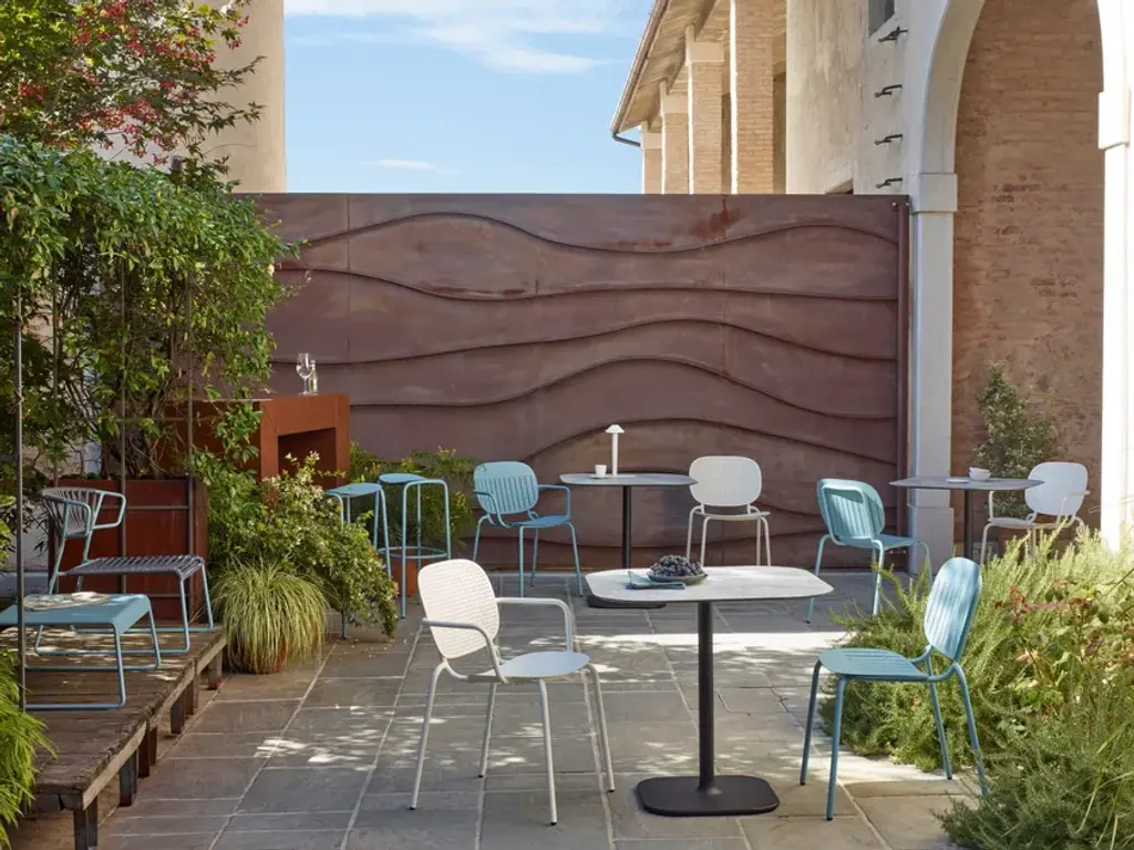 SI-SI, an eclectic, chameleon-like, multi-material seat with aesthetic strength and substance, to interpret the fragile balance between indoor and outdoor. Four basic models, with characterizing details: SI-SI (smooth texture), SI-SI DOTS (dotted texture), SI-SI BARCODE (texture with vertical cuts), and SI-SI WOOD (seat and backrest with wooden slats).A frame and four “bodies” with heterogeneous textures and materials that make it suitable to very different environments, both outdoor and indoor.Finish: galvanized and painted steel structureColors: linen, taupe, anthracite, terracotta, air force blue and olive green