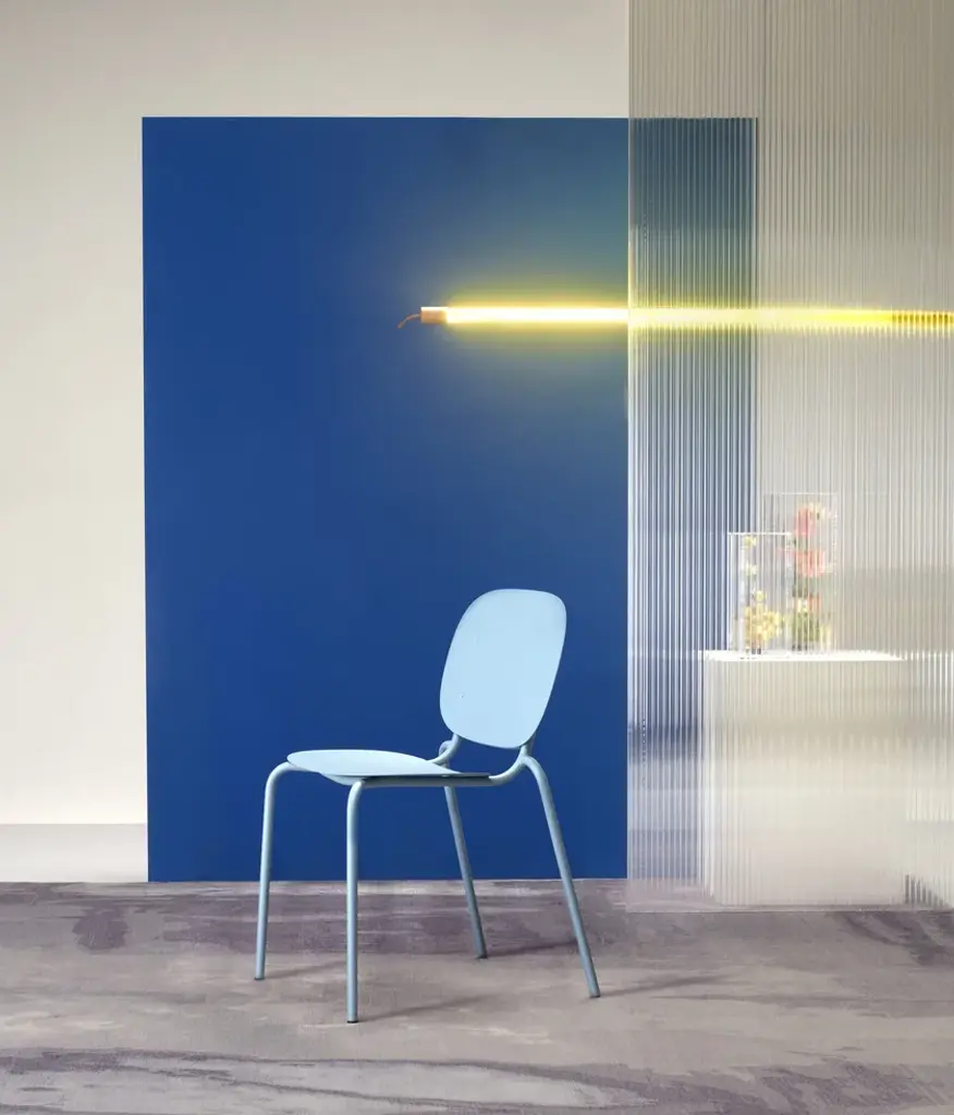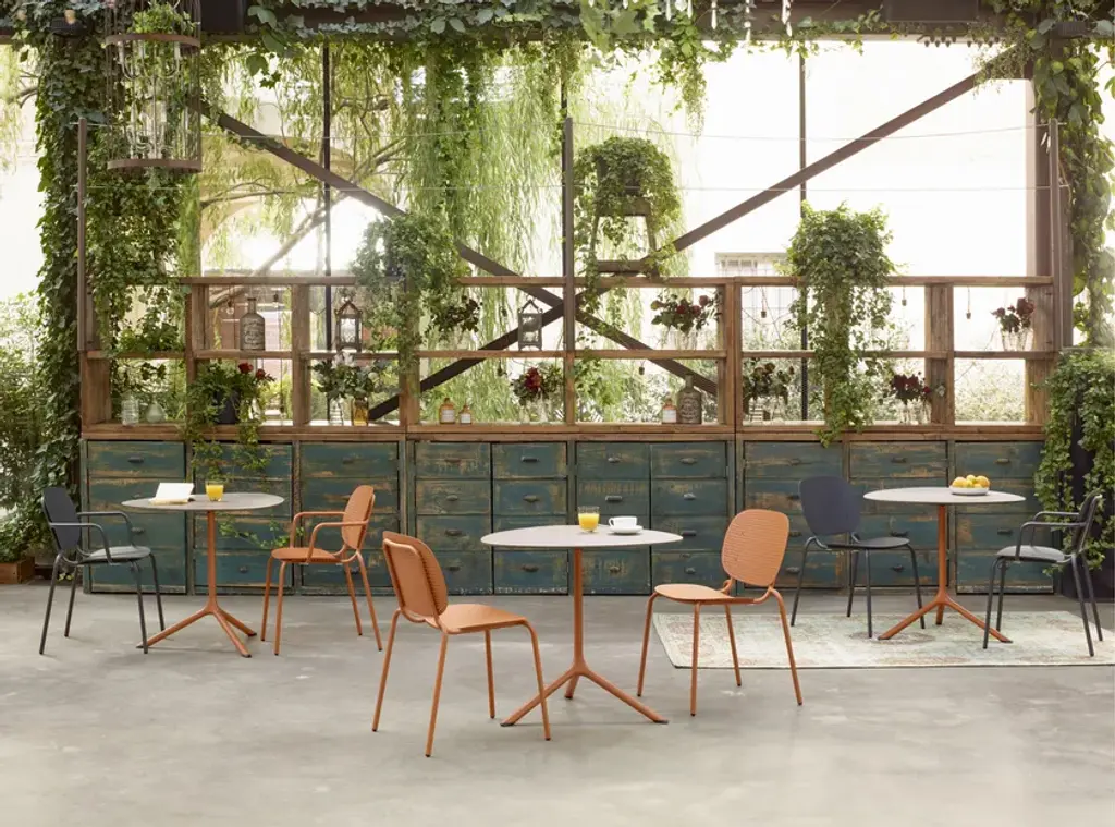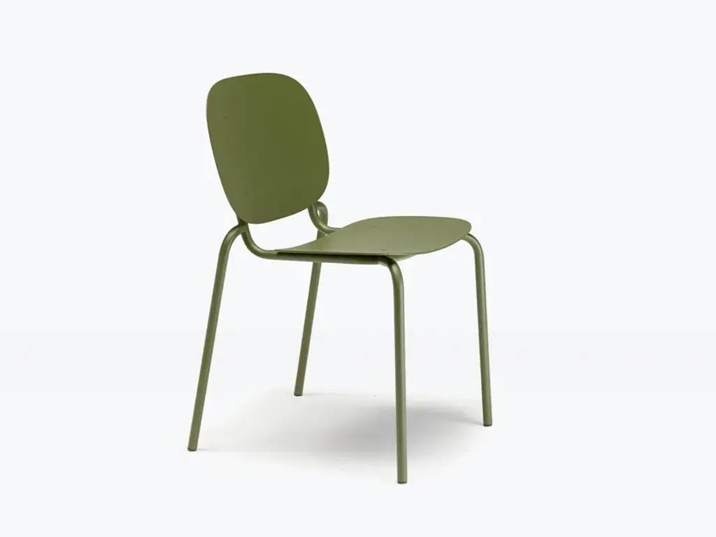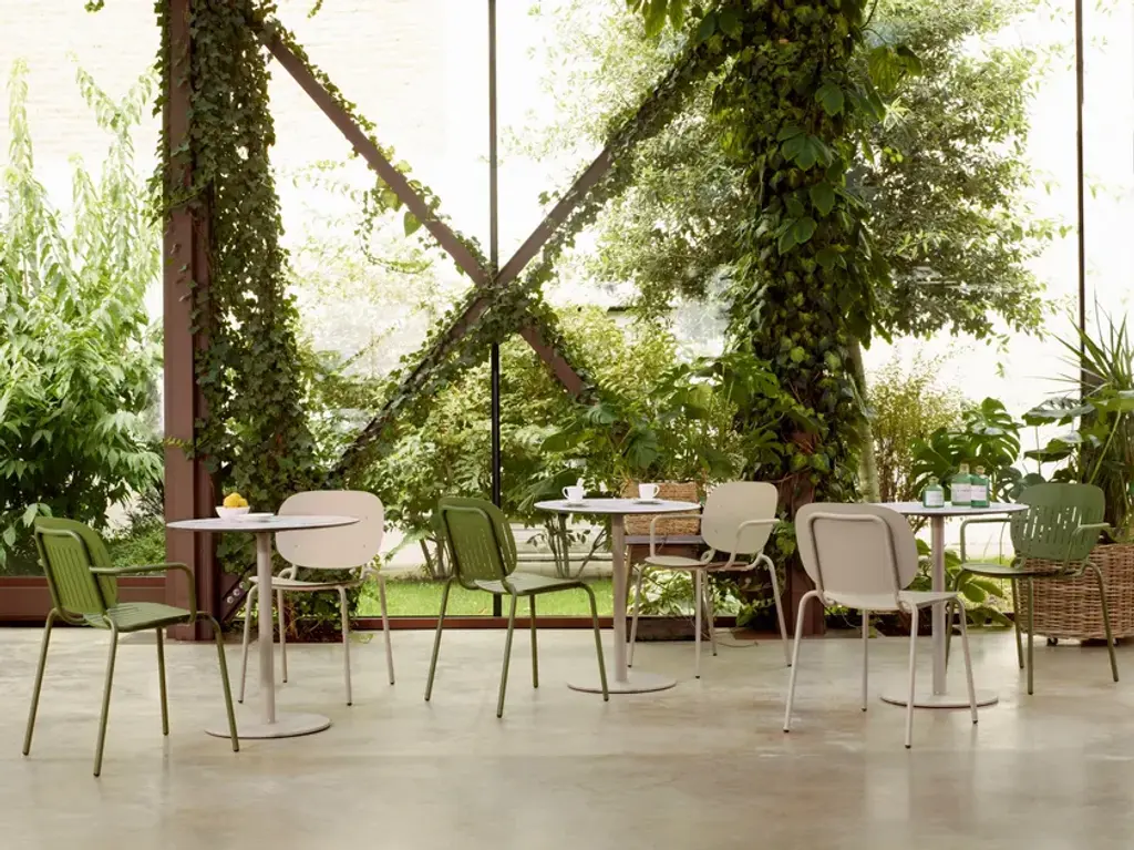 SI-SI, an eclectic, chameleon-like, multi-material seat with aesthetic strength and substance, to interpret the fragile balance between indoor and outdoor. Four basic models, with characterizing details: SI-SI (smooth texture), SI-SI DOTS (dotted texture), SI-SI BARCODE (texture with vertical cuts), and SI-SI WOOD (seat and backrest with wooden slats).A frame and four “bodies” with heterogeneous textures and materials that make it suitable to very different environments, both outdoor and indoor.Finish: galvanized and painted steel structureColors: linen, taupe, anthracite, terracotta, air force blue and olive green
