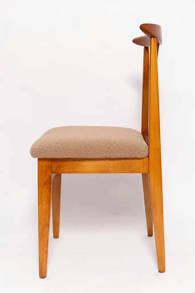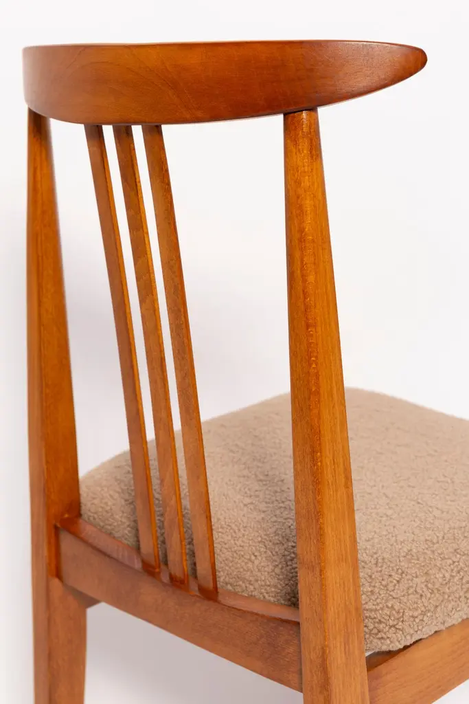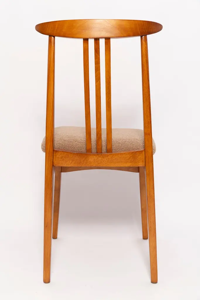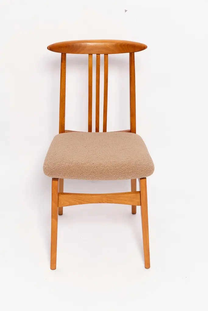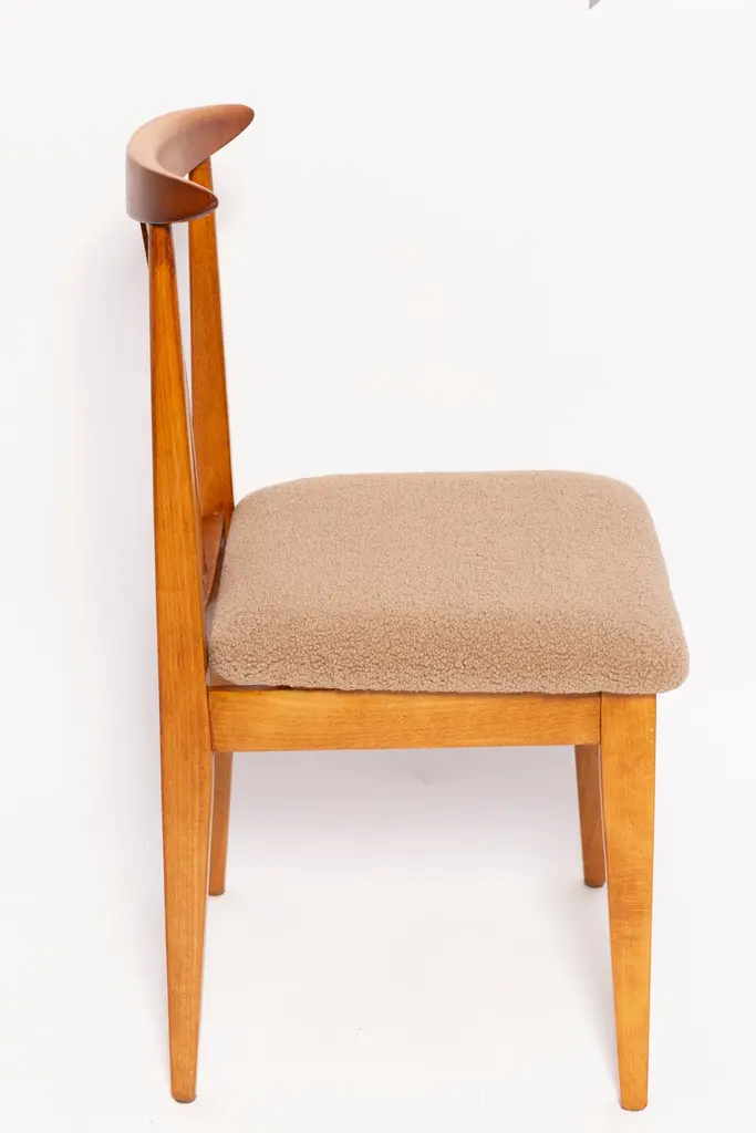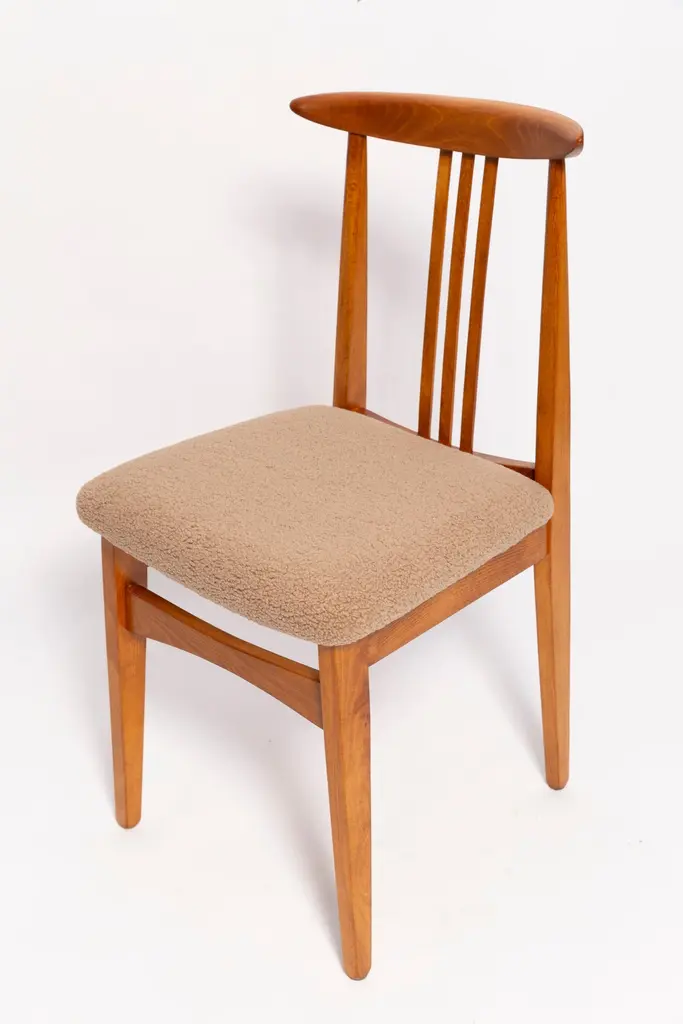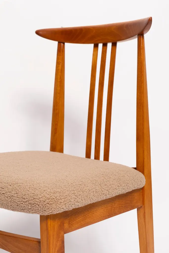 A beautiful beech chair designed by M. Zielinski, type 200 / 100B. Manufactured by the Opole Furniture Industry Center at the end of the 1960s in Poland. The chair is after undergone a complete carpentry and upholstery renovation. Seats covered with high-quality italian camel latte boucle fabric (color 04). Beech wood is after full refreshing, varnished in a medium brown color lacquer. This model of chair have very nice and organic shape. They have amazing form. Even in small size the Zielinski's chair is very comfortable. We highly recommend them to every type of interior. ecommend them to every type of interior. We can prepare also bigger sets in every color of wood and boucle. Please have a look on the last picture. Waiting time up to 3 weeks. Cheap delivery guaranteed.Here set of 6 is available.