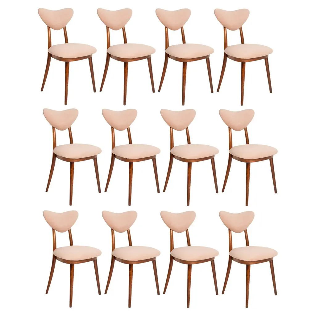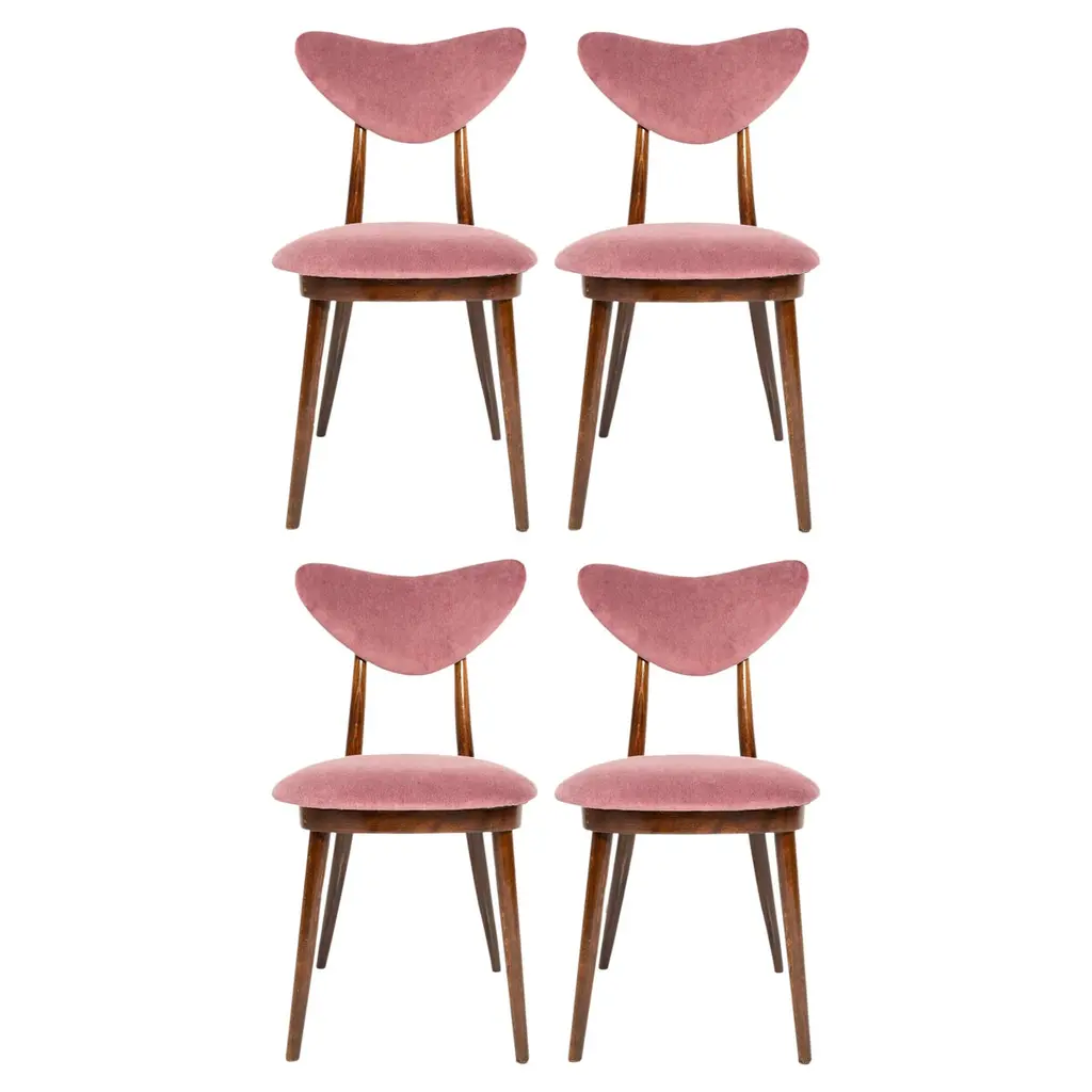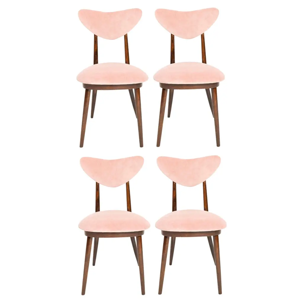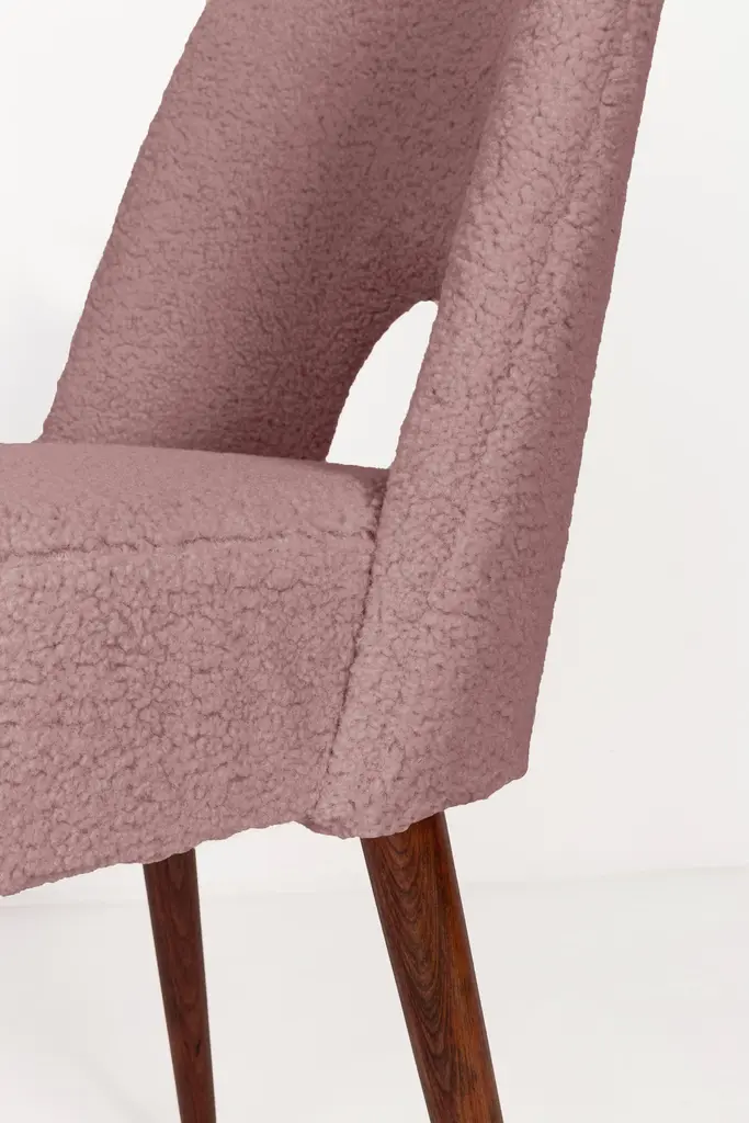 Set of six beautiful chairs type 1020 colloquially called "shells" produced by the Slupsk centre of furniture industry in the 1960s in Poland. They are after full renovation upholstery and carpentry. Seat and back is dressed in pink (color 03), durable and pleasant to the touch bouclé fabric. We can prepare this set in every color of wood and fabric also in smaller or bigger sets.