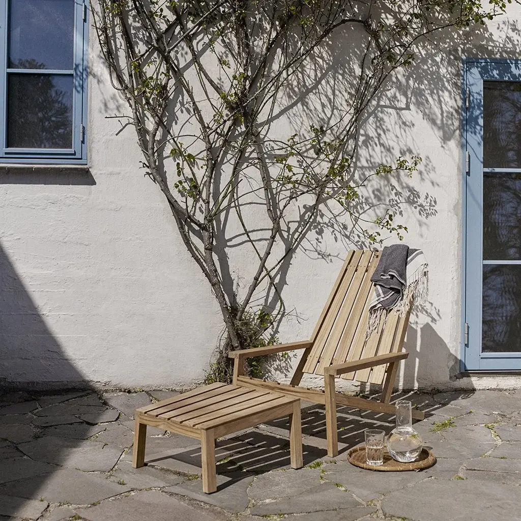 Relaxing moments in a busy day. Between Lines is a deck chair designed with a starting point in the wooden stick's straightforwardness and clear cut. The chair's low seating height brings you down to earth in a perspective where everything seems a bit more peaceful and calm. The design is inspired by the classic Adirondack deck chair, and balances between an American sturdiness and a tight, Scandinavian expression. The cushion for the Between Lines Deck Chair can be found here