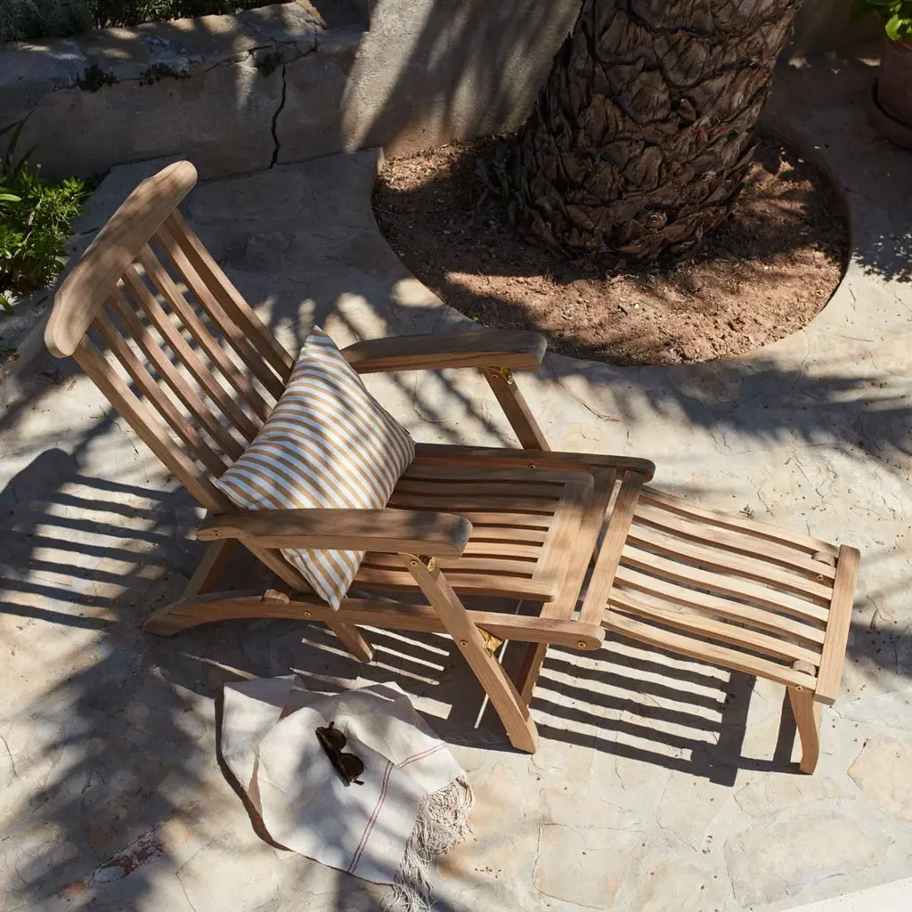 Take your summer chill to the next level with Steamer Deck Chair, inspired by the curved lines of a big cruise ship. The chair has an integrated footrest and can folded up and easily stored away when not in use. Crafted from high-quality teak wood in a clean and light expression, functionality and comfort is at the forefront of this Nordic Deck Chair.