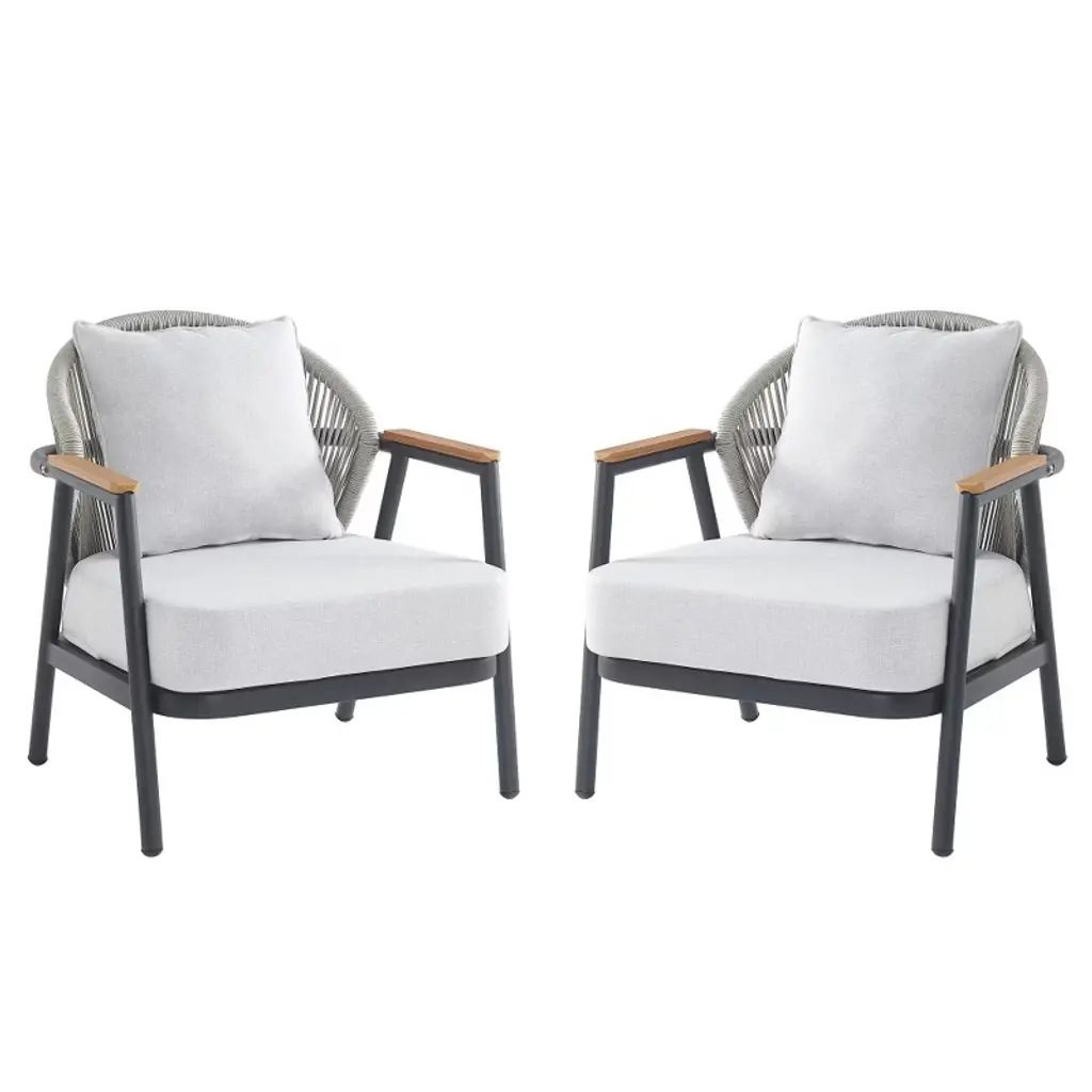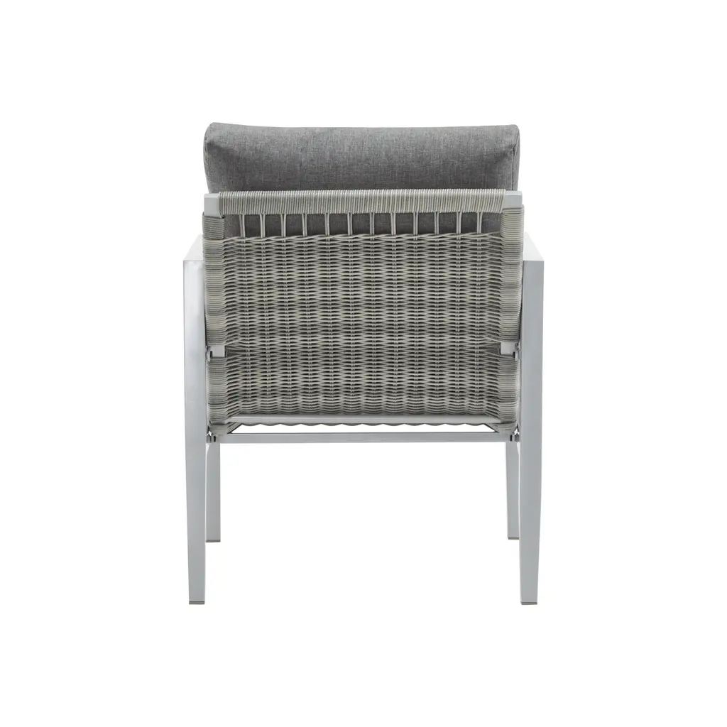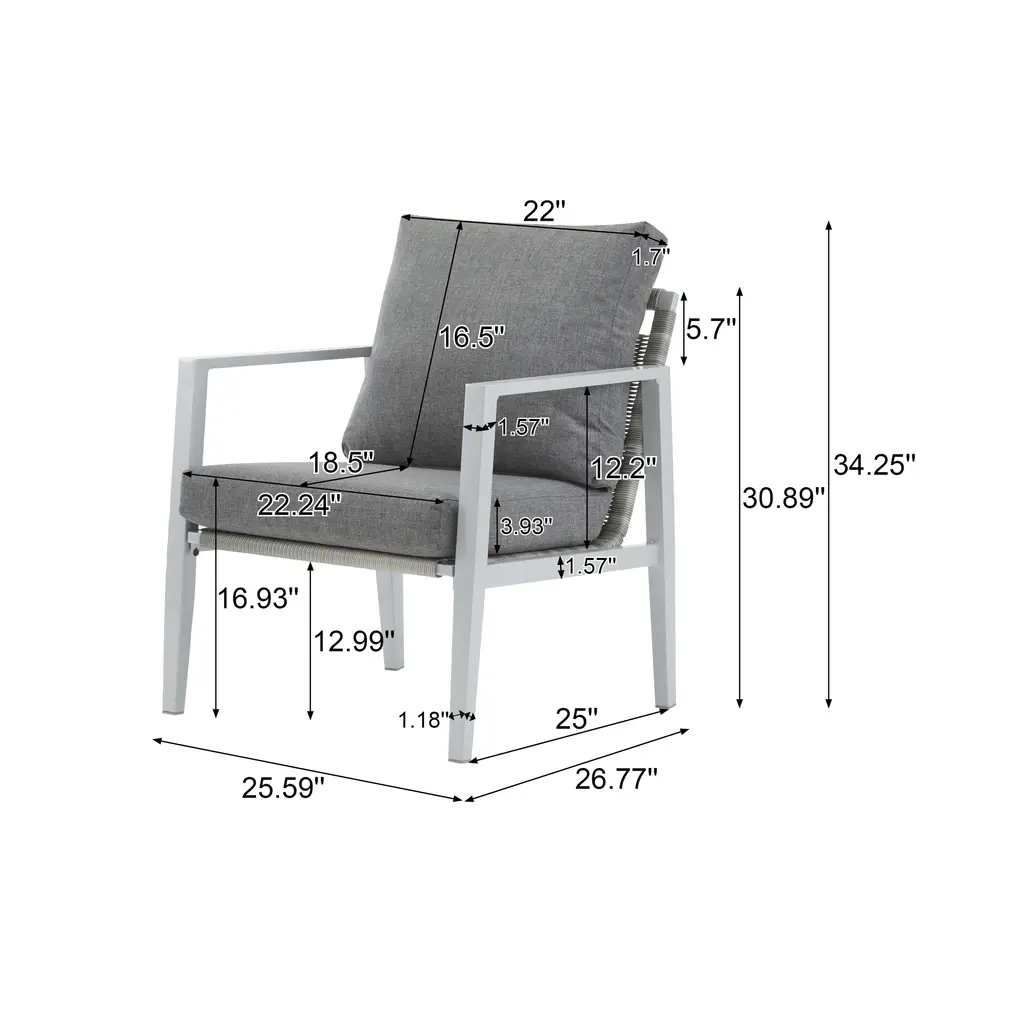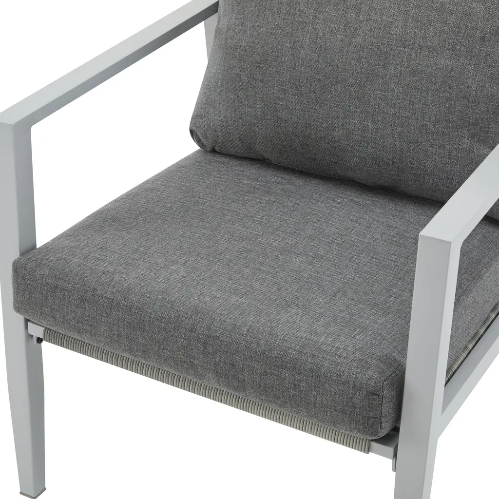 This aluminum lounge chair is a true masterpiece that combines style and comfort. The sleek aluminum frame not only provides durability but also gives a modern touch. The rope accents add a unique charm and texture, making it stand out. Whether placed in an outdoor garden or an indoor living area, it effortlessly enhances the aesthetic. The comfortable cushions ensure a relaxing seating experience, allowing you to unwind and enjoy your time. Its versatile design makes it suitable for various settings and occasions, making it a must-have for those who appreciate both form and function.