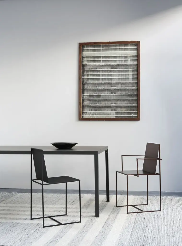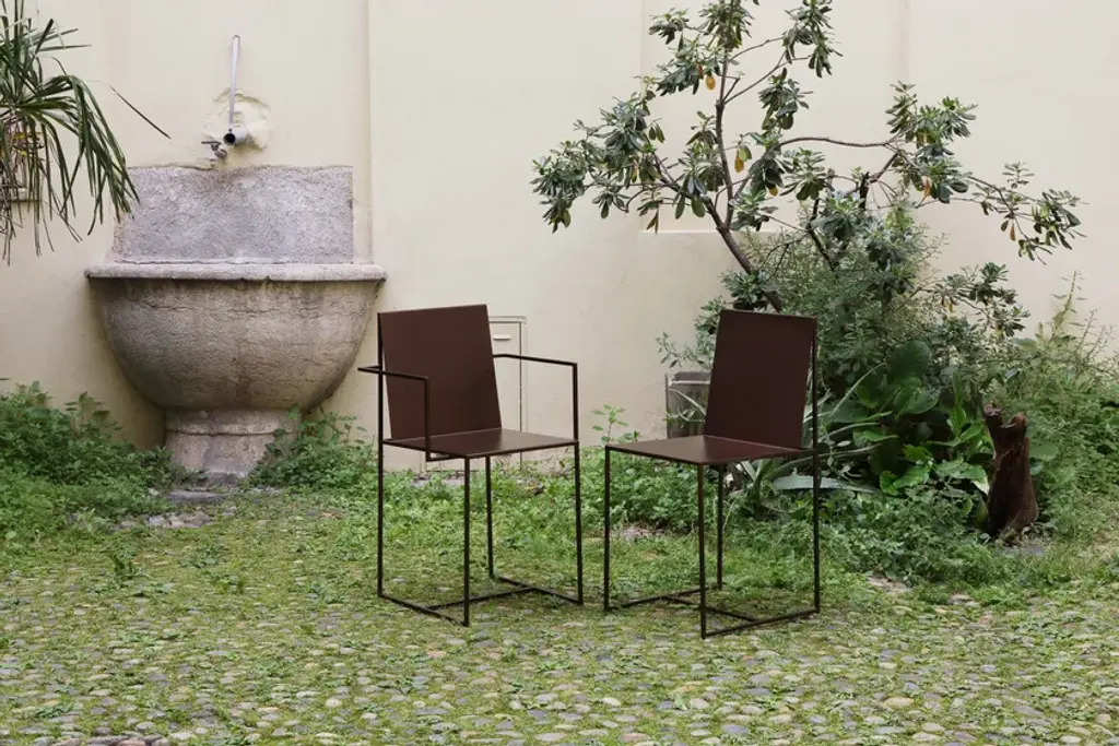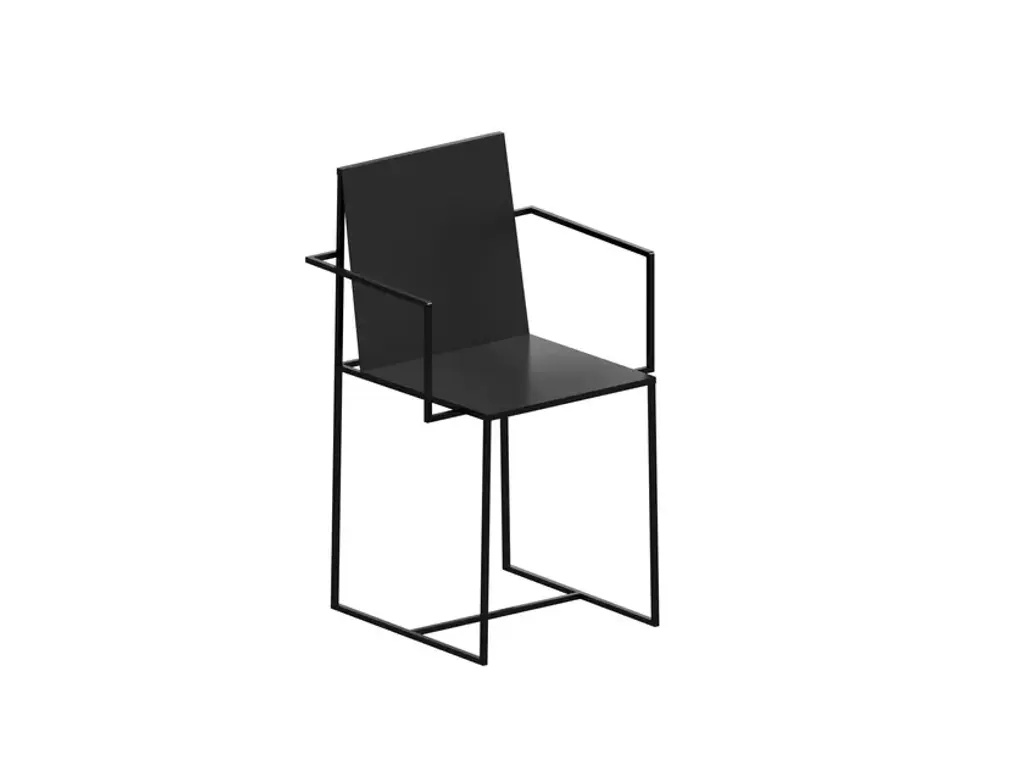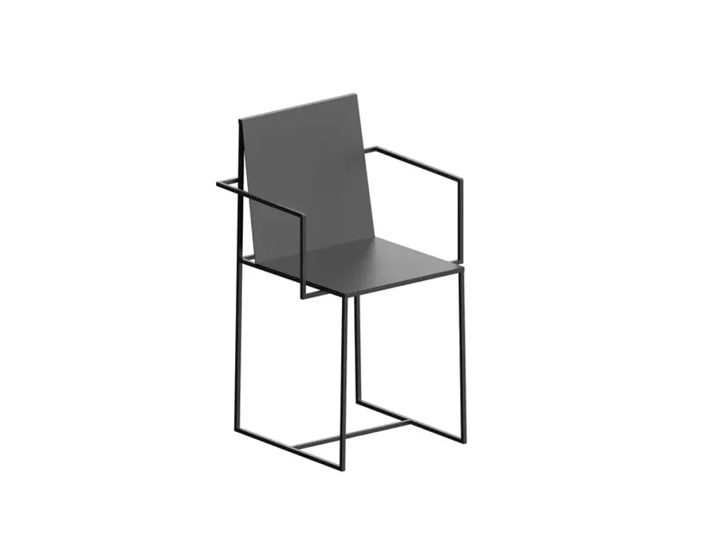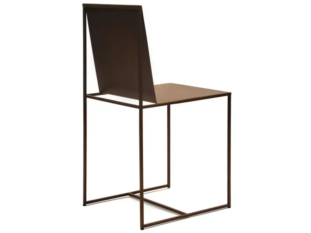 SLIM SISSI is a chair with armrests. Structure and armrests in 10 x 10 mm square tube. Seat and backrest in 1 mm thick steel sheet. Epoxy powder coating in black copper sable for indoor use or OUTDOOR version: outdoor treatment and polyester coating in rust embossed, white embossed, gunmetal gray, or new metallic brown color. Available with padded cushion, white or black faux leather cover, fixed with magnets.