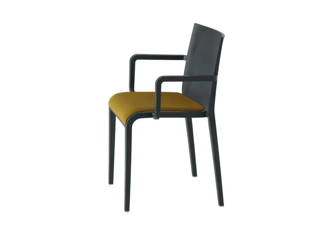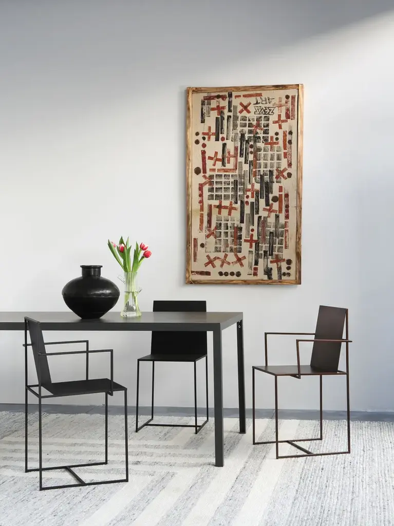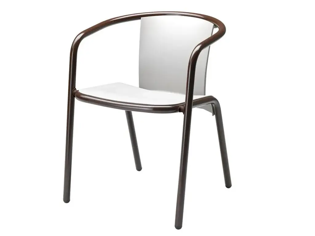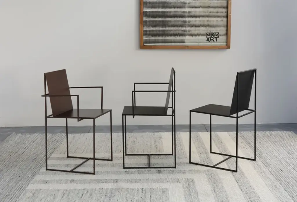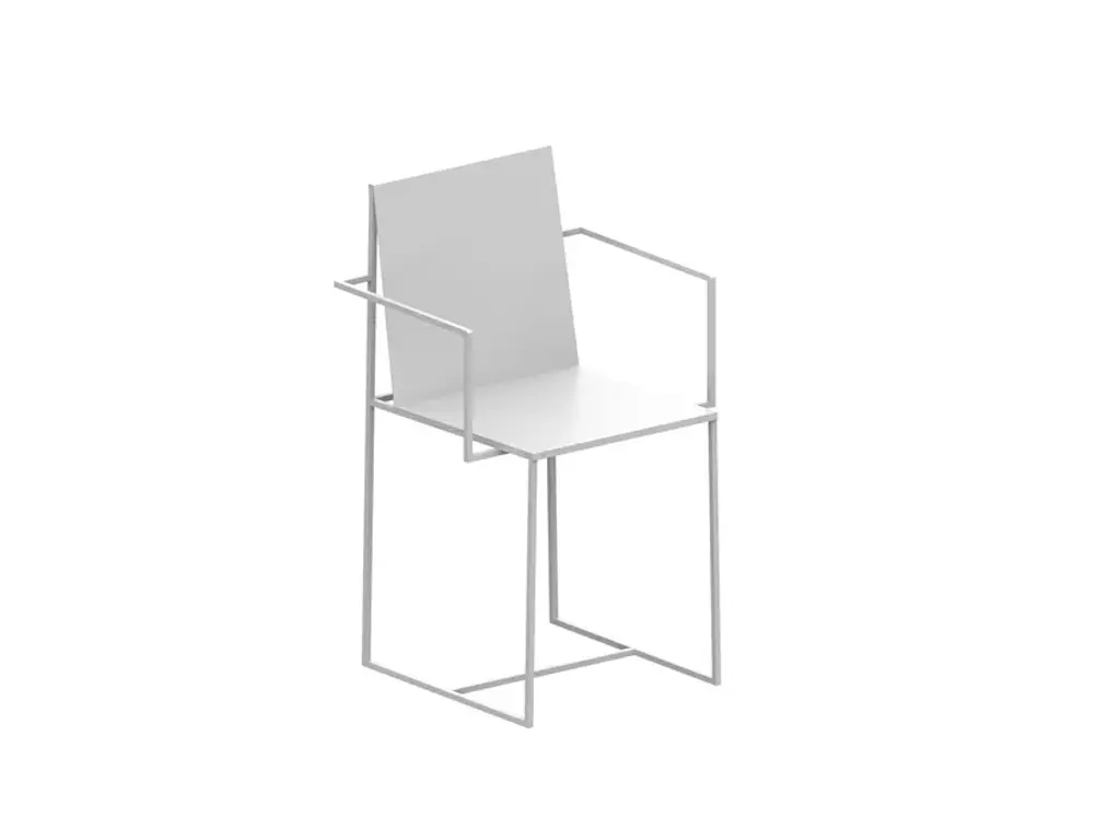 SLIM SISSI is a chair with armrests. Structure and armrests in 10 x 10 mm square tube. Seat and backrest in 1 mm thick steel sheet. Epoxy powder coating in black copper sable for indoor use or OUTDOOR version: outdoor treatment and polyester coating in rust embossed, white embossed, gunmetal gray, or new metallic brown color. Available with padded cushion, white or black faux leather cover, fixed with magnets.
