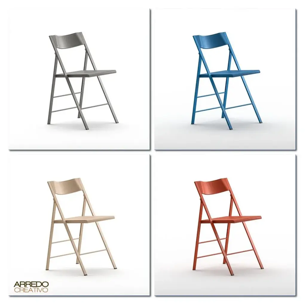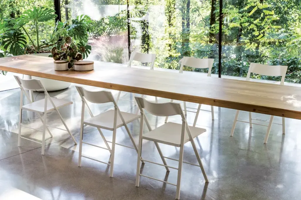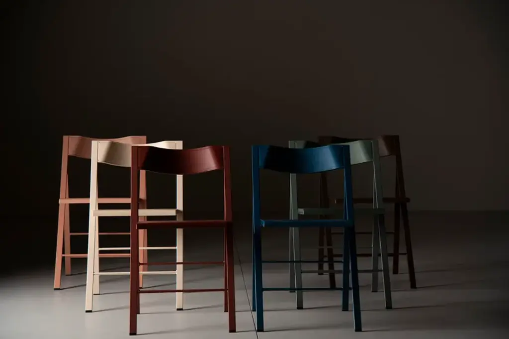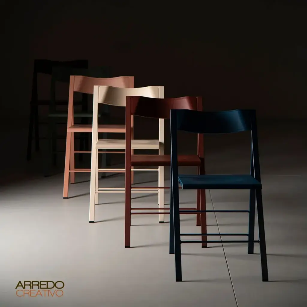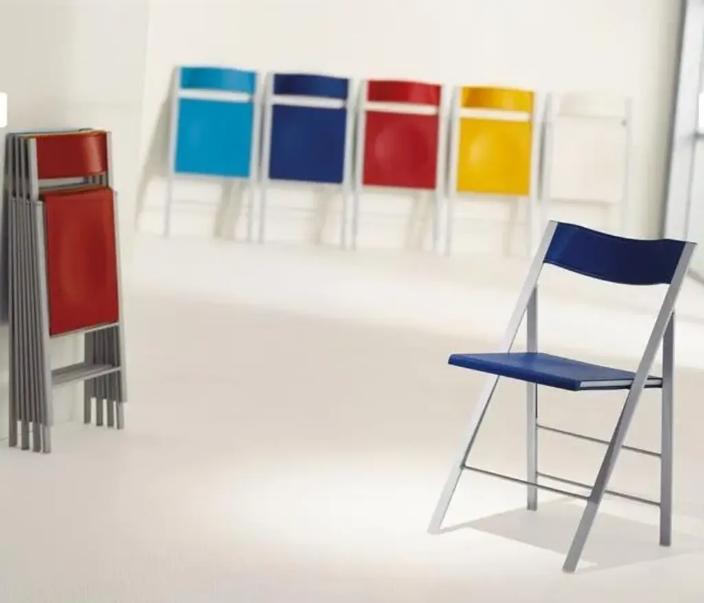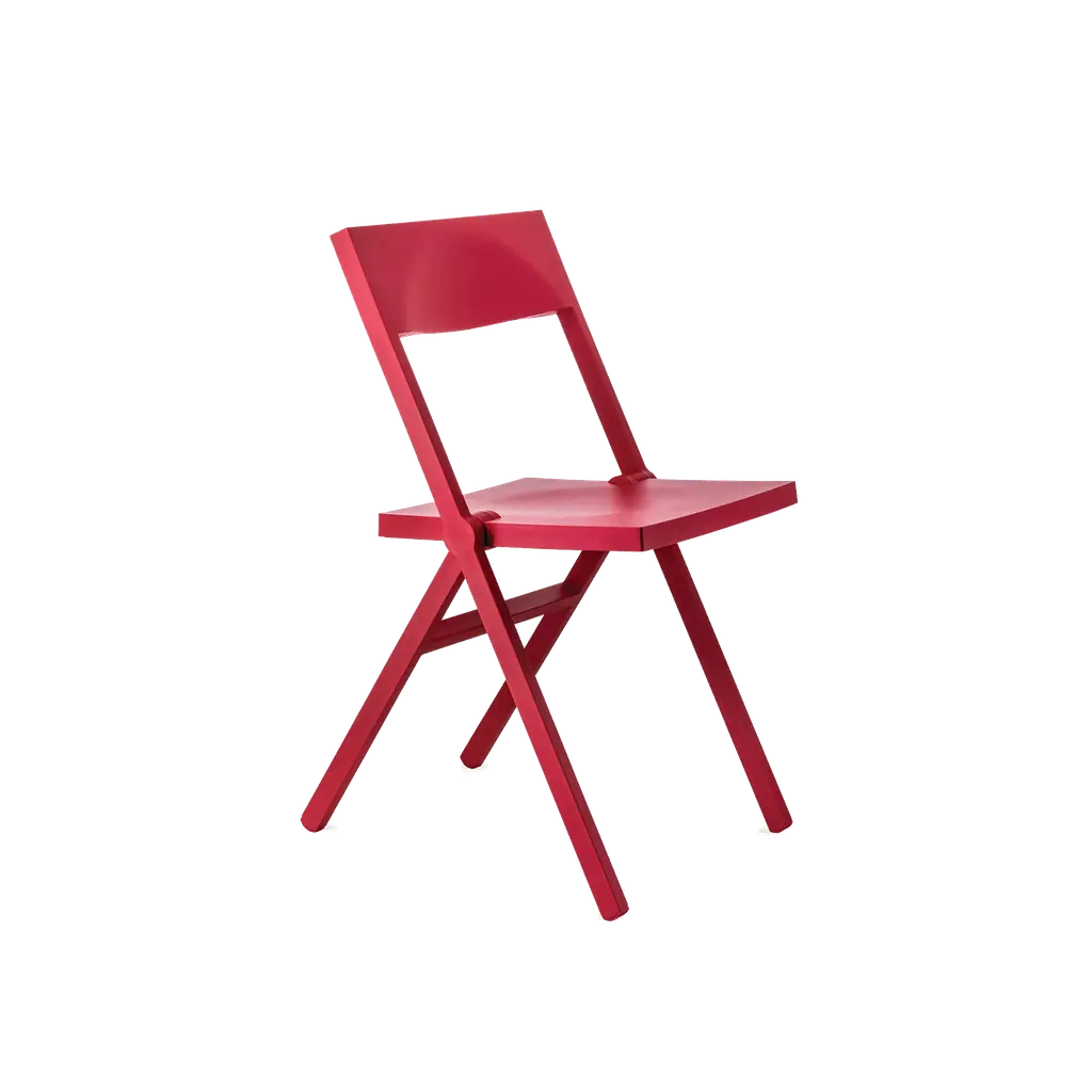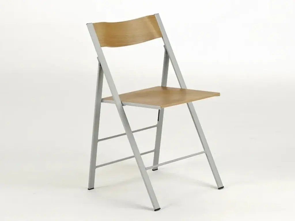 SLIM is the elegant and ultra-compact folding chair.Seat and backrest in beech or ash plywood in various finishes, the perfect match for MAYA fold-away tables.Its sturdy metal frame is available in multiple colors for original and refined combinations.SPACE-SAVINGUltra-thin yet extremely strong, it measures only 2 cm in depth when closed — a true space-saver, fully aligned with our smart home space-saving philosophy.With its 45 cm width, it allows full use of the length of MAYA fold-away tables.EXTREMELY STURDYSurprisingly stable and robust despite its minimal footprint, SLIM is as solid as a fixed chair.The use of plywood ensures excellent resistance and no flexing.It’s a real chair, with no risk of accidental folding or other typical folding chair issues, and it can comfortably support even heavy users.COMFORTABLEA chair must first and foremost be comfortable — something folding chairs often are not.SLIM’s backrest is shaped and angled to perfectly support the back, allowing a relaxed and comfortable posture. Its seat is wide and welcoming.EASY TO STOREThanks to its minimal thickness, the SLIM chair can be easily stored even in small spaces using the available accessories.Just a few centimeters are enough for the solid 2- or 4-chair wall mounts, allowing SLIM to be stored discreetly or visibly, behind a door or inside a cabinet.For larger quantities, a compact and handy metal trolley allows up to 12 SLIM chairs to be stored in the space of a single open chair.100% MADE IN ITALYEntirely designed and manufactured in Italy, with all components always available as spare parts if needed.