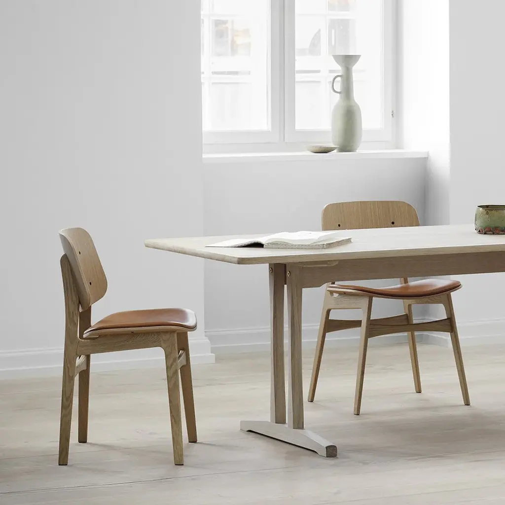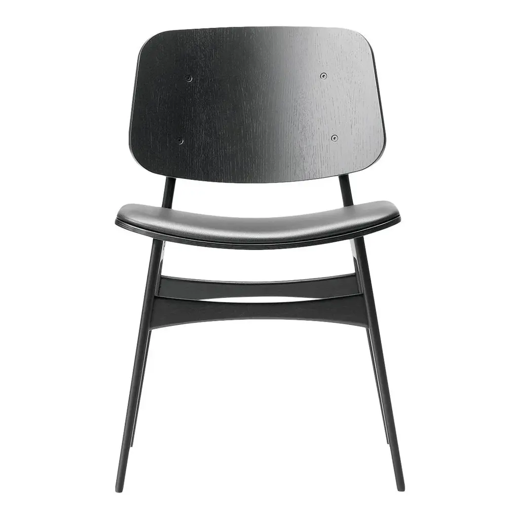 Mogensen presented the prototype for the Soborg chair in 1950. His intention was to fuse plywood shells with his signature solid wood functionalism. The generous back and seat with optional upholstery provides for many hours of use.