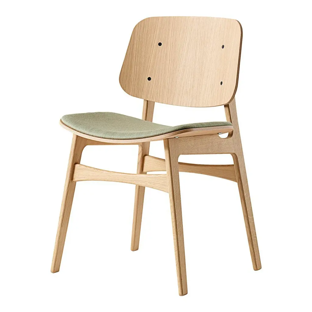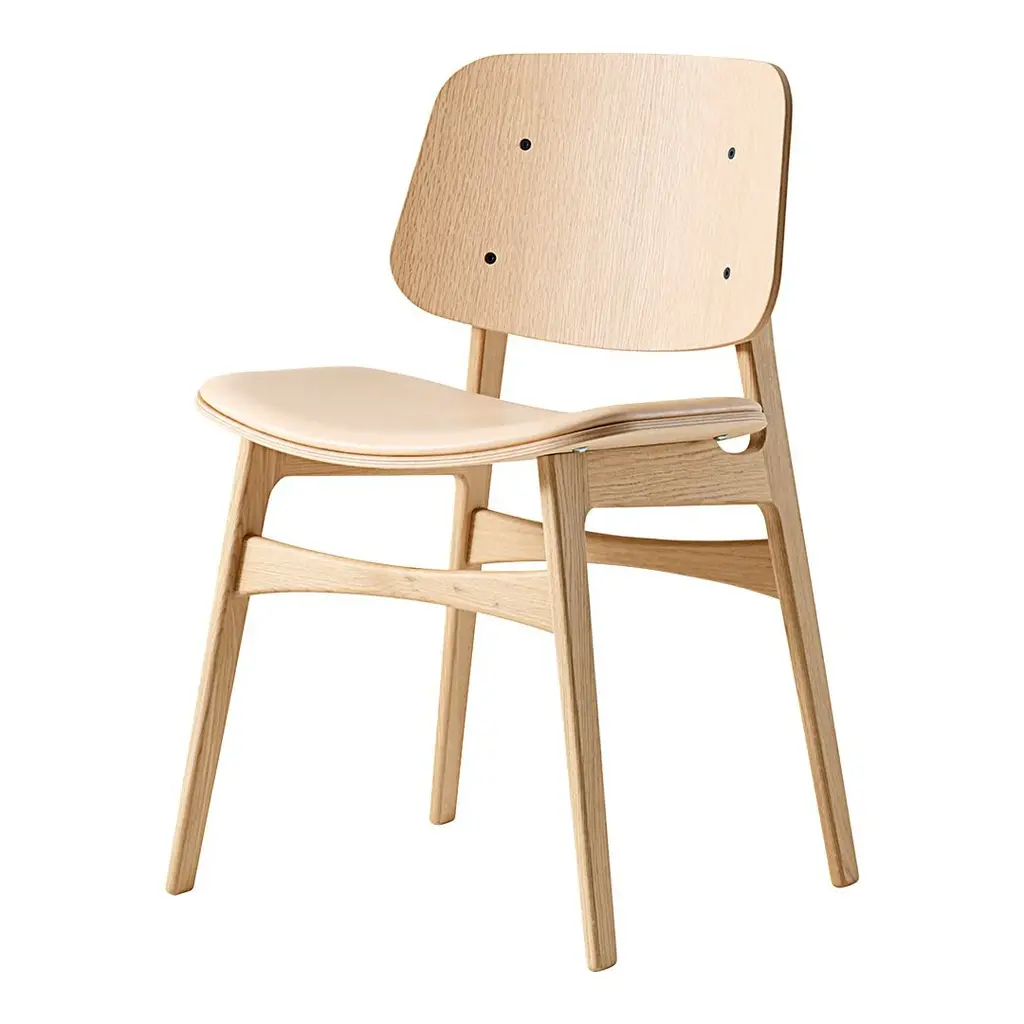 Mogensen presented the prototype for the Soborg chair in 1950. His intention was to fuse plywood shells with his signature solid wood functionalism. The generous back and seat with optional upholstery provides for many hours of use.