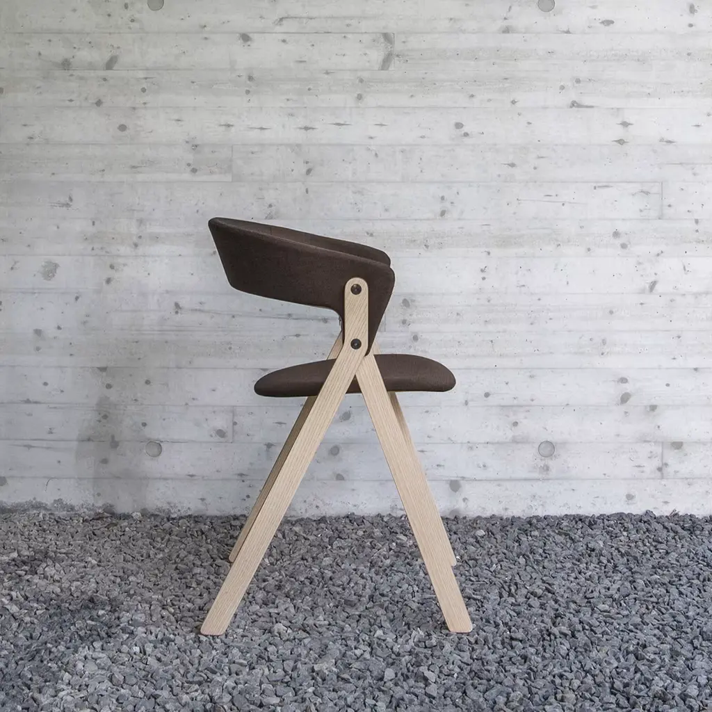 This Lorenz + Kaz chair transforms the traditional H-shape into a distinctive "A" profile. The backrest intersects the front and rear legs, creating a bold, angular form. Crafted from formaldehyde-free plywood and ash veneers, it combines precise geometry with seamless material flow. Featuring four bolts for easy component replacement and disassembly, it blends modern artistry with functional design. Crafted with natural ash with a Topia fabric seat by Rohi, it exemplifies elegance.