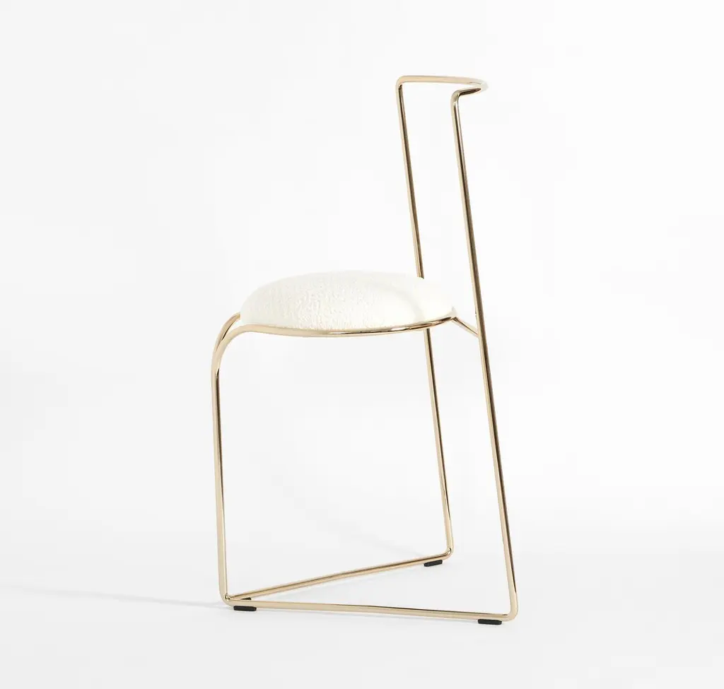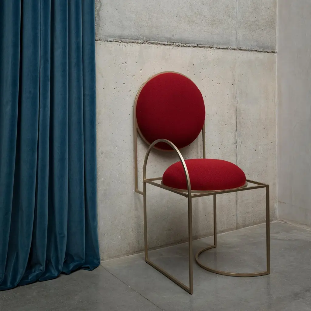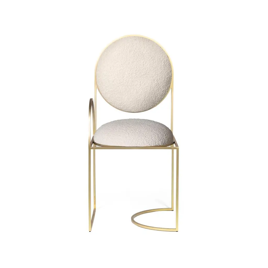 In this collection, Lara Bohinc develops her stellar themes, finding inspiration in planetary and lunar orbits, whose gravitationally curved trajectories drive the lines and shapes of the chairs. Constructed from thin square rod, the chairs are elegant, minimal and delicate.The Solar chair has an asymmetric frame and its reflecting circles suggest the rising and setting of the sun. It is constructed from playful lines that incorporates circles, half circles and squares.The chair is made from brushed brass and upholstered in Dedar bouclé wool and viscose fabric. Please note that even though brass is protected by clear varnish, it may still oxidase over the years which is a natural ageing process. The chair is made entirely by hand so slight imperfections are part of its charm.Each piece of furniture is individually numbered and comes with a signed "Certificate of Authenticity" to prove that it is Bohinc Studio original.Material: brushed brass and cream bouclé Dedar wool and viscose fabricDimensions: width 45cm, height 98cm, depth 55cmWeight: 14kg.
