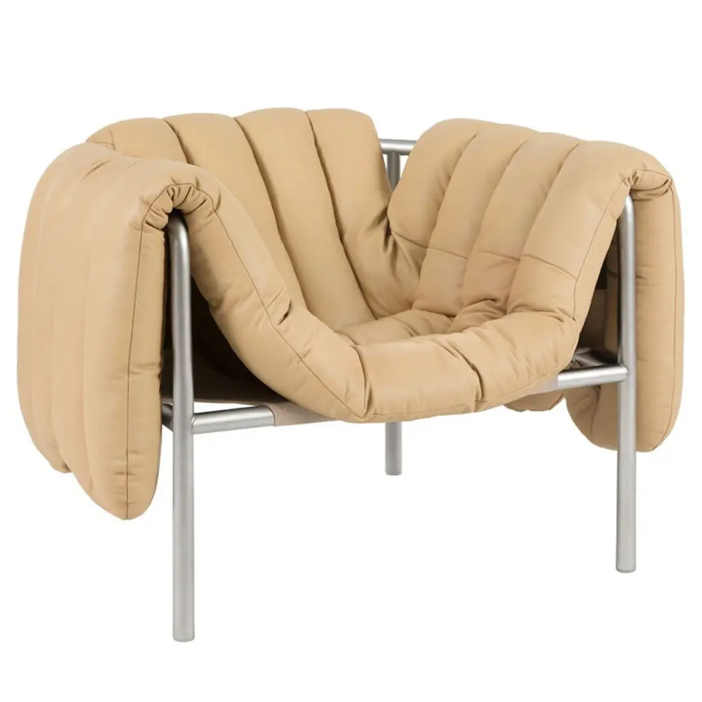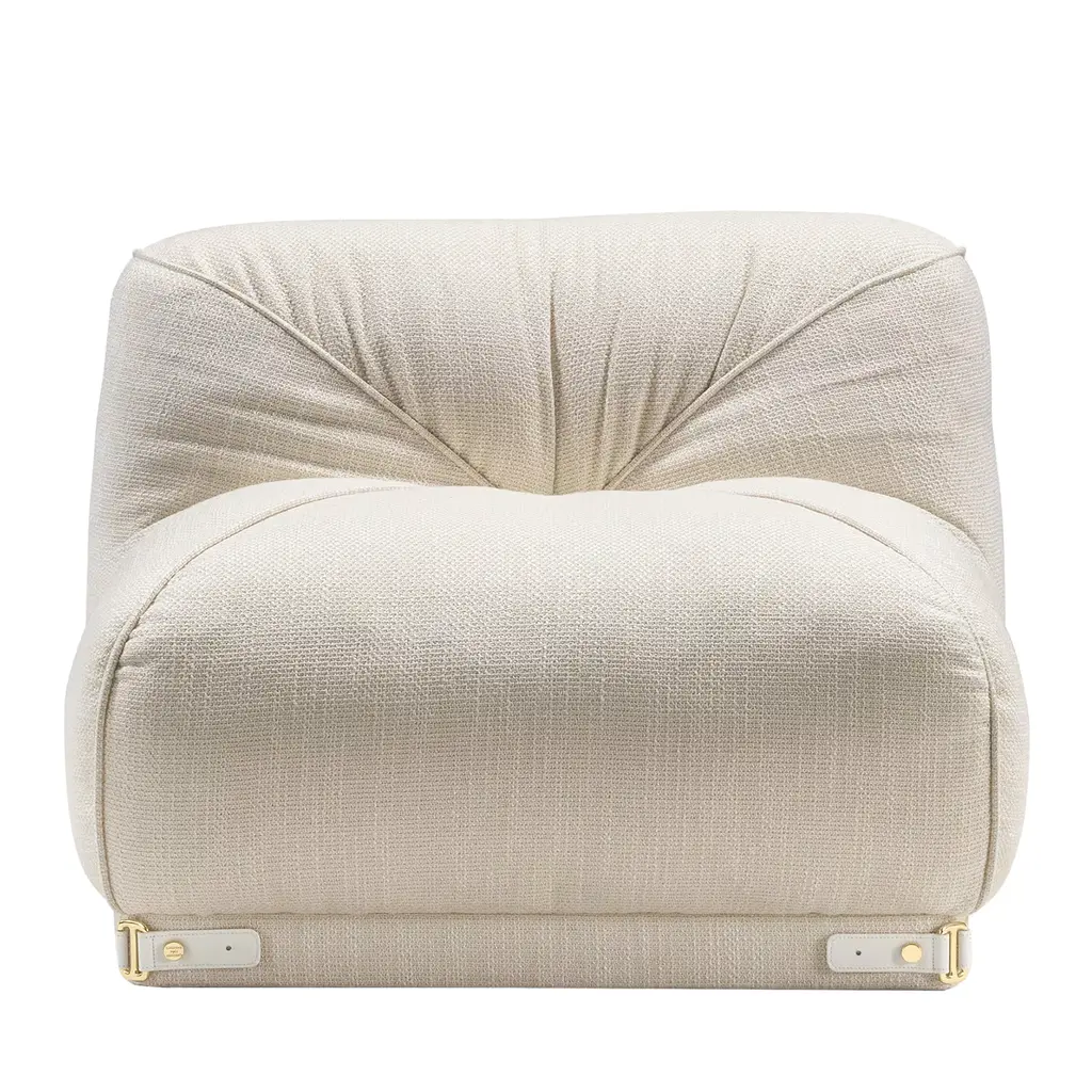 Italian husband-and-wife team Afra and Tobia Scarpa created the Soriana Armless Chair in 1969 and its distinctive silhouette shaped design history. Their ingenious use of polyurethane foam created a padded, pillowy, cloud-like cushion anchored firmly to the ground by a sculptural steel brace. There's a freedom in Soriana's shape - generous contours invite an uninhibited relaxation. The Scarpas' iconic design continues to revolutionize. Its internal padding is made from biodegradable BioFoam and 100% PET-blown fiber from Plastic Bank, an eco-social initiative that aims to stop plastic pollution. Choose from fabrics that complement the chair's free-flowing form and suit your space. Made in Italy.