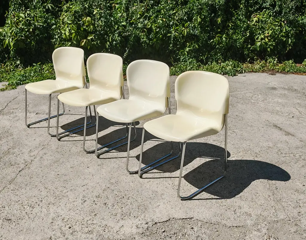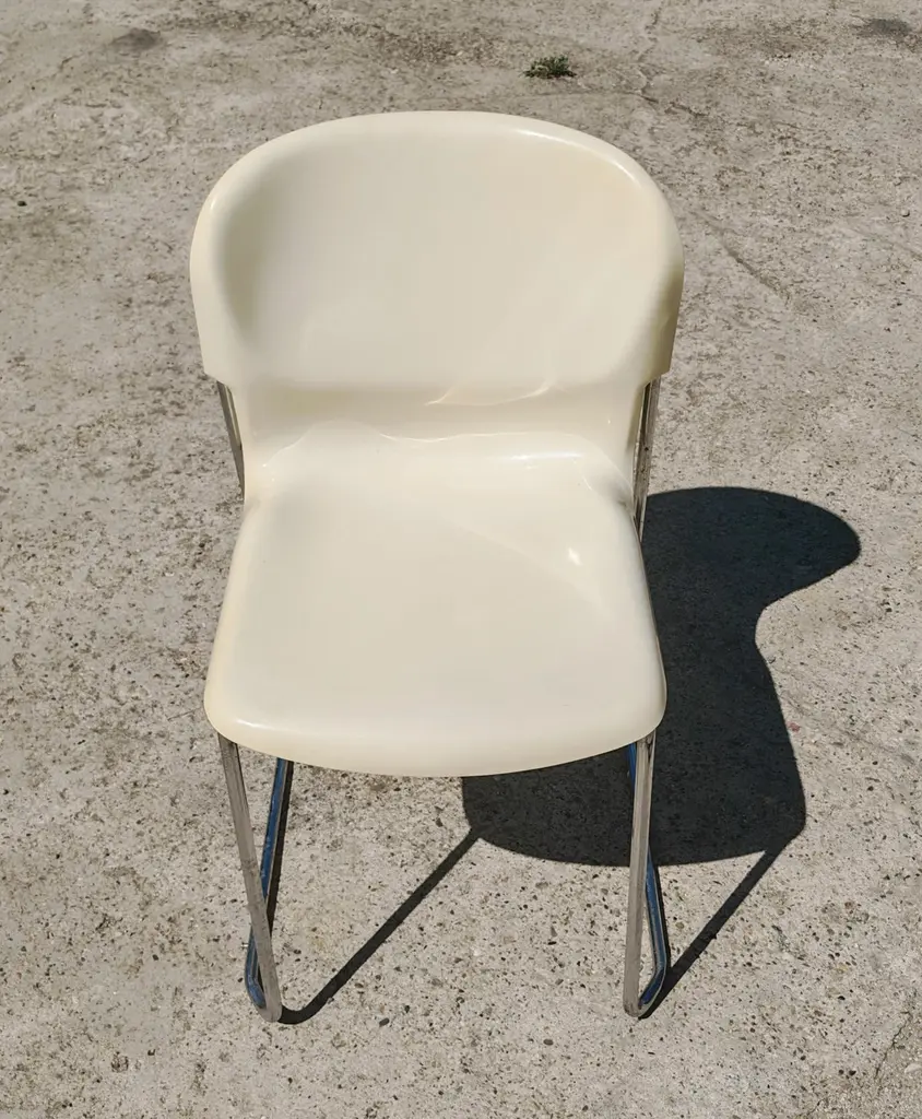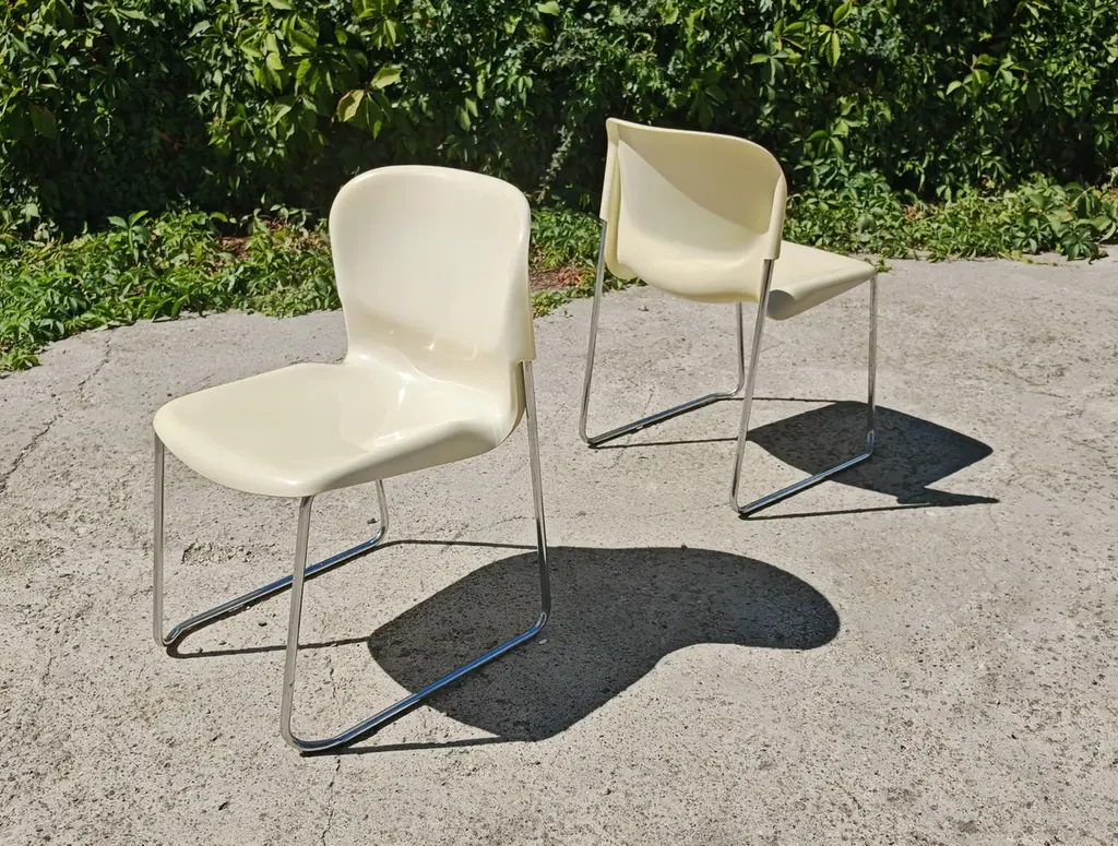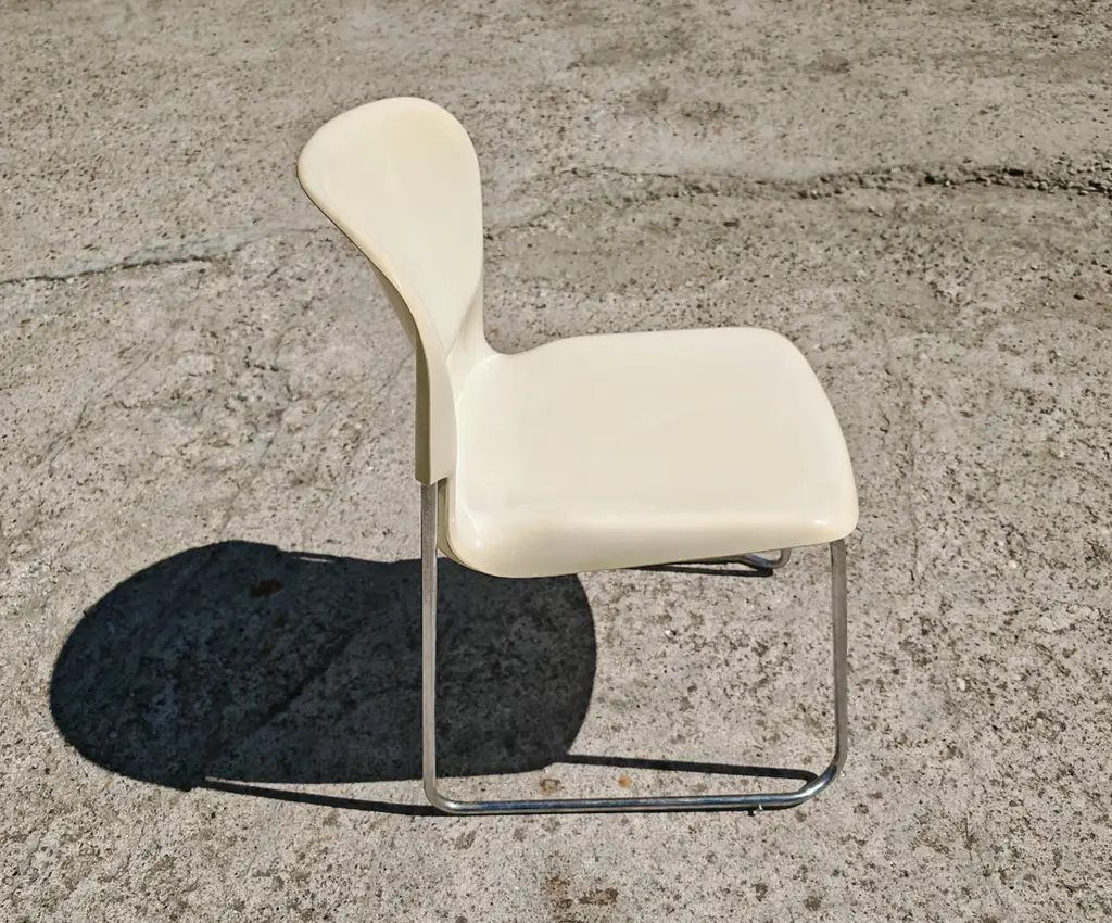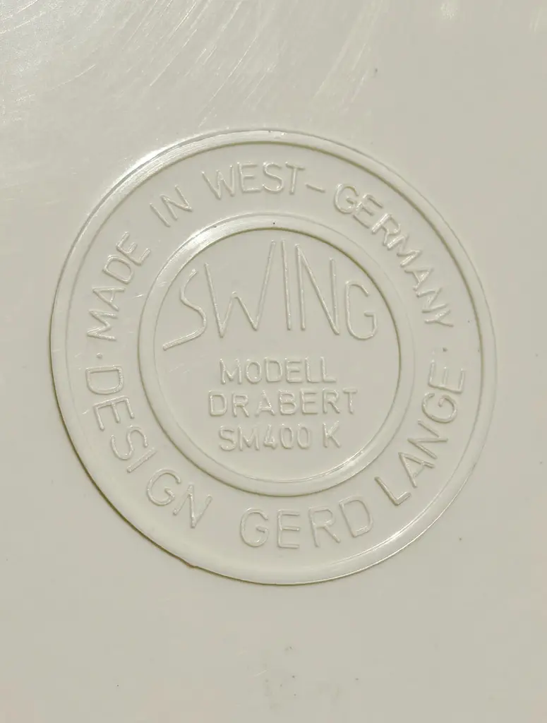 In this listing you will find Space Age Stackable Swing Chairs, Model SM400 K designed by Gerd Lange for Drabert. The chairs are done in off-white plastic, with the steel legs. The manufacturer's stamp is engraved in the back of the chairs, with the year of manufacture, please see the last picture. Made in West Germany in 1977.Chairs are sold per piece. There are 30 chairs available at the moment, some in better and some show signs of time and use, such as small dents, scratches and similar. Therefore the price is negotiable for the worn out ones.When purchased the chair will be carefully wrapped up and packed into individual boxes before getting shipped. When shipped, you will receive the tracking number for your package. If you have any additional questions regarding this piece please feel free to contact me. Happy shopping!