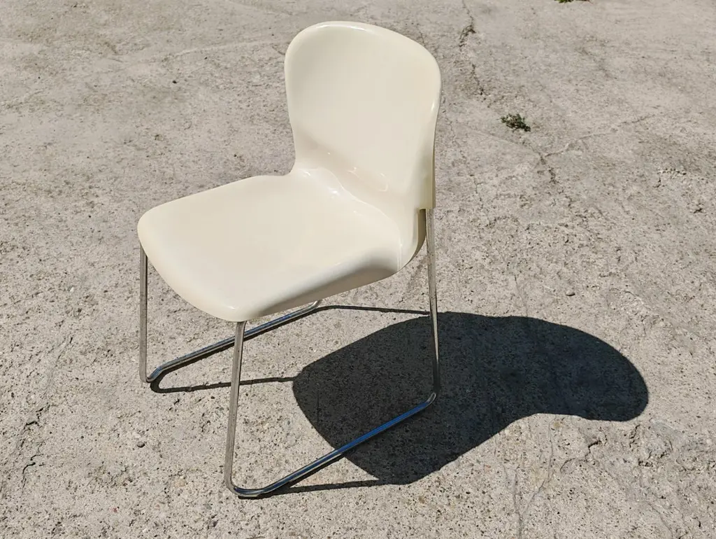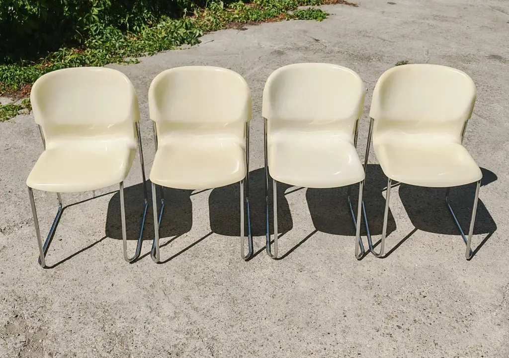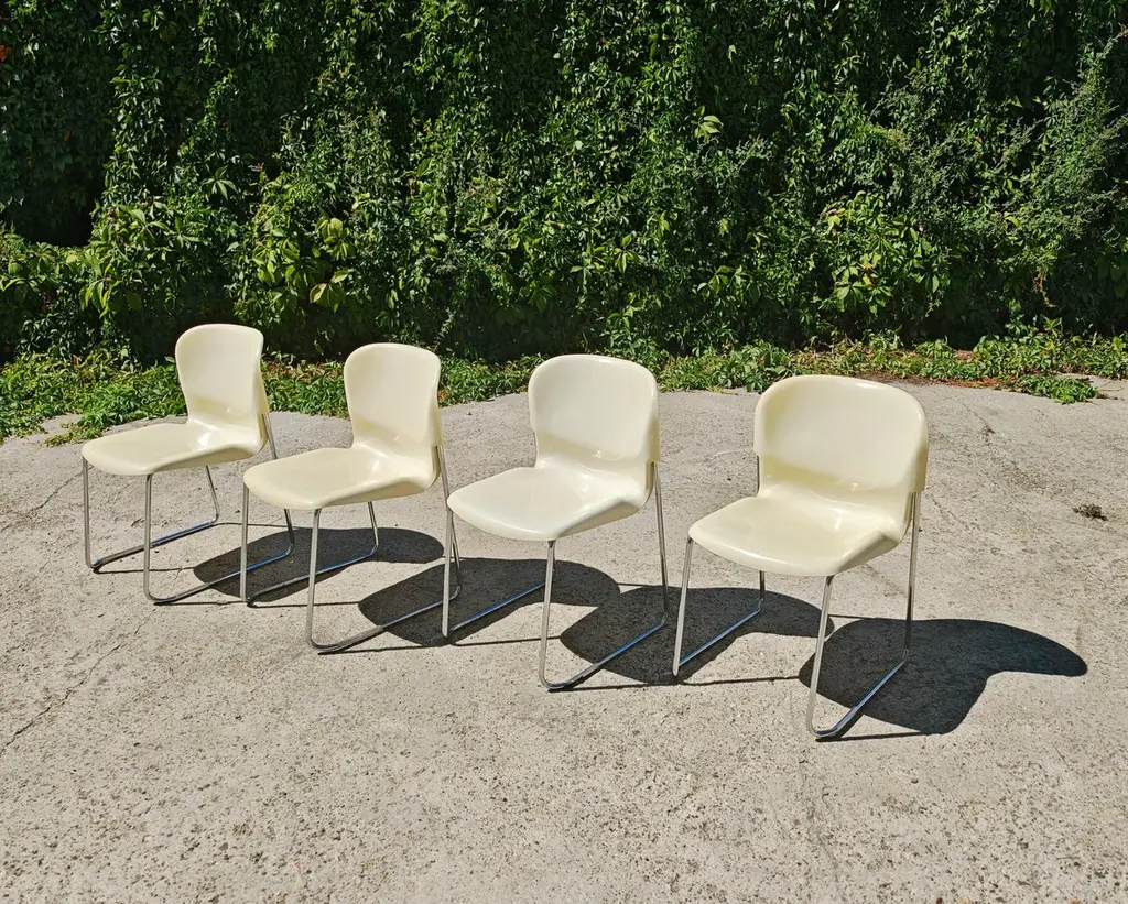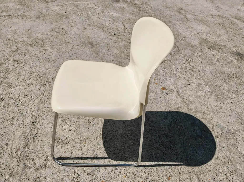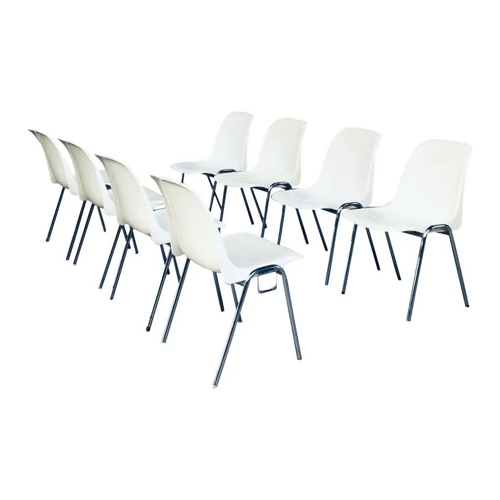 In this listing you will find Space Age Stackable Swing Chairs, Model SM400 K designed by Gerd Lange for Drabert. The chairs are done in off-white plastic, with the steel legs. The manufacturer's stamp is engraved in the back of the chairs, with the year of manufacture, please see the last picture. Made in West Germany in 1977.Chairs are sold per piece. There are 30 chairs available at the moment, some in better and some show signs of time and use, such as small dents, scratches and similar. Therefore the price is negotiable for the worn out ones.When purchased the chair will be carefully wrapped up and packed into individual boxes before getting shipped. When shipped, you will receive the tracking number for your package. If you have any additional questions regarding this piece please feel free to contact me. Happy shopping!