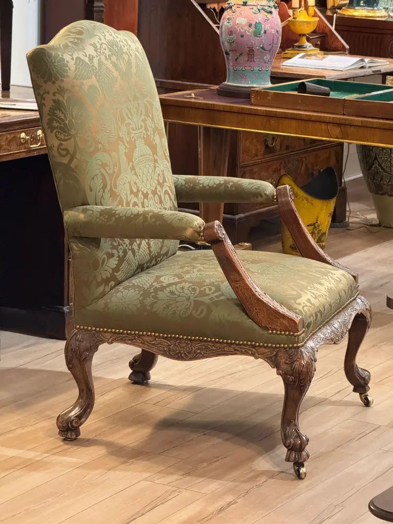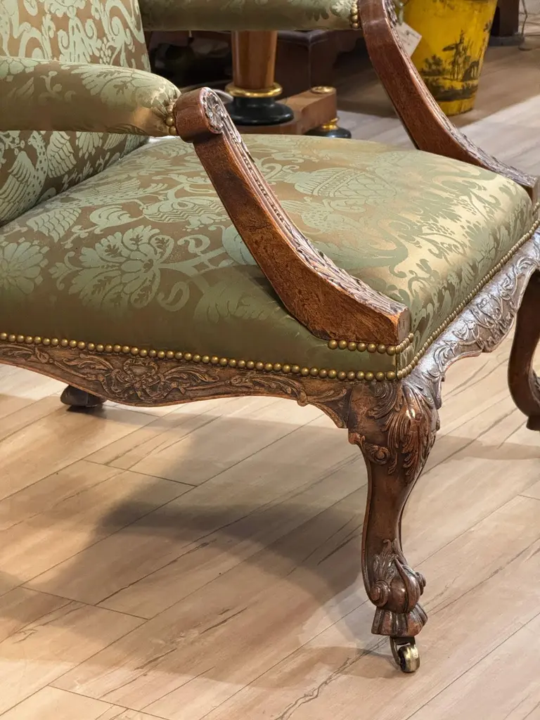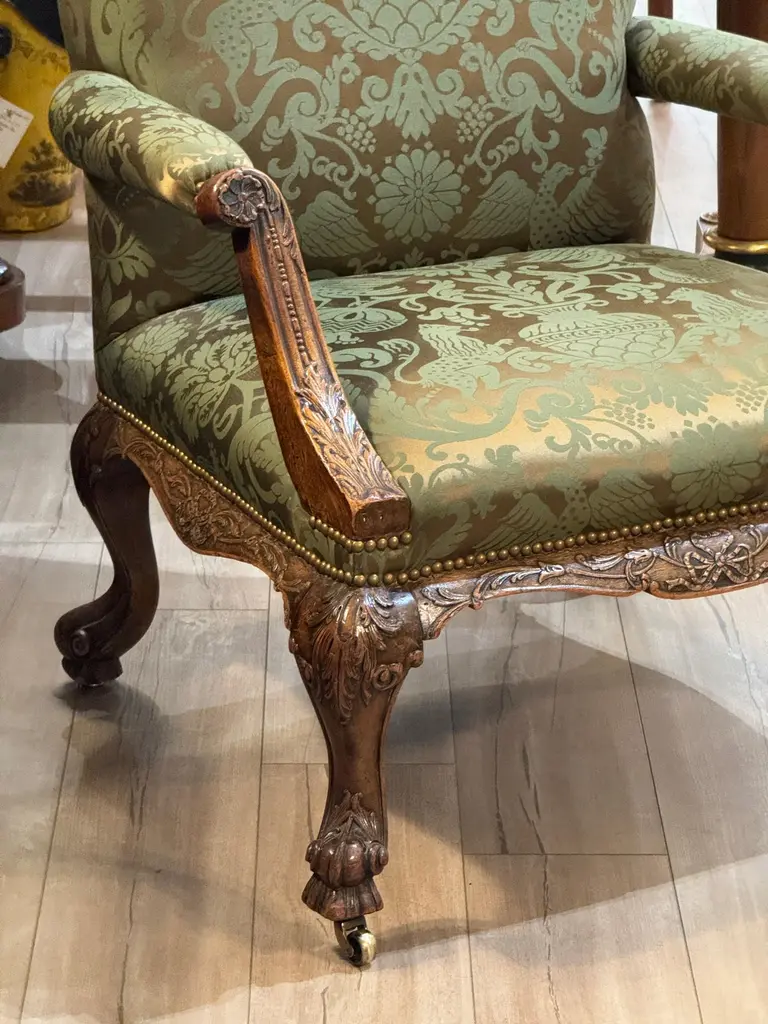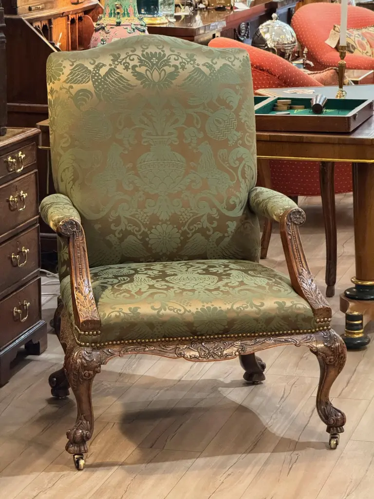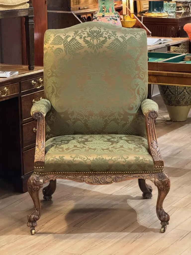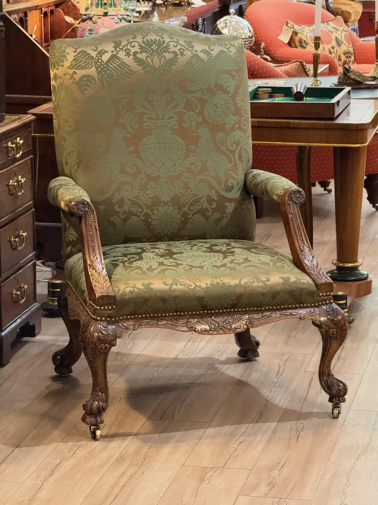 This mid-18th century library chair features deeply carved mahogany with acanthus motifs, scroll arms, and cabriole legs on casters. The rich green damask upholstery is finished with brass nailhead trim, highlighting the chair’s refined Georgian character.