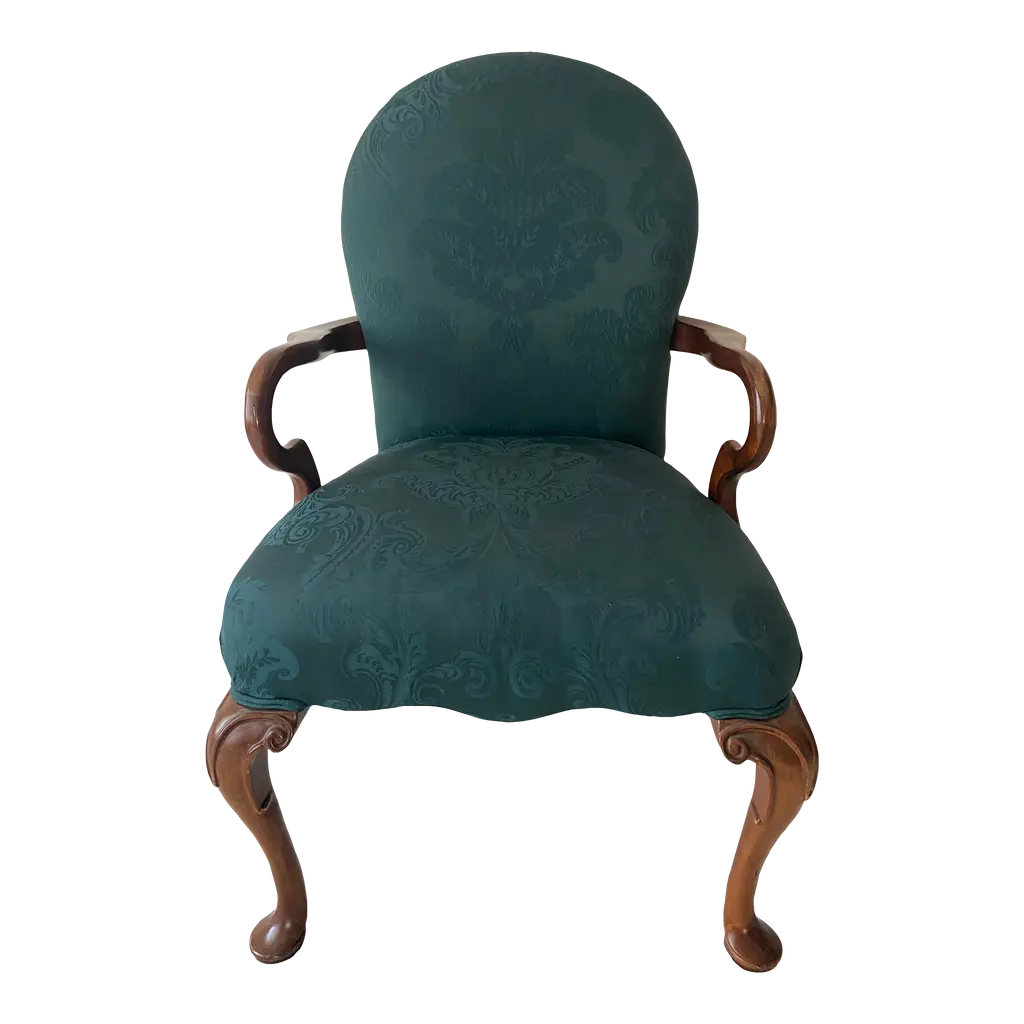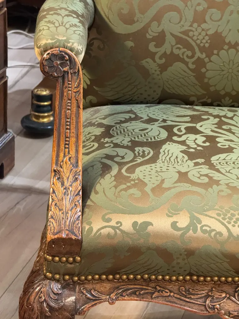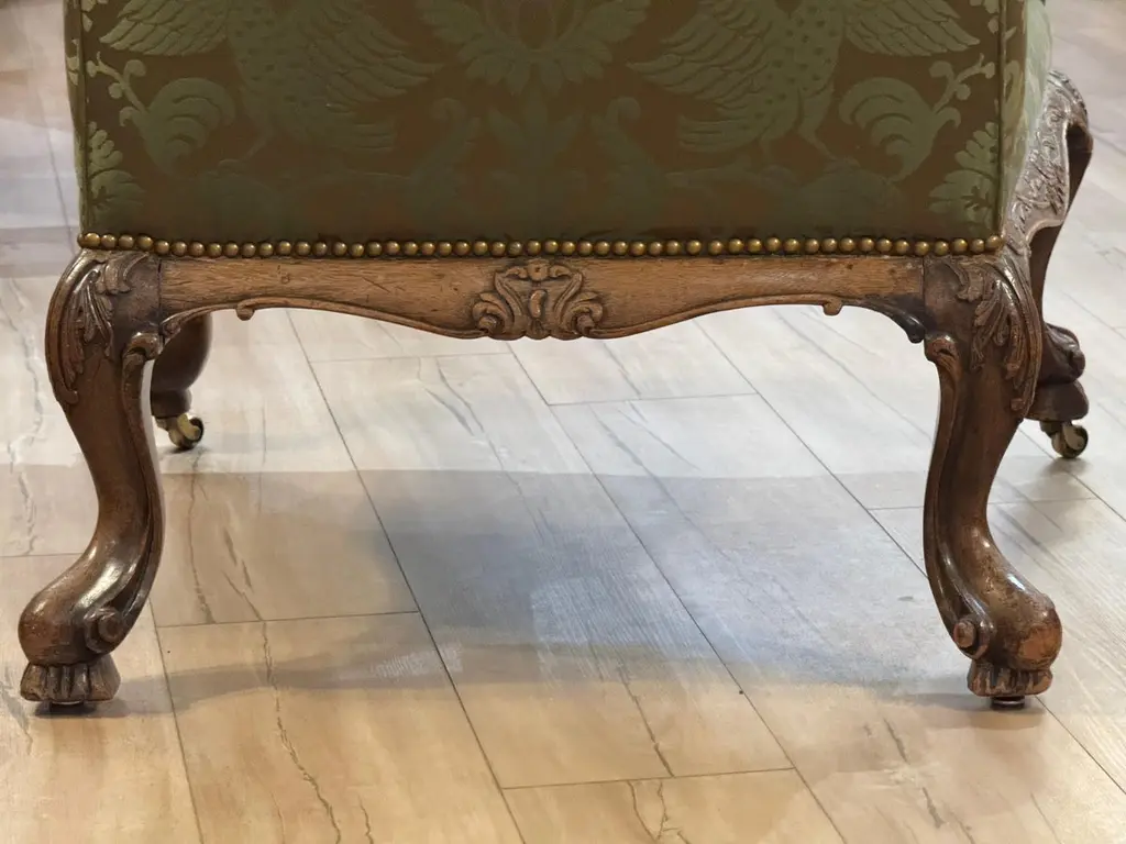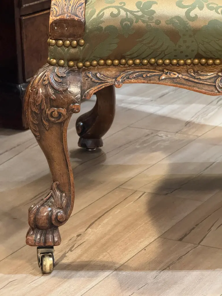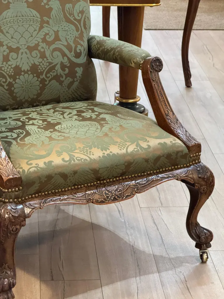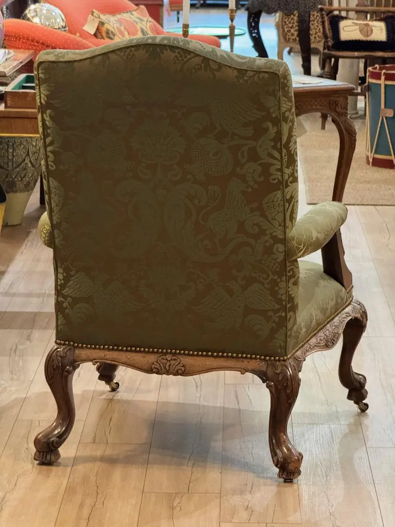 This mid-18th century library chair features deeply carved mahogany with acanthus motifs, scroll arms, and cabriole legs on casters. The rich green damask upholstery is finished with brass nailhead trim, highlighting the chair’s refined Georgian character.