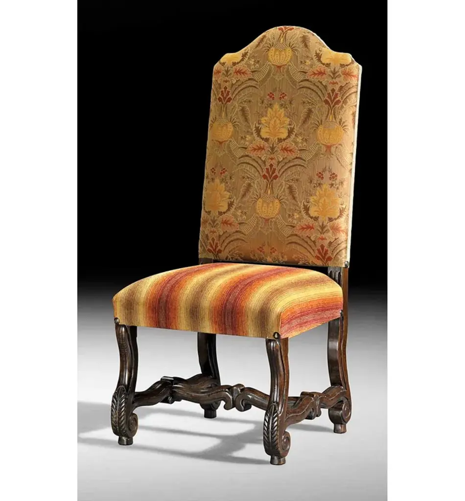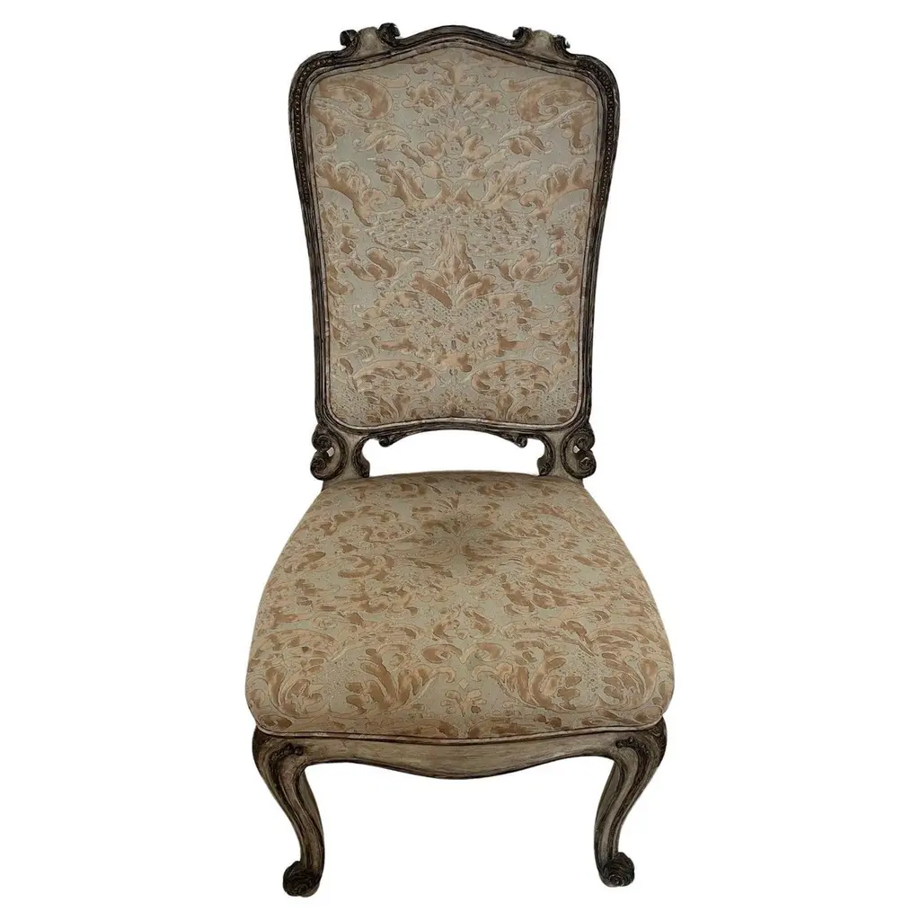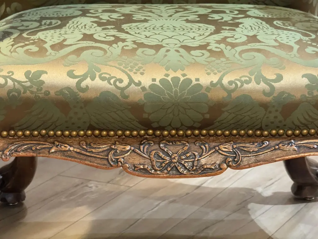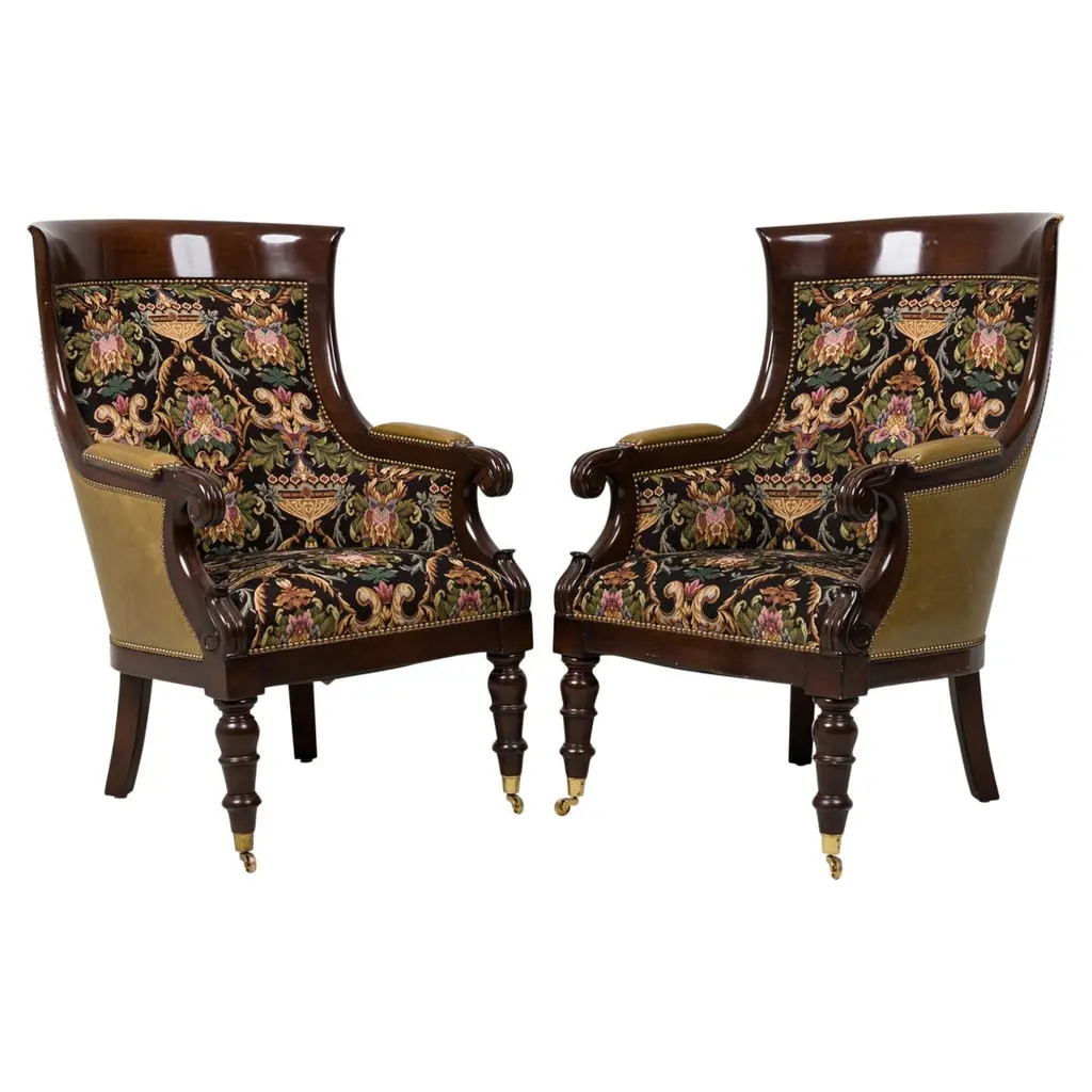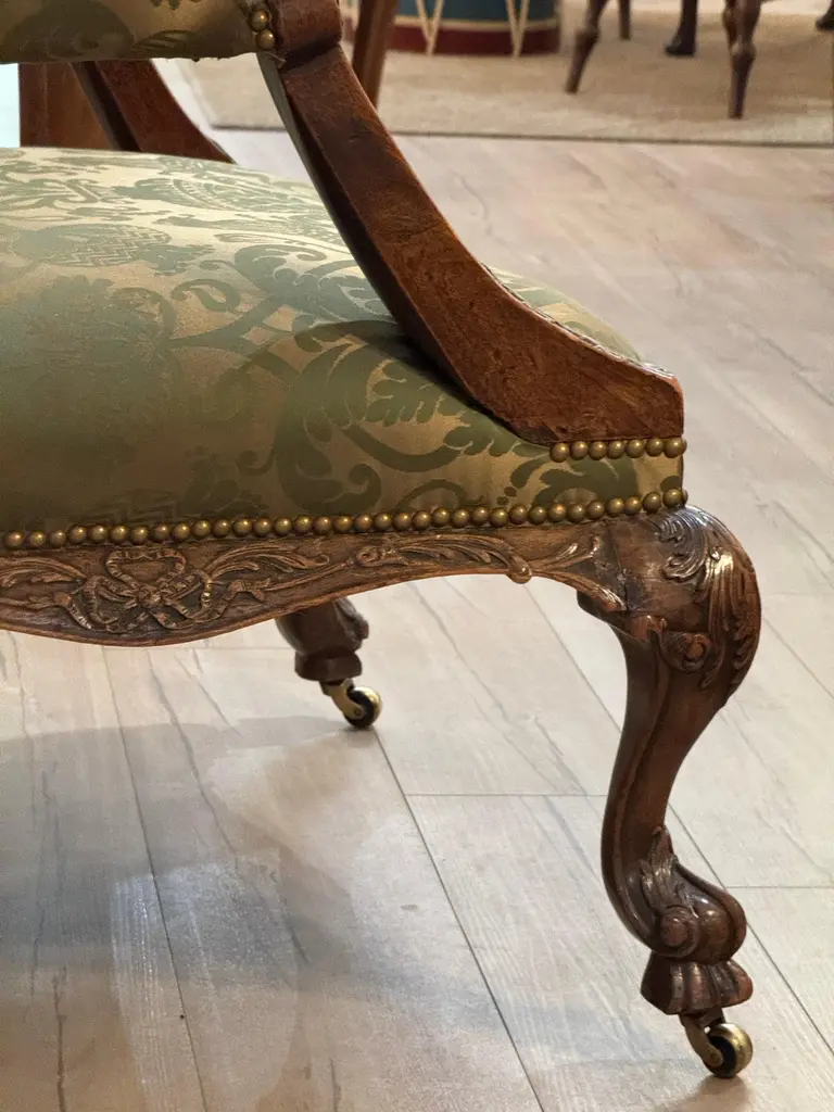 This mid-18th century library chair features deeply carved mahogany with acanthus motifs, scroll arms, and cabriole legs on casters. The rich green damask upholstery is finished with brass nailhead trim, highlighting the chair’s refined Georgian character.