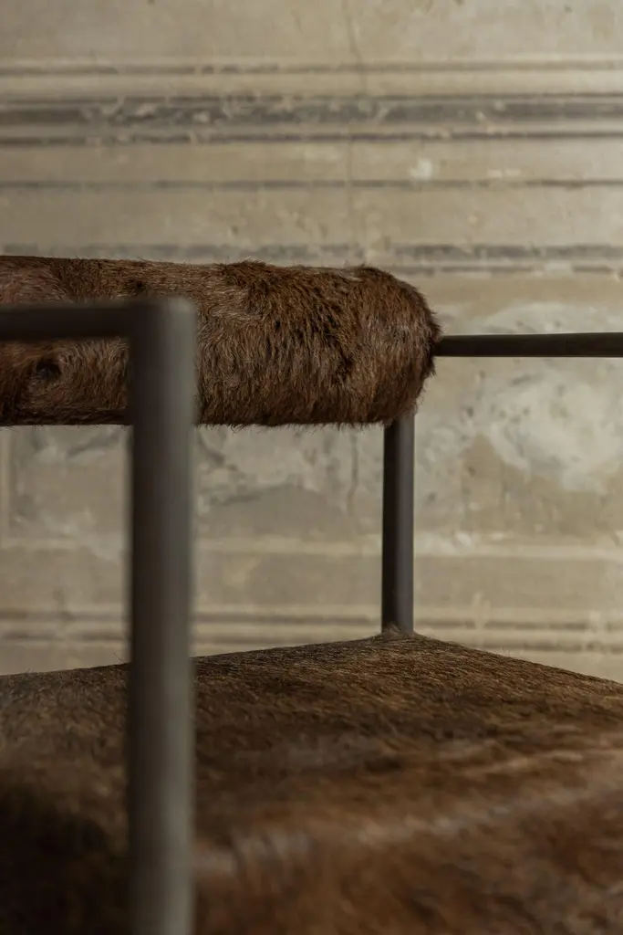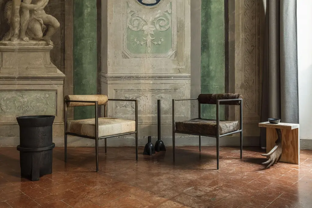 Square alchemy chair by Rick OwensDimensions: L 60 x W 60 x H 81 cmMaterials: Bronze, camel skinWeight: 43 kgAvailable in both light and dark color.Rick Owens is a California-born fashion and furniture has developed a unique style that he describes as “luxe minimalism.”Though his designs are simple and spare, Owens thrives on theatricality - producing wildly original runway shows featuring gender-fluid models of all ages and shapes. Inspired by his longtime partner and muse, Michele Lamy, clothes and furniture alike feature dark grays, blacks and browns. Like his frontier forebears, Owens finds his strongest influences in nature - his furniture and housewares have simple, organic shapes, and a few items even feature his distinctly 21st-century take on antlers.