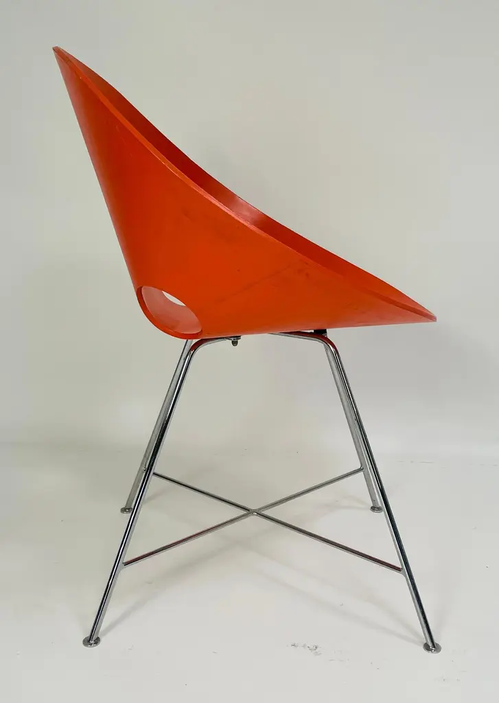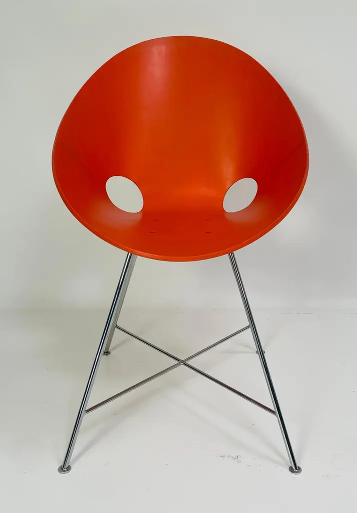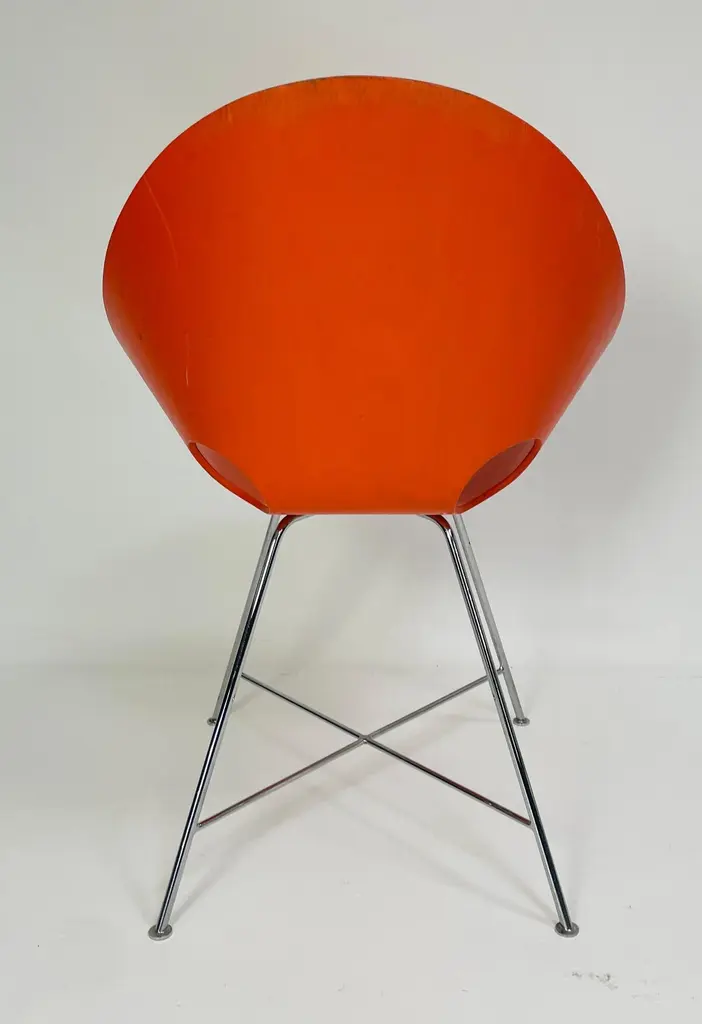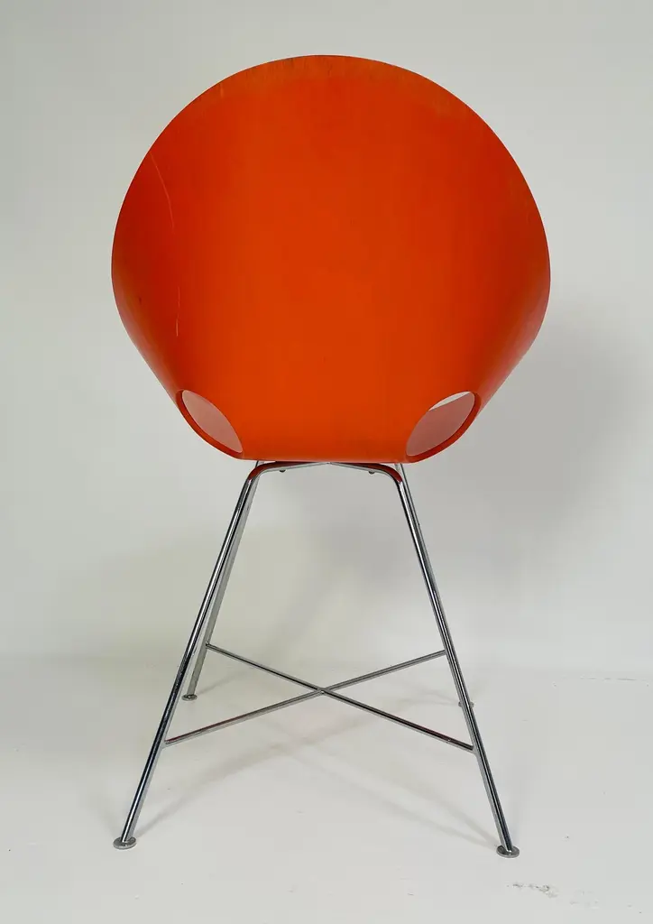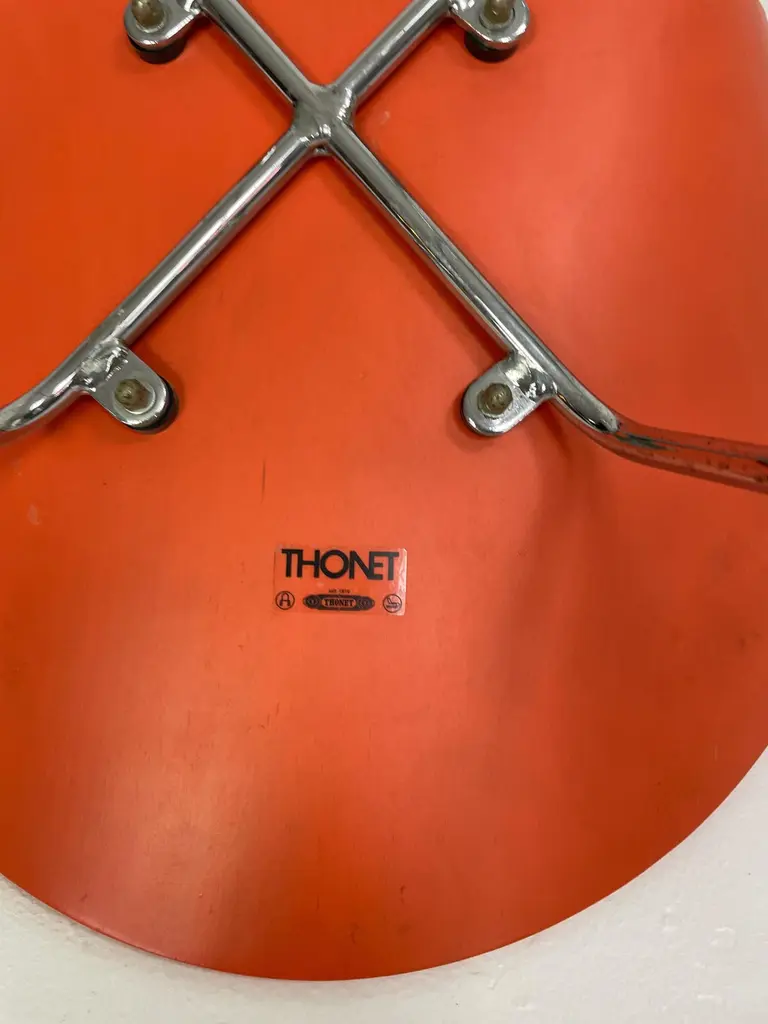 The ST 664 chair designed by Eddie Harlis in 1954. Thonet manufactured the chairs in Germany. These chairs are no longer produced. The chair has an orange painted finish and are made from bent plywood (beech). The legs are chromed steel. In good condition.