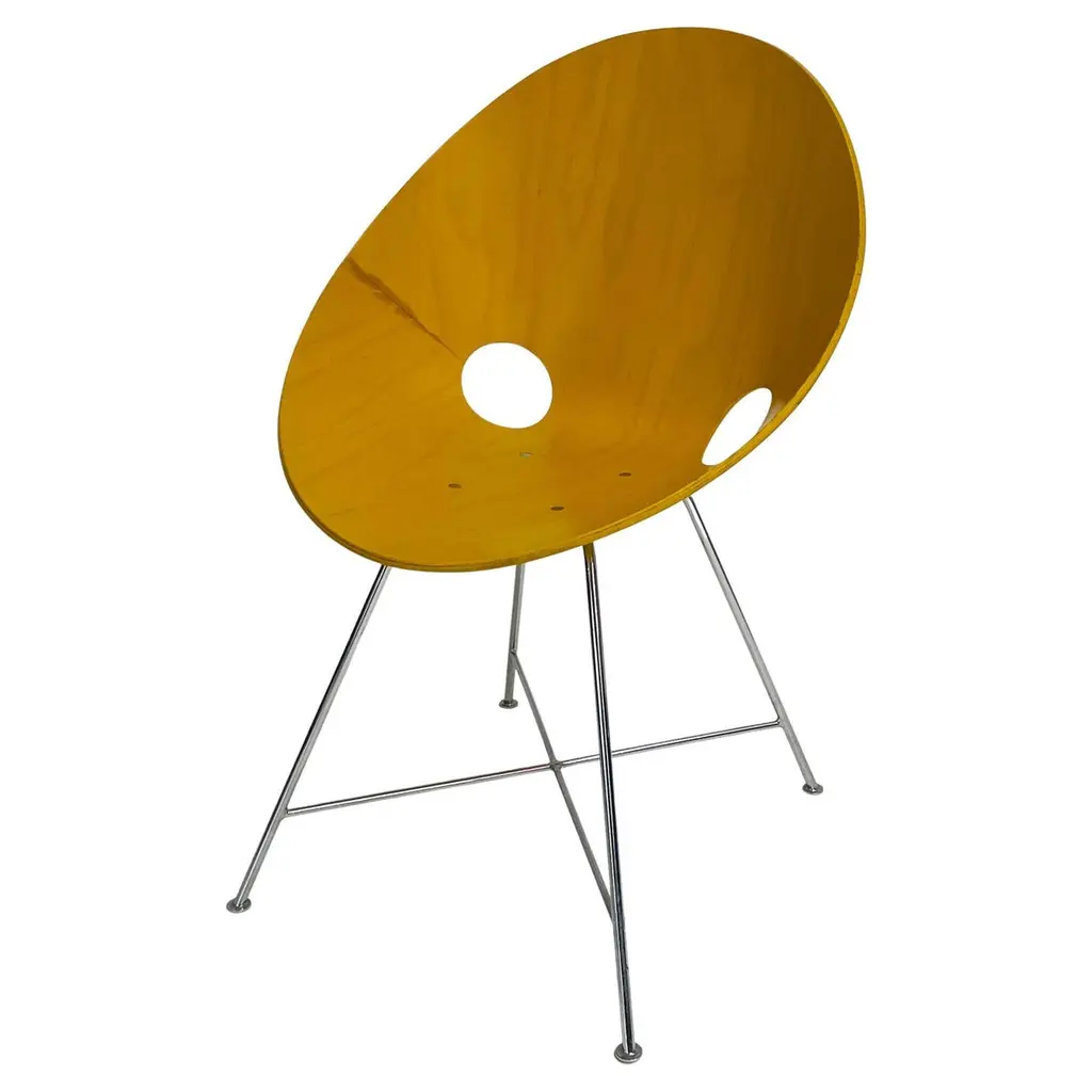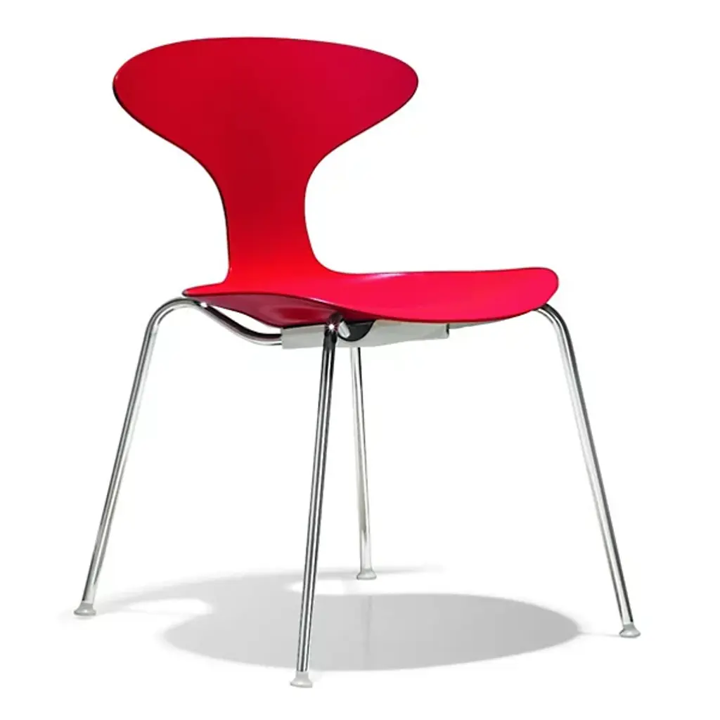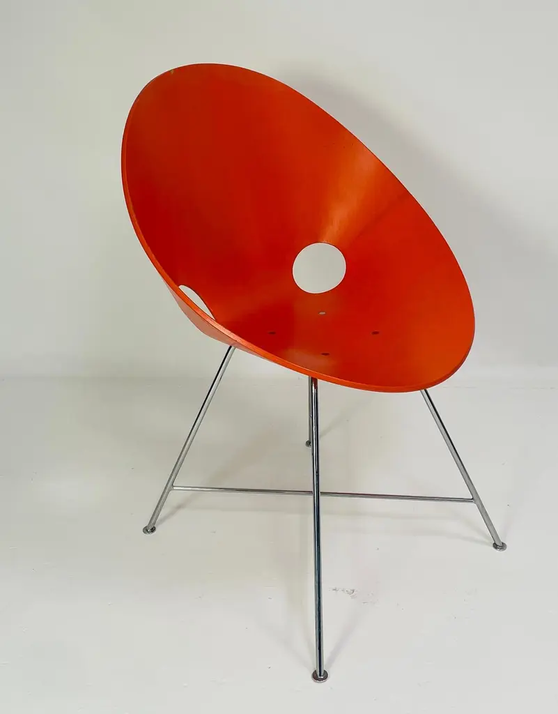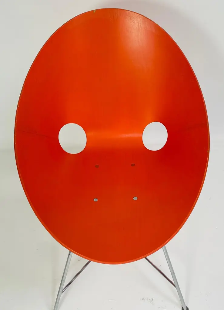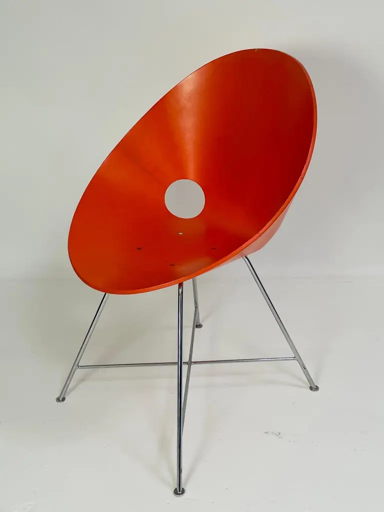 The ST 664 chair designed by Eddie Harlis in 1954. Thonet manufactured the chairs in Germany. These chairs are no longer produced. The chair has an orange painted finish and are made from bent plywood (beech). The legs are chromed steel. In good condition.