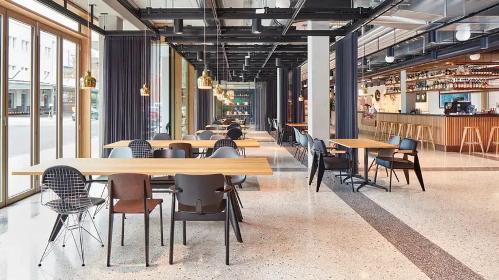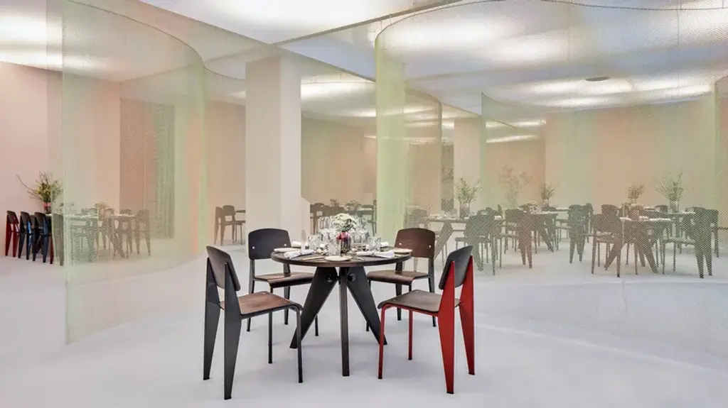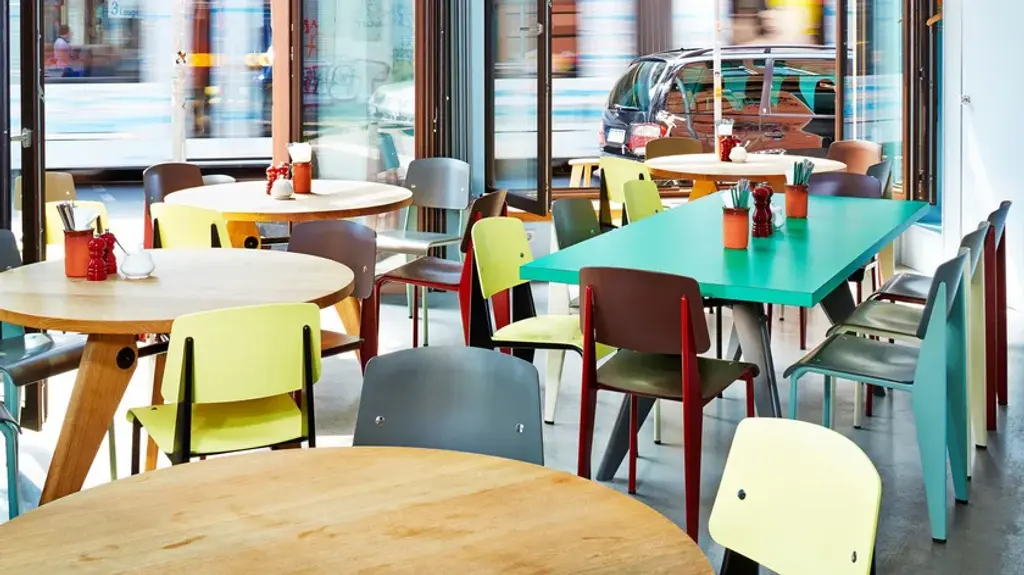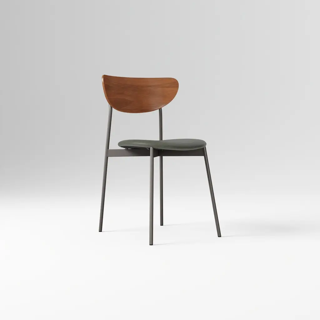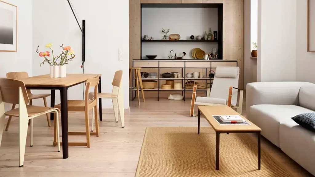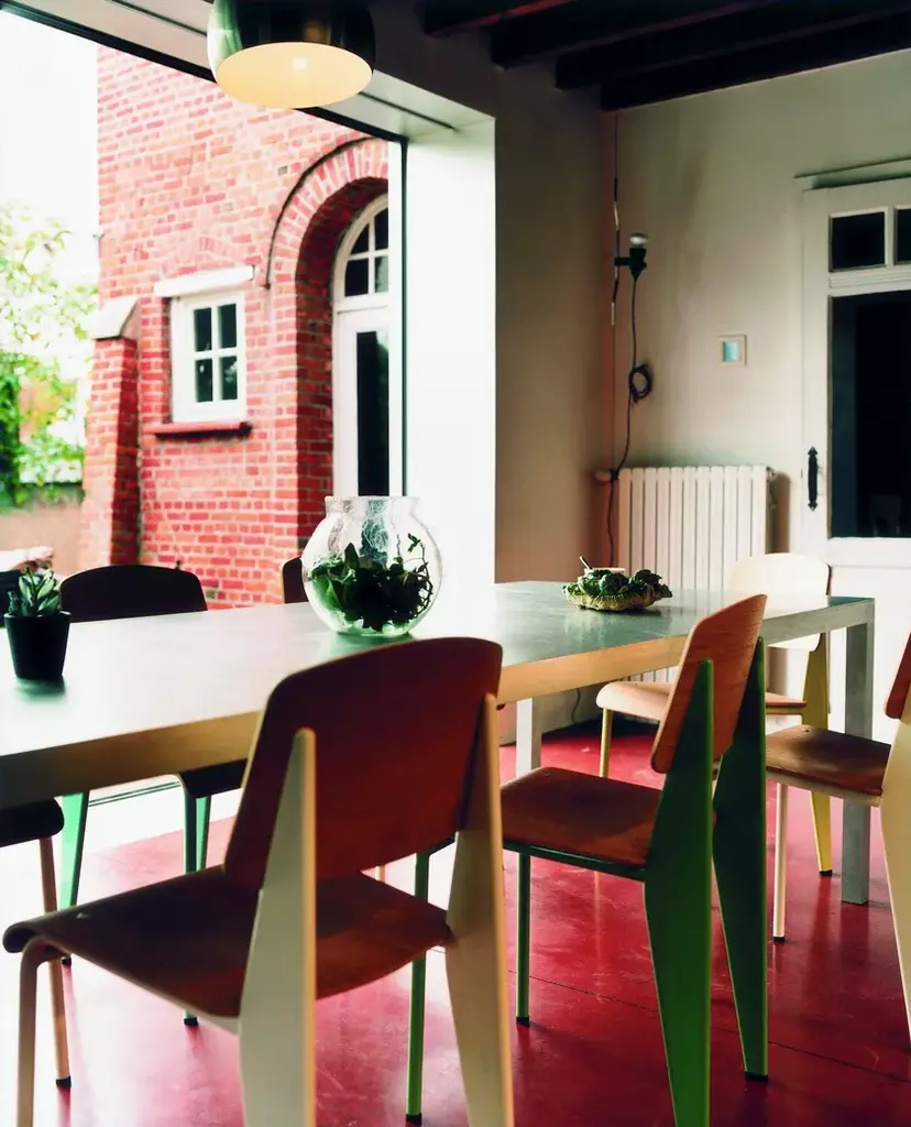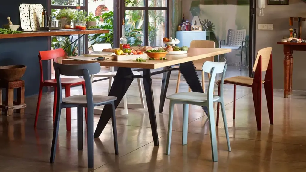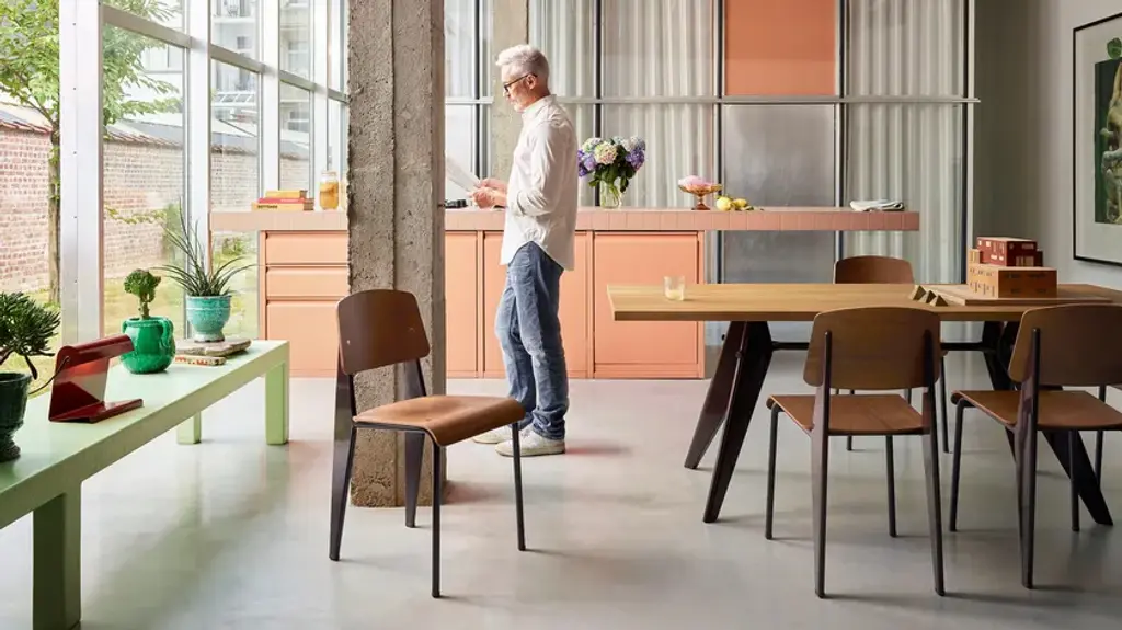 The seat and backrest of the Standard chair by Jean Prouvé are available in various types of robust wood, and the chair‘s striking metal frame comes in different colours. This understated, iconic design is a famous classic by the French ‚constructeur‘.Materials:- Seat and backrest: oak (natural or dark finish) or walnut (black-pigmented finish).- Base: bent sheet steel and tubular steel, powder-coated finish (smooth).Chairs take the most stress on their back legs, where they bear the weight of the user's upper body. The engineer and designer Jean Prouvé illustrated this simple insight in his distinctive design for the Standard chair: while steel tubing suffices for the front legs, since they bear a relatively light load, the back legs are made of voluminous hollow sections that transfer the primary stress to the floor.Standard is offered with a seat and backrest in wood or as the model Standard SP in ASA plastic. In addition, there is the all-wood Chaise Tout Bois, whose design is very similar to the Standard chair. During World War II, Jean Prouvé responded to the limited supply of metal with a version made entirely out of veneer and solid wood.