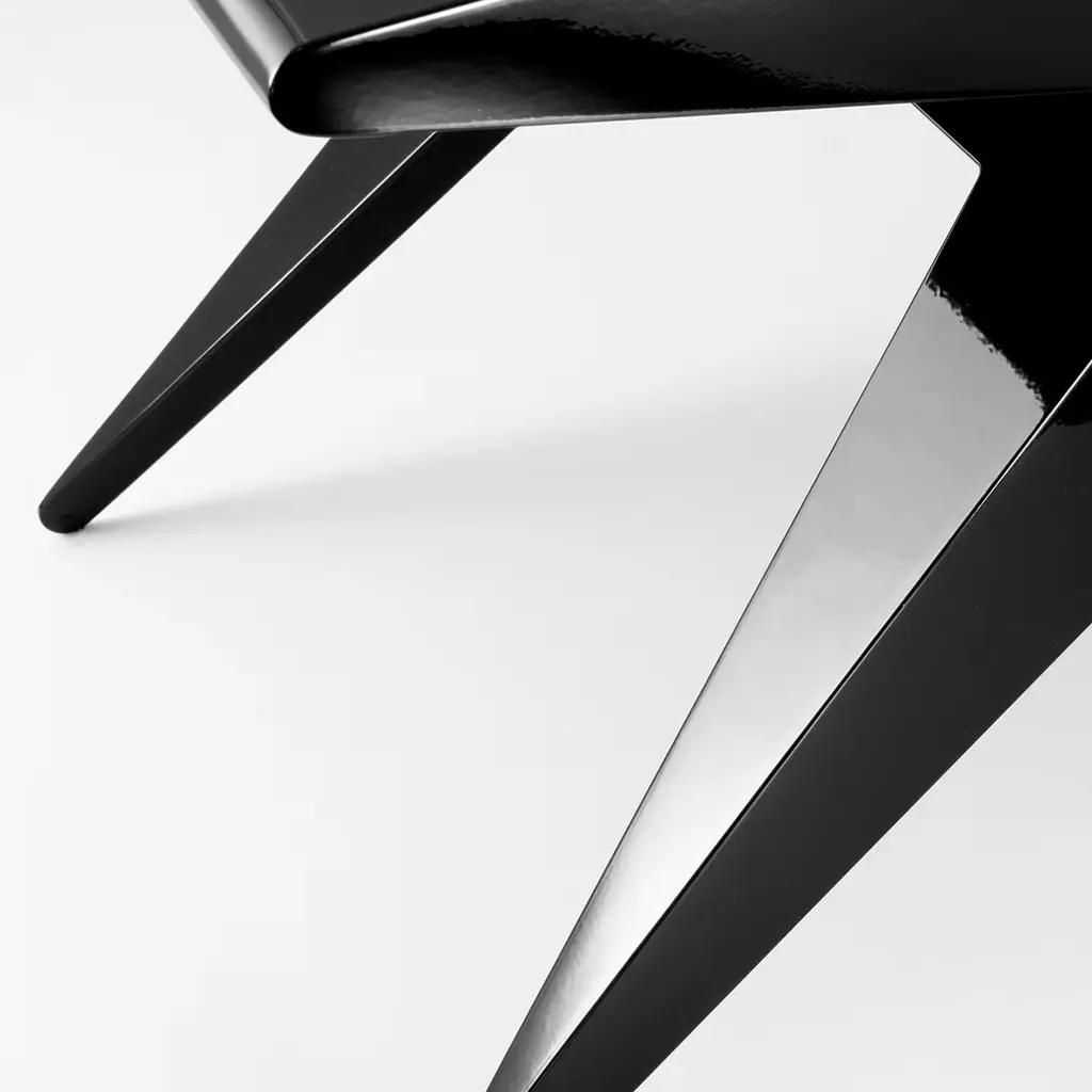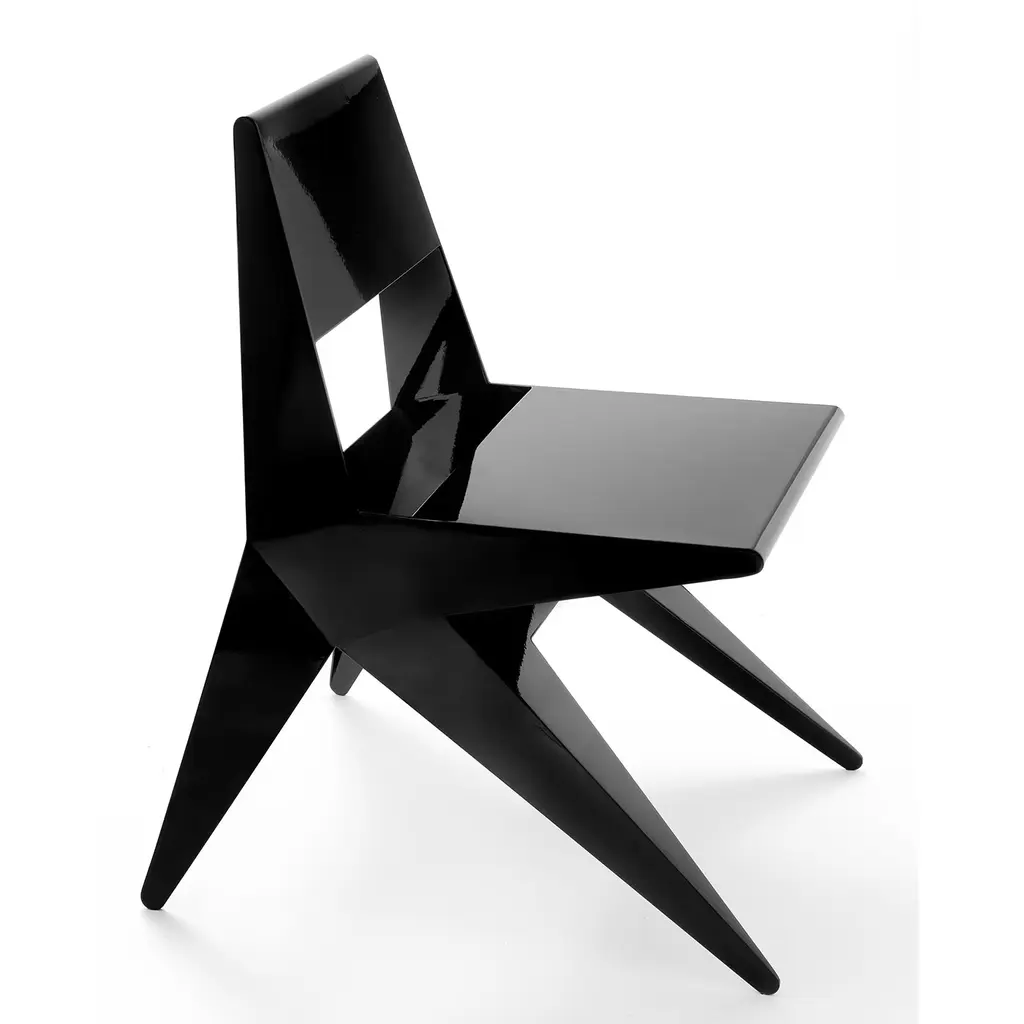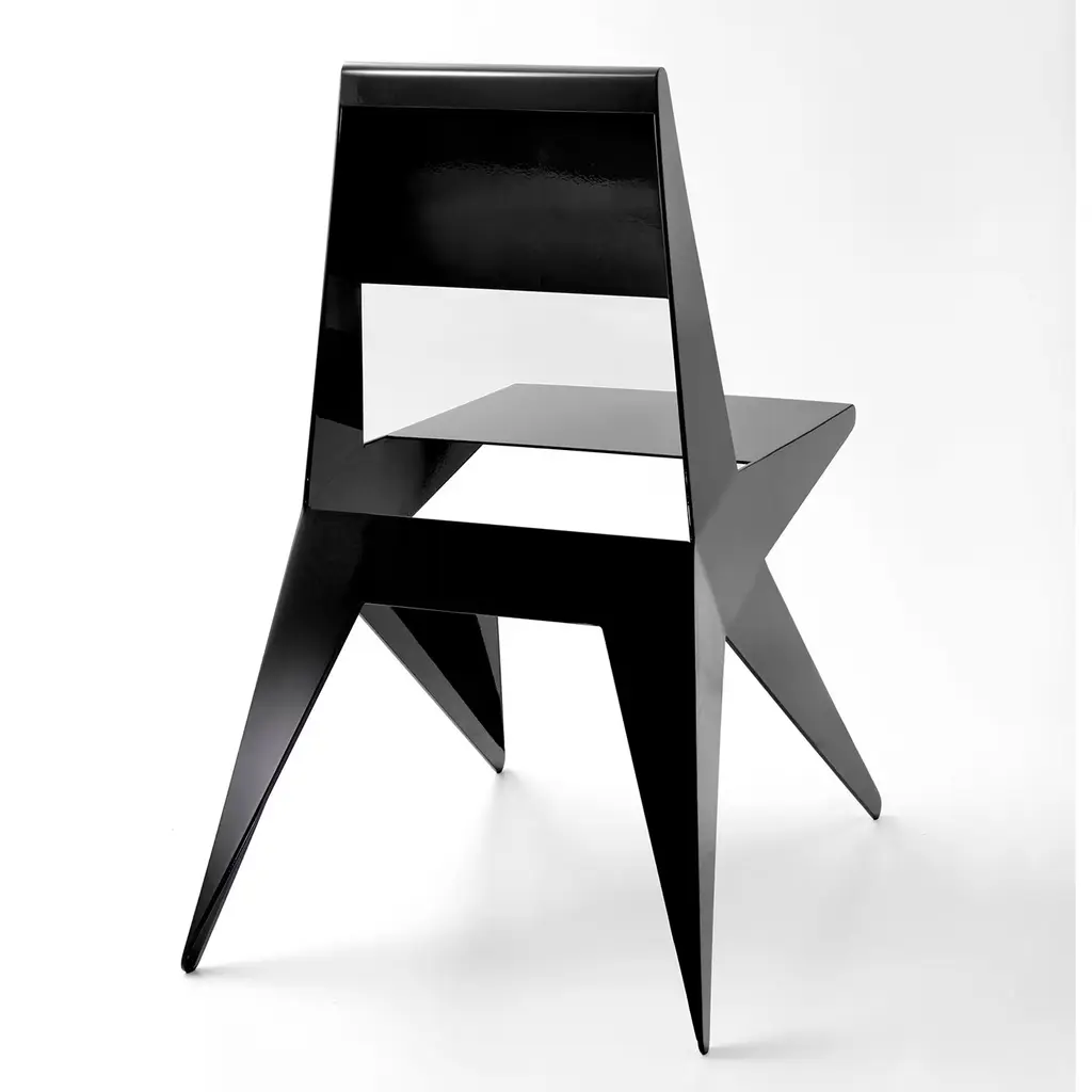 Bent, welded, and finished entirely by hand, this unique chair features an angular silhouette crafted using a thin aluminum sheet. Legs, seat, and back extend from a core like the points of a star. The black lacquered finish enhances the bold look of this modern chair that can be used both indoor and outdoor. It is available in other RAL colors, with armrests and optional leather cushions. The seat is 47 cm high.