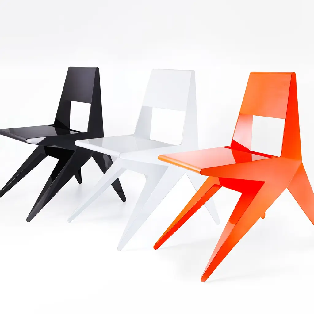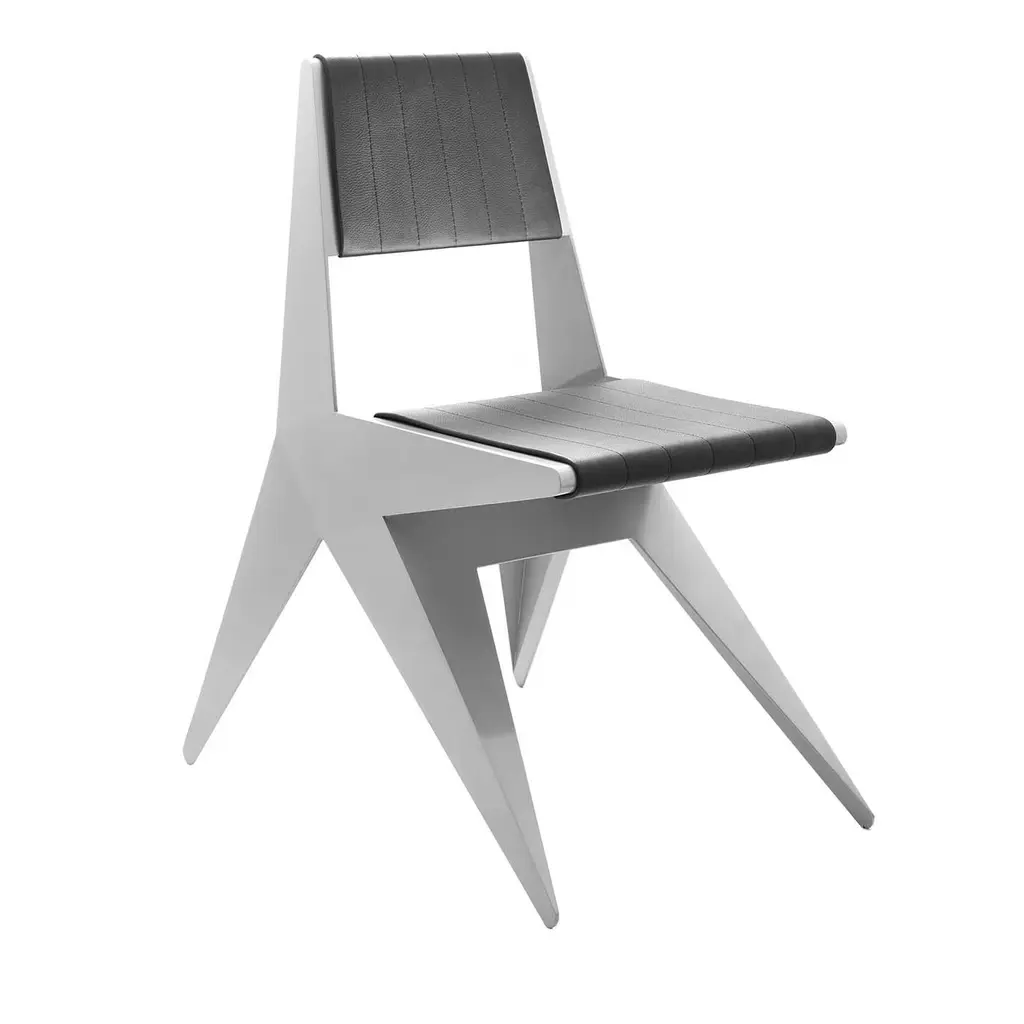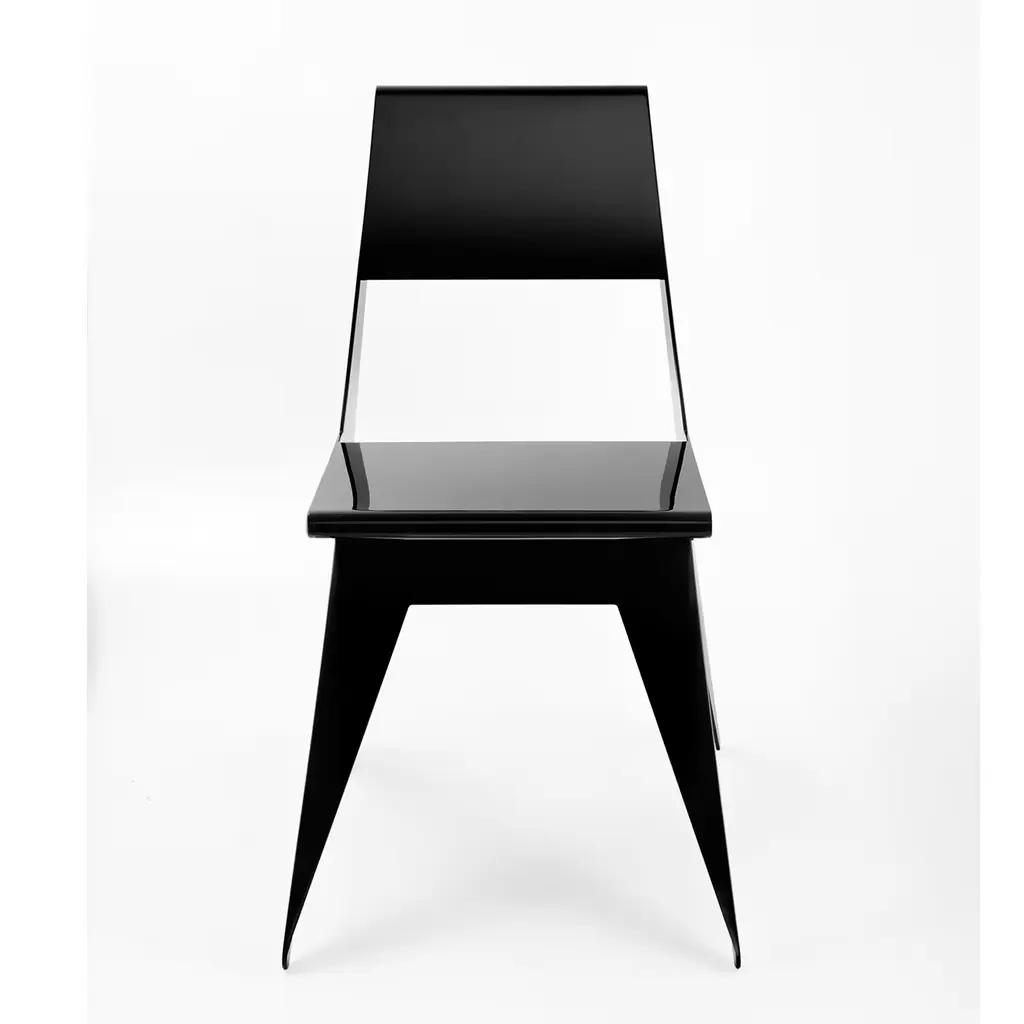 Bent, welded, and finished entirely by hand, this unique chair features an angular silhouette crafted using a thin aluminum sheet. Legs, seat, and back extend from a core like the points of a star. The black lacquered finish enhances the bold look of this modern chair that can be used both indoor and outdoor. It is available in other RAL colors, with armrests and optional leather cushions. The seat is 47 cm high.
