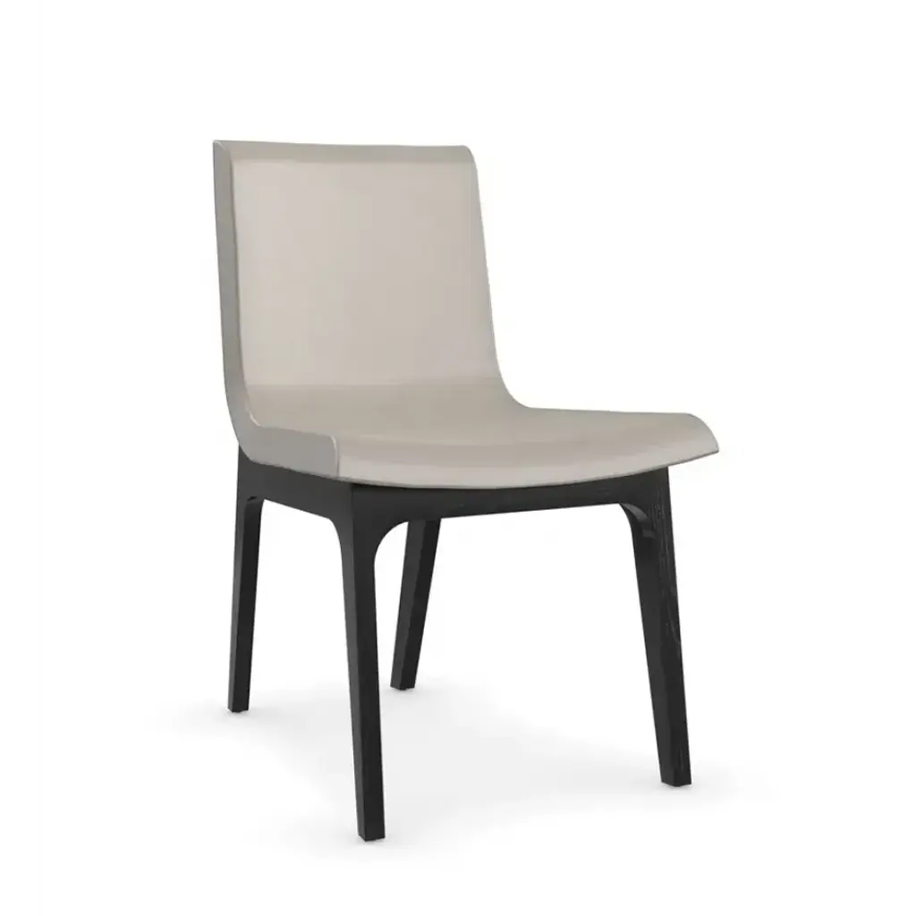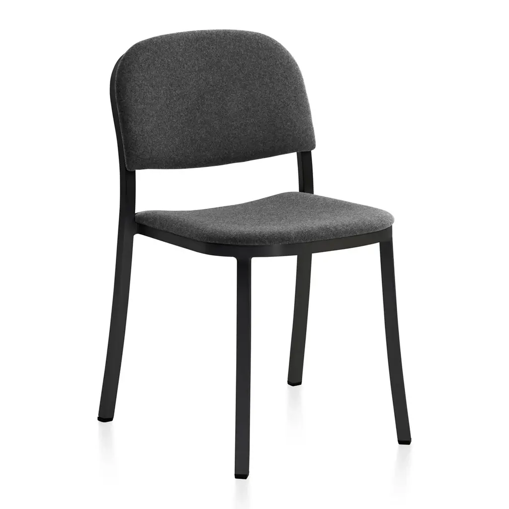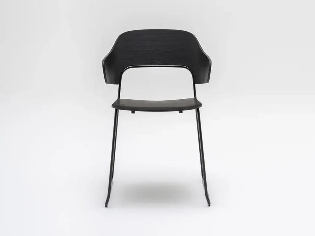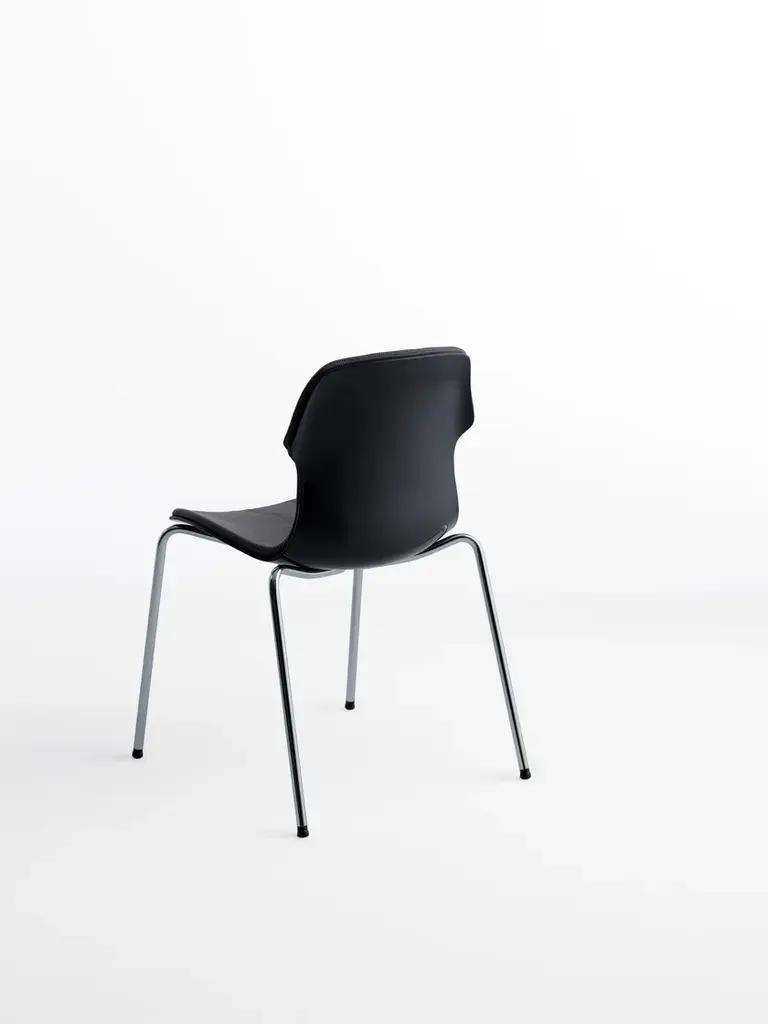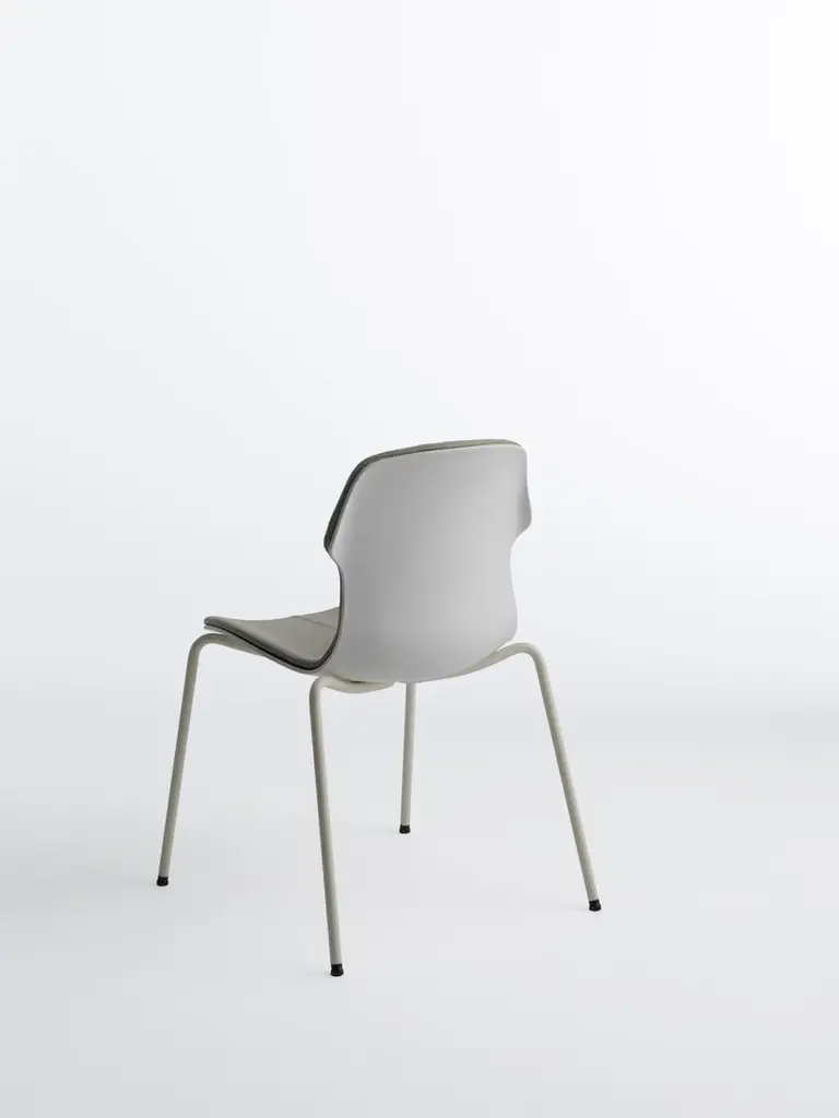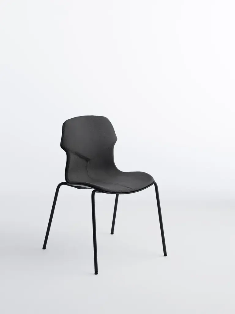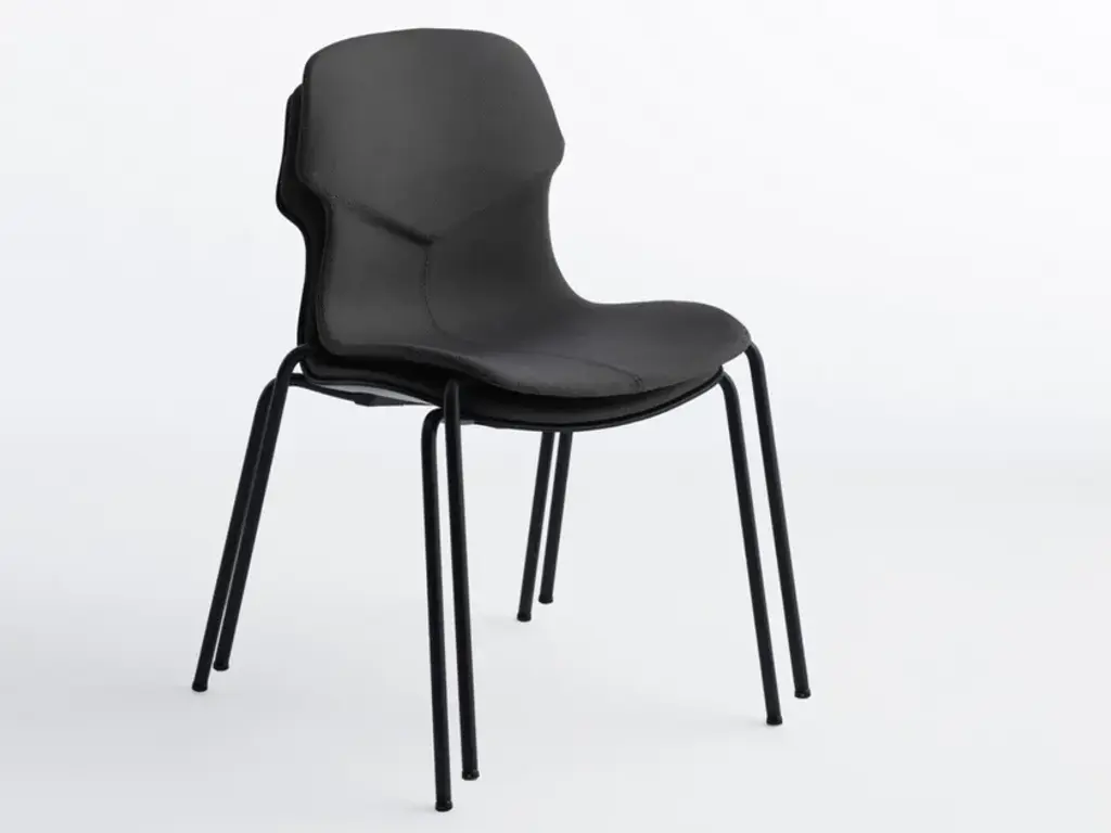 Stereo is a stackable upholstered chair in fabric.Painted or chromeplated metal legs. Polypropylene shell, to which a padded countershell upholstered in leather, eco-leather or fabric is fixed at the front. Self-levelling feet.