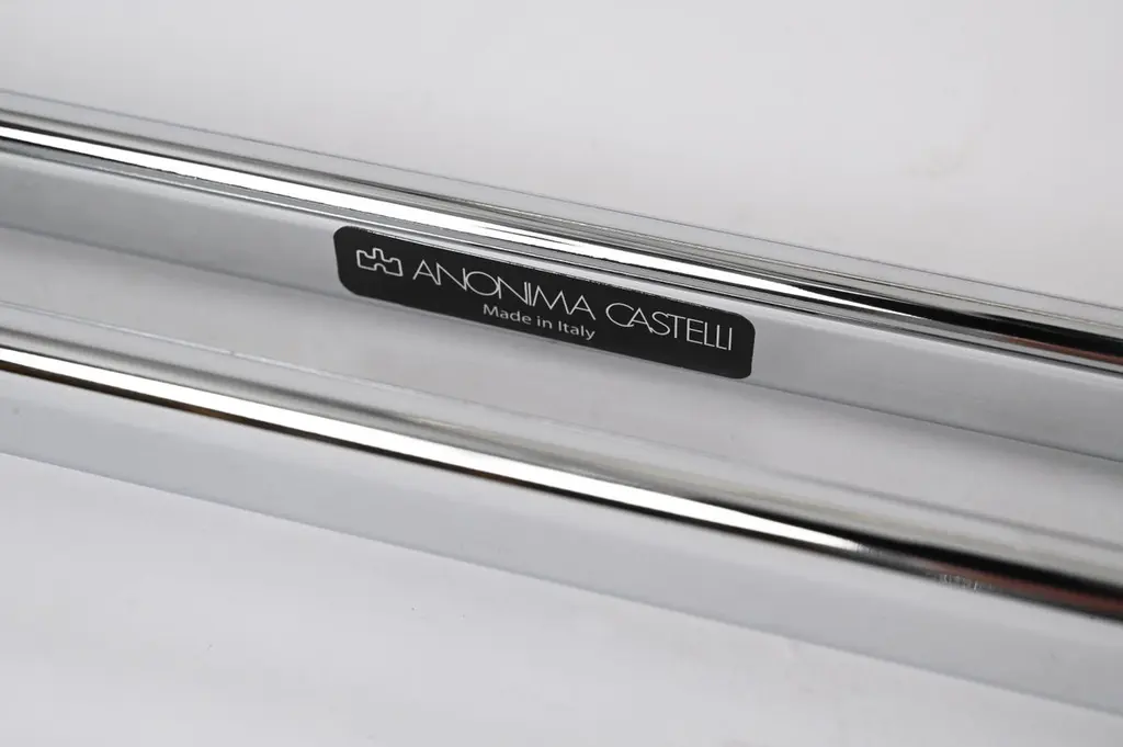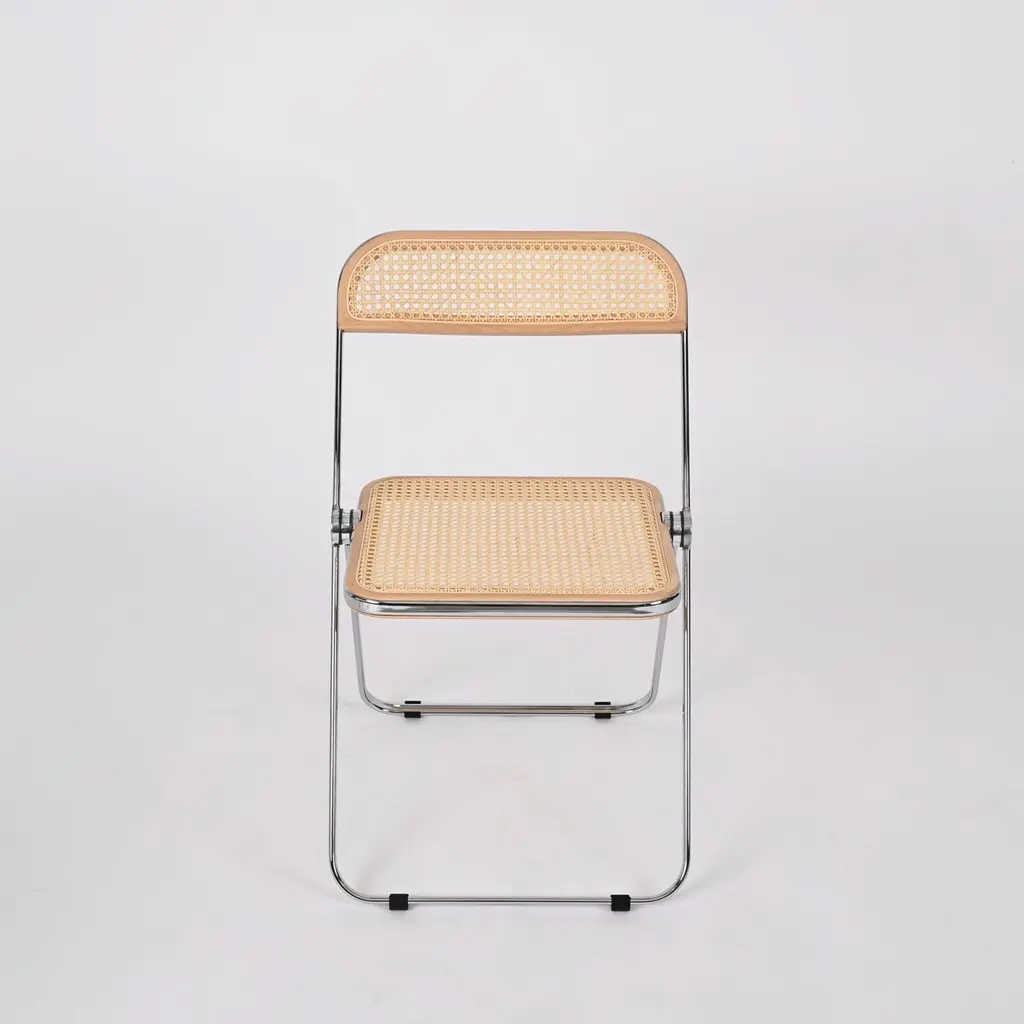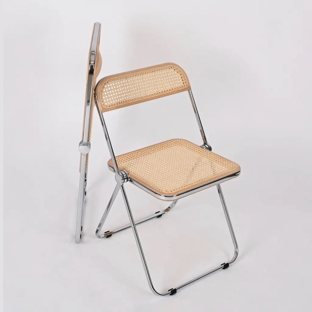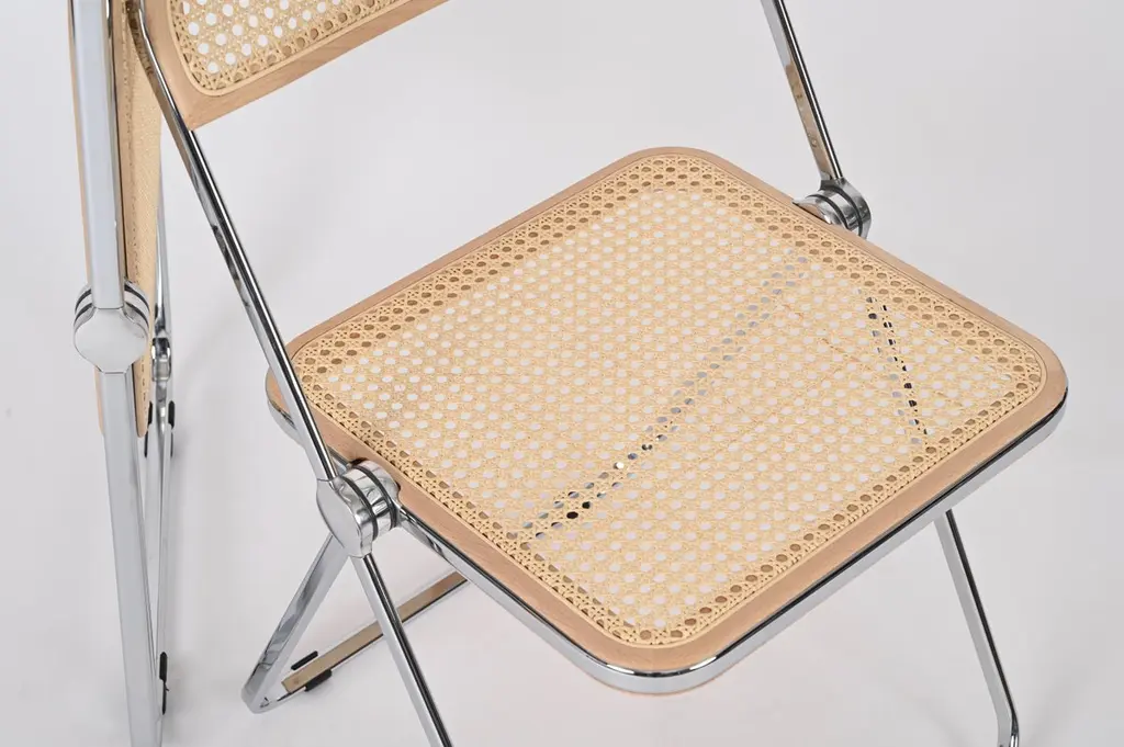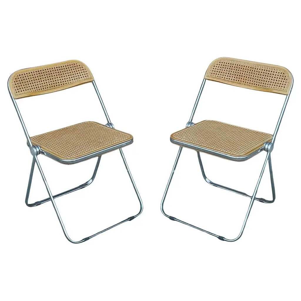 Gorgeous original and signed Cane "Plia" folding chairs in Vienna straw wicker and chrome. These iconic Italian chairs were designed by Giancarlo Piretti for Castelli in the 1967.This elegant chairs have a structure fully made in chrome with the seat and the back made in a fantastic woven wicker mounted over a light beech wood frame. The end result is an incredibly charming and stylish chair. The chairs are NOS, in perfect conditions as they have never been used.An incredibly charming chair, perfect to enhcance a Mid-century Modern project.The price is per single chair.Dimensions (cm):Depth - 51Width - 51Height - 76Seat height - 43PLIA, the symbol of a new era focused on plastic: this is how the plia chair from 1967 was welcomed when it was presented at the Salone del Mobile in Milan. on the occasion of the fair, the session received so much public acclaim that many visitors walked away from the stand taking samples without even asking for permission ... following this unorthodox compliment, the chairs were tied with a chain for safety.These folding chairs are made of very rare pink plexiglas with a chrome structure and are in perfect condition. The "Plia" folding chair is a true design classic as it has won several awards and is also part of the MoMA collection. The "Plia" chair has a fantastic folding mechanism which allows the chair to be folded very flat so that it can be stored easily. Each chair in this set is signed and engraved with the manufacturer's mark. A multipurpose and iconic set that will be perfect for a modern or minimal project. Giancarlo Piretti was born in Bologna in 1940. He attended the Bologna State Institute of Art, where he obtained the title of Design Teacher. In 1960 he attended the Academy of Fine Arts in Bologna. Subsequently, for seven years, he was a lecturer in Industrial Design at the State Art Institute of Bologna. In the same period, for 12 years, he worked as an interior designer for Anonima Castelli, designing their lines of furniture for the home, office and community, for which he registered numerous industrial and mechanical invention patents. His best-known projects include PLIA, a folding chair, PLATONE, a folding table, DSC (106-AXIS), a seating system for collective and institutional spaces, and SISTEMA 61, a modular sofa system. Giancarlo Piretti participates in numerous Italian design competitions, obtaining prizes and special mentions. In 1971 he received the SMAU award and the BIO 5 Distinction at the Ljubljana biennial, Slovenia for Plia. In 1973 he was awarded, as always for PLIA, the GUTE FORM mention by the Chamber of Commerce of the Federal Republic of Germany, and a special mention by the British Government. In 1971 PLANO won the IBD gold medal (USA). For the VERTEBRA seating system: in 1977 he was awarded, together with Emilio Ambasz, the gold medal of BD (USA), the SMAU prize in 1979 and the Compasso d'Oro (Italy) in 1981. As always together with Ambasz, in 1980 receives the "National Industrial Design Award" (USA) for LOGOTEC, a lighting system. In 1975 Giancarlo Piretti was appointed member of the Scientific-Didactic Committee of the Higher Institute for Artistic Industries of Florence. His work is often published in numerous international journals.