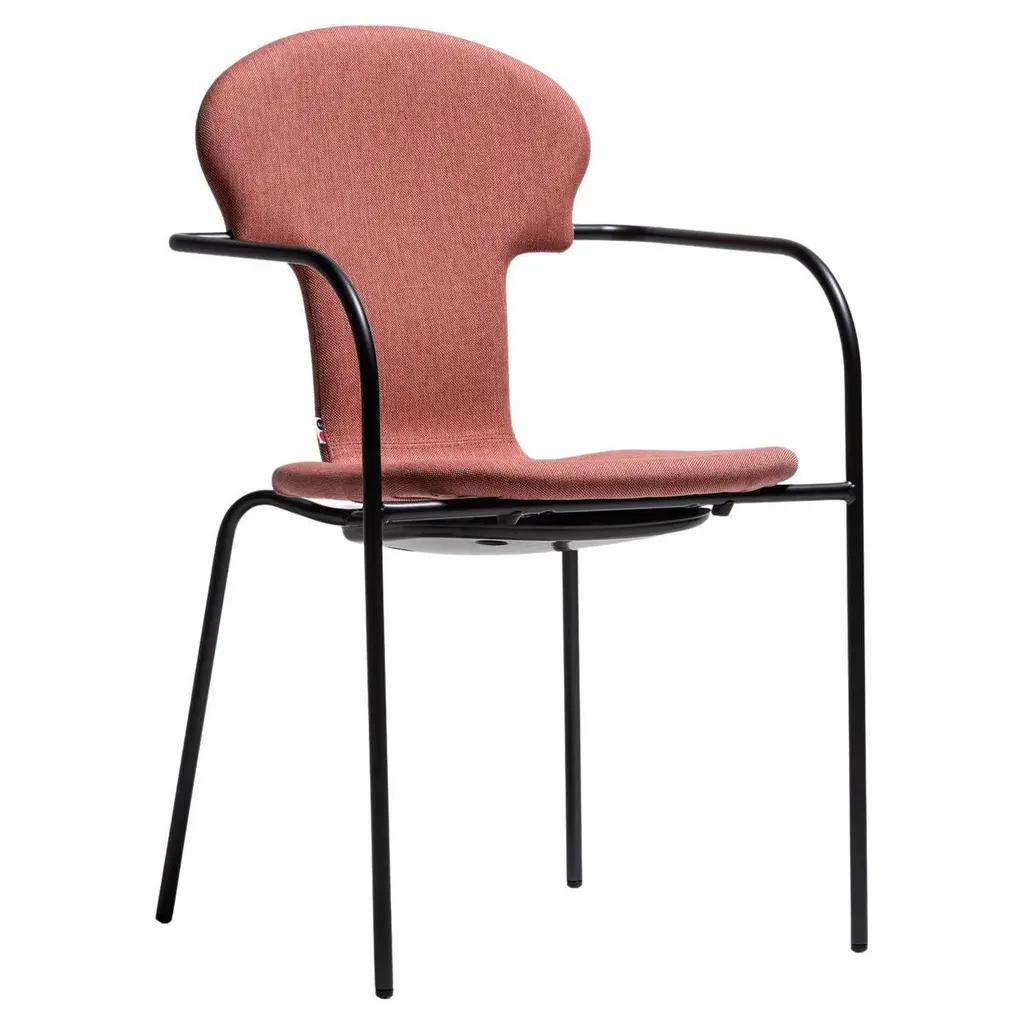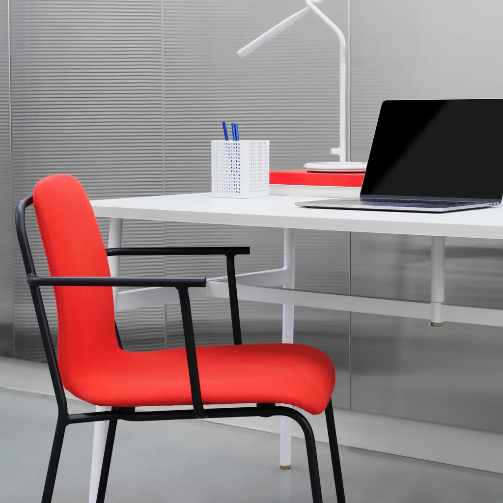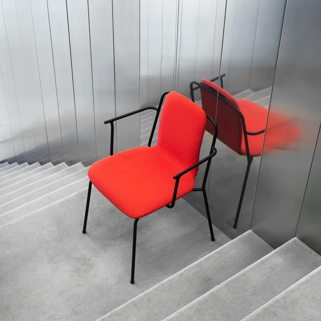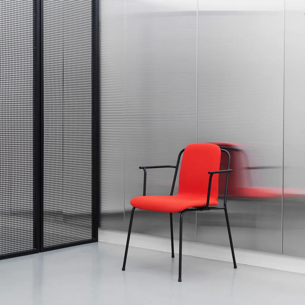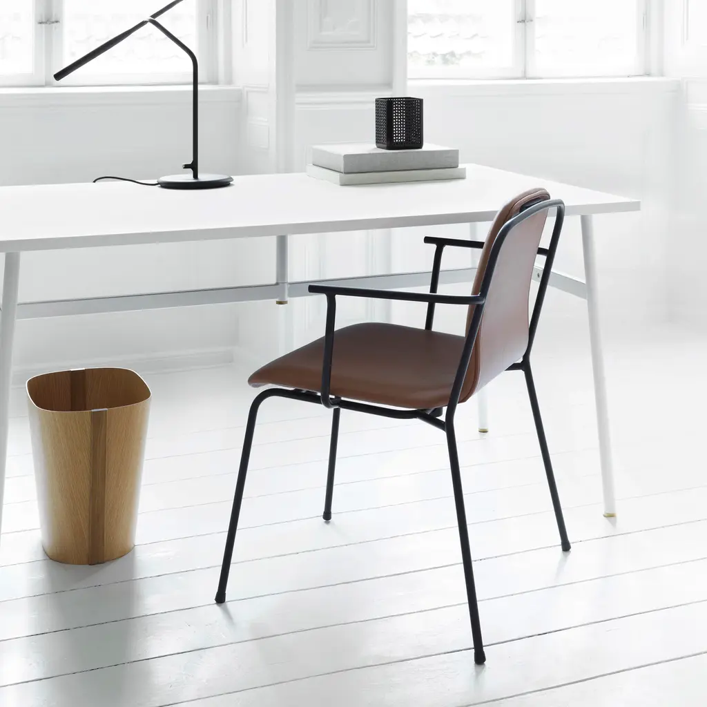 With a fully upholstered model clad in a custom covering, designer Simon Legald shows the full range of Normann Copenhagen's Studio seating. A wealth of premium fabric and naturally finished leather selections also provide an intriguing contrast with the undulating black metal frame originally inspired by simple French industrial chairs. And the soft padding adds a heightened comfort level for extended use. Studio is especially apropos in restaurants and educational settings with multi-use areas, as its steel frame makes it easy to move around as desired.