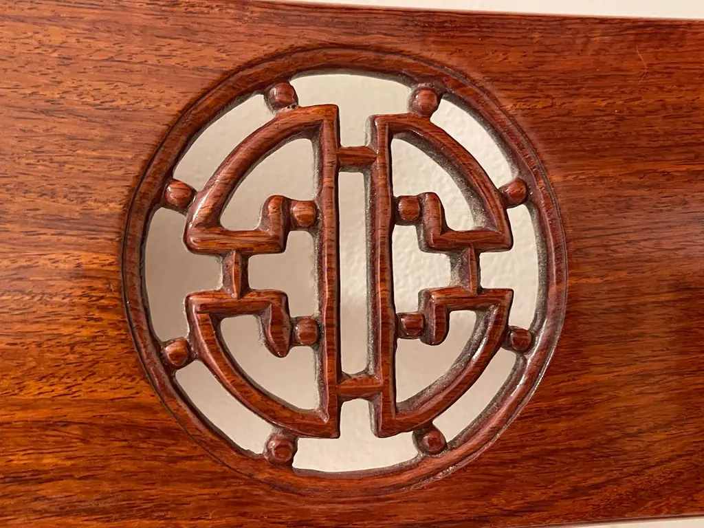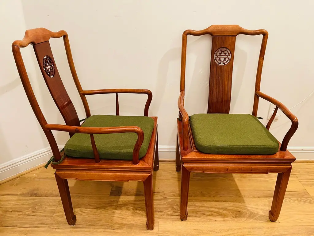 Pair of superb Chinese vintage handcarved teak wood pair of chairs with a symbol of longevity on the backs. Beautifully polished teak wood in an amber color. Elegantly proportioned armchairs. Seat cushions available.