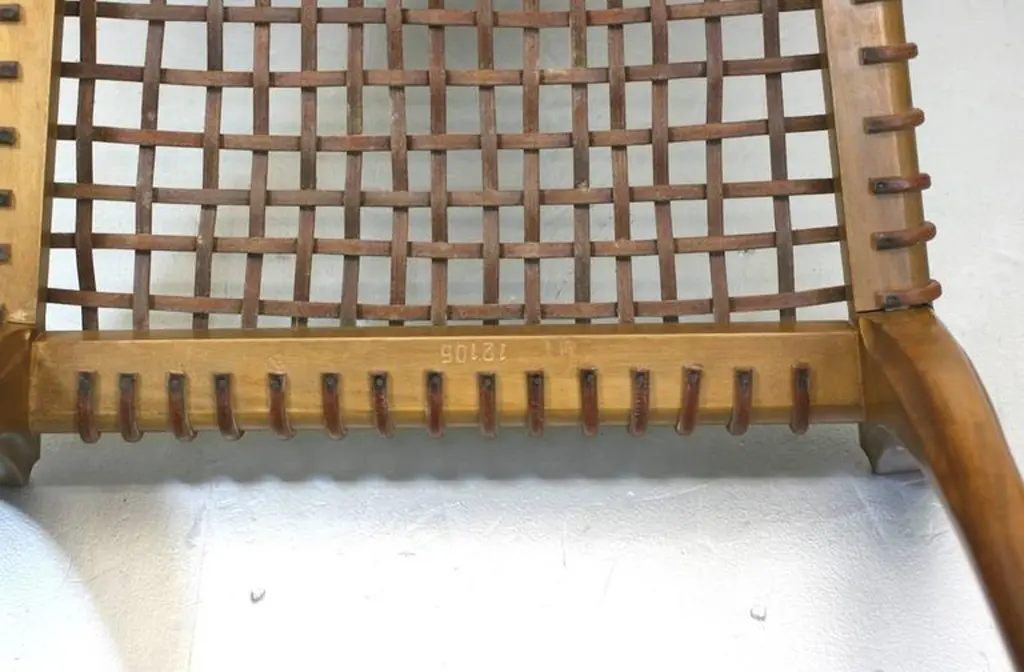 Classically elegant and beautifully proportioned T.H. Robsjohn-Gibbings Klismos chairs with original woven leather strap seats, 1960s, produced by Saridis of Athens. TWO available in this size NOT 3. Excellent condition.Measures: 30" deep, 21" wide. Seat height 16.5". Total height 35.5". Back width 21". Seat size 20" x 17" deep.