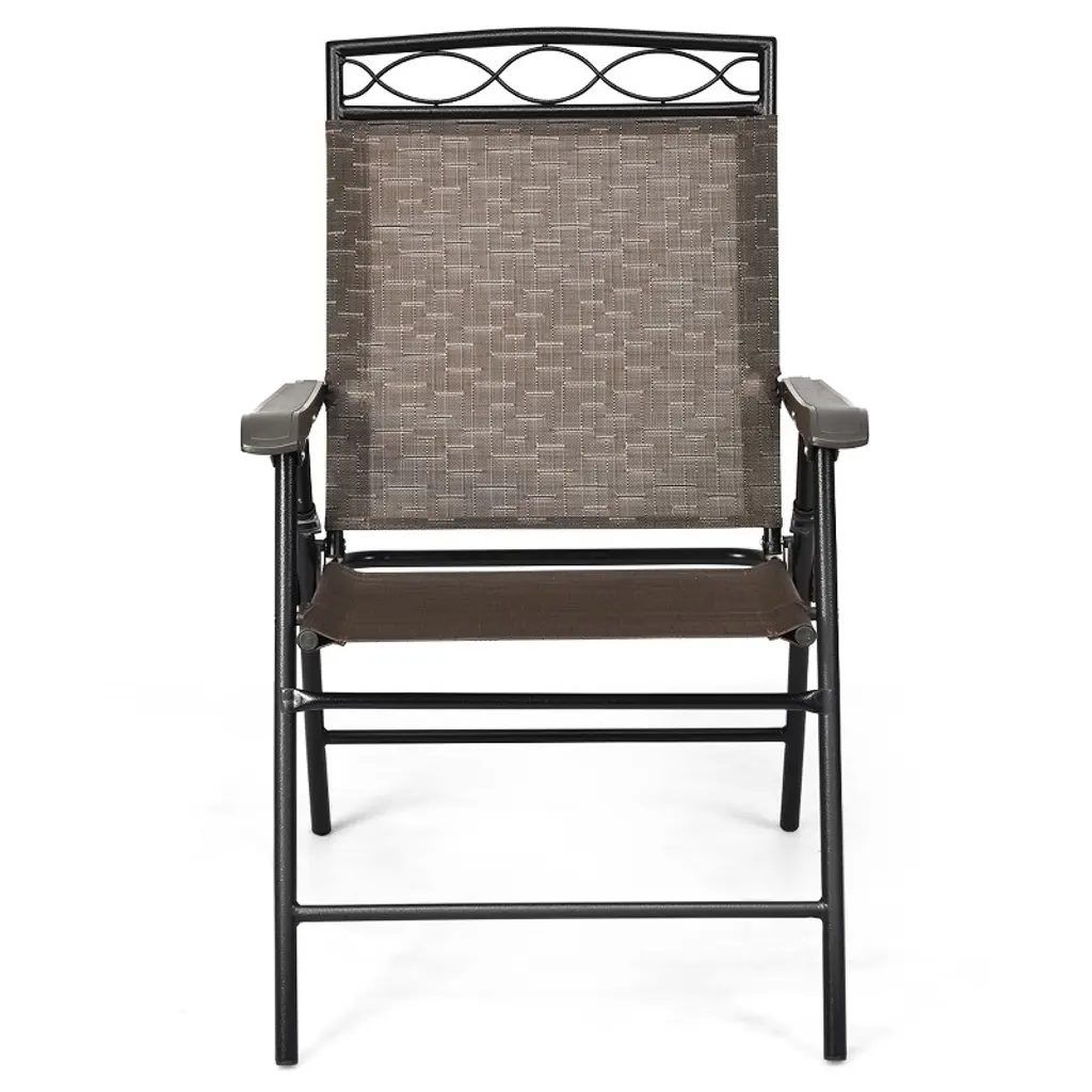These folding camping chairs have a breathable and comfortable fabric which can keep you cool during the hot summer months. Featuring with heavy duty steel frame, this chair is sturdy and durable which can support 250lbs. These folding chairs come in a two pack or four pack. Always have a comfortable seat for outdoor parties, events or when you have extra company around.FeaturesIt's lightweight and easy to carry & storage.Made of heavy duty steel and breathable fabricTwo pack or four pack you can chooseBackrest and armrest keep you comfortableNon-slip foot pads protect your floor from scuffPerfect for camping, garden, patio, poolside and backyardSpecifications Color: Brown Material: Steel+Fabric Overall dimension: 24.5"x 25"x 35.5"(W x D x H) Net weight of per chair: 8.5 lbs Folding size: 22" x 4"x 33" (W x D x H) Weight capacity: 250 lbs Package includes: 【Two Pack】2 X Foldable Chair ; 1 X User manual 【Four Pack】4 X Foldable Chair; 1 X User manual