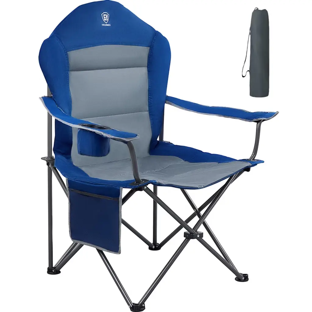 Enjoy the outdoors in comfort with this oversized camping chair. Crafted with breathable and anti-wear 600D Oxford fabric and padded with soft foam, this outdoor camping chair ensures both coziness and durability. The ergonomic curve along with a wide seat and adjustable armrests encourage a relaxed sitting posture during sports events, camping trips, or fishing. Supported by a sturdy metal frame, this lawn chair offers a reliable seating option for a wide variety of body types, loading up to 500 lbs. The built-in cooler bag and cup holder keep your beverages within easy reach and refreshingly cold.FeaturesHeavy-duty powder-coated metal frame supports up to 500 lbs Fully padded chair offers optimal comfort for extended sitting Ergonomic backrest and wide seat contour to your bodySpecifications:Color: Gray / Navy Material: Metal, Oxford Fabric, Foam Unfolding Dimensions: 38" x 21.5" x 40"(L x W x H) Folding Dimensions: 8.5" x 8.5" x 40"(L x W x H) Seat Dimensions: 24.5" x 19.5" (L x W) Backrest Height: 20.5" Seat Height: 19.5" Weight Capacity: 500 lbs Net Weight: 9.5 lbs Package Includes: 1 x Folding Camping Chair 1 x Carry Bag 1 x User Manual