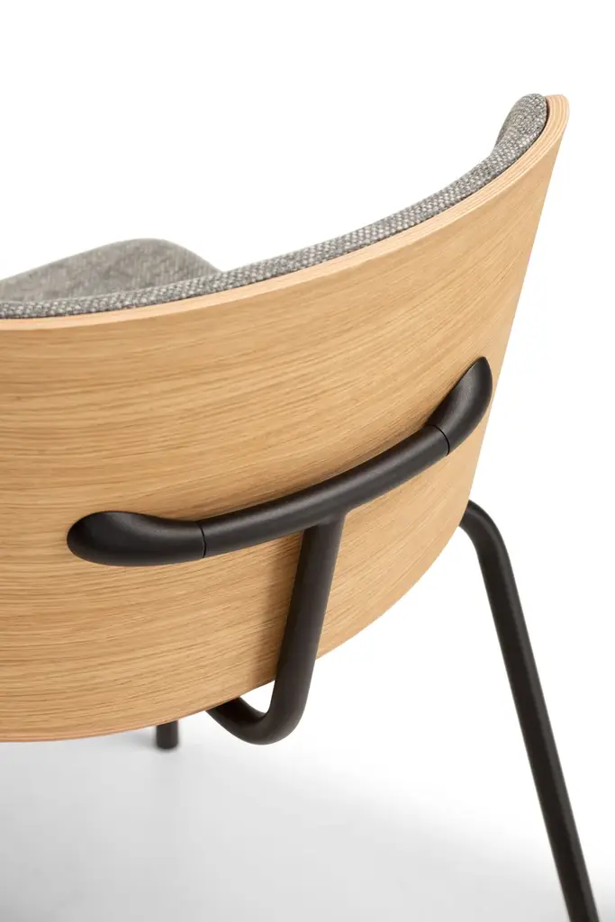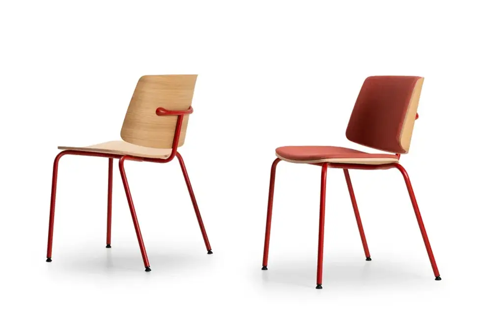 Tao is a chair with shell in beech plywood with variable section, finish in oak, wengé or walnut. 4-legged structure in painted tubular steel. Padded seat and back option available.The name of this chair reveals the core of the project, in fact it is precisely on the T-shaped support of the backrest that we have focused our attention on. At the root of the concept is clearly the recovery of a classic style, typical of the '50s and '60s design. The two wooden shells joined by the metal frame are an image that each of us has in our memory, from everyday examples such as school chairs or Nordic bistro chairs to Eames' immortal masterpieces. Starting from this more than consolidated solution, the focus of the intervention was on formal cleanliness and structural research until finding a supporting system narrowed to the essential, a sturdy and simple frame capable of conveying lightness, transforming the seat and backrest into two leaves suspended in the air, without screws or rivets as in past examples. The two die-cast aluminum ends were the decisive choice, solving at the same time the backrest fixing system and resulting as the distinctive feature of the product. Tao is a strong and refined chair with a clean and friendly face but a sophisticated and pragmatic soul.