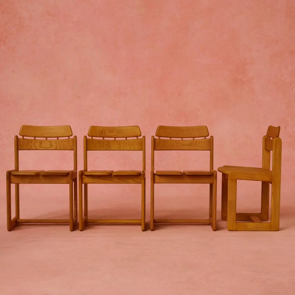 Ilmari Tapiovaara (1914-1999) was a renowned Finnish designer and architect known for his significant contributions to the fields of furniture and industrial design. He played a crucial role in shaping the modern design landscape in Finland and gained international recognition for his work.Early in his career, Tapiovaara worked alongside the celebrated Finnish architect and designer Alvar Aalto. This collaboration greatly influenced his design sensibilities and helped him establish a strong foundation in modernist design principles.Tapiovaara is often associated with the "Finnish Modern" design movement, which aimed to create functional and aesthetically pleasing everyday objects for the Finnish population. He believed that good design should be accessible to everyone. His designs often incorporated natural materials, simplicity, and functionality.Tapiolina chairs in ash wood by Ilmari Tapiovaara for Fratelli Montina.Good vintage condition. Some areas where the varnish is thinner, consistent with age.