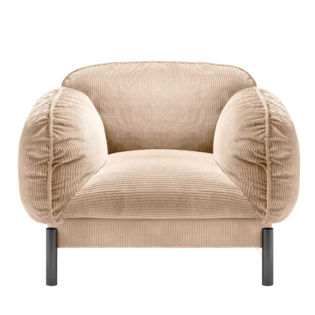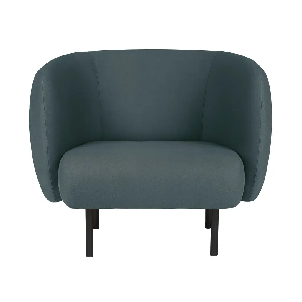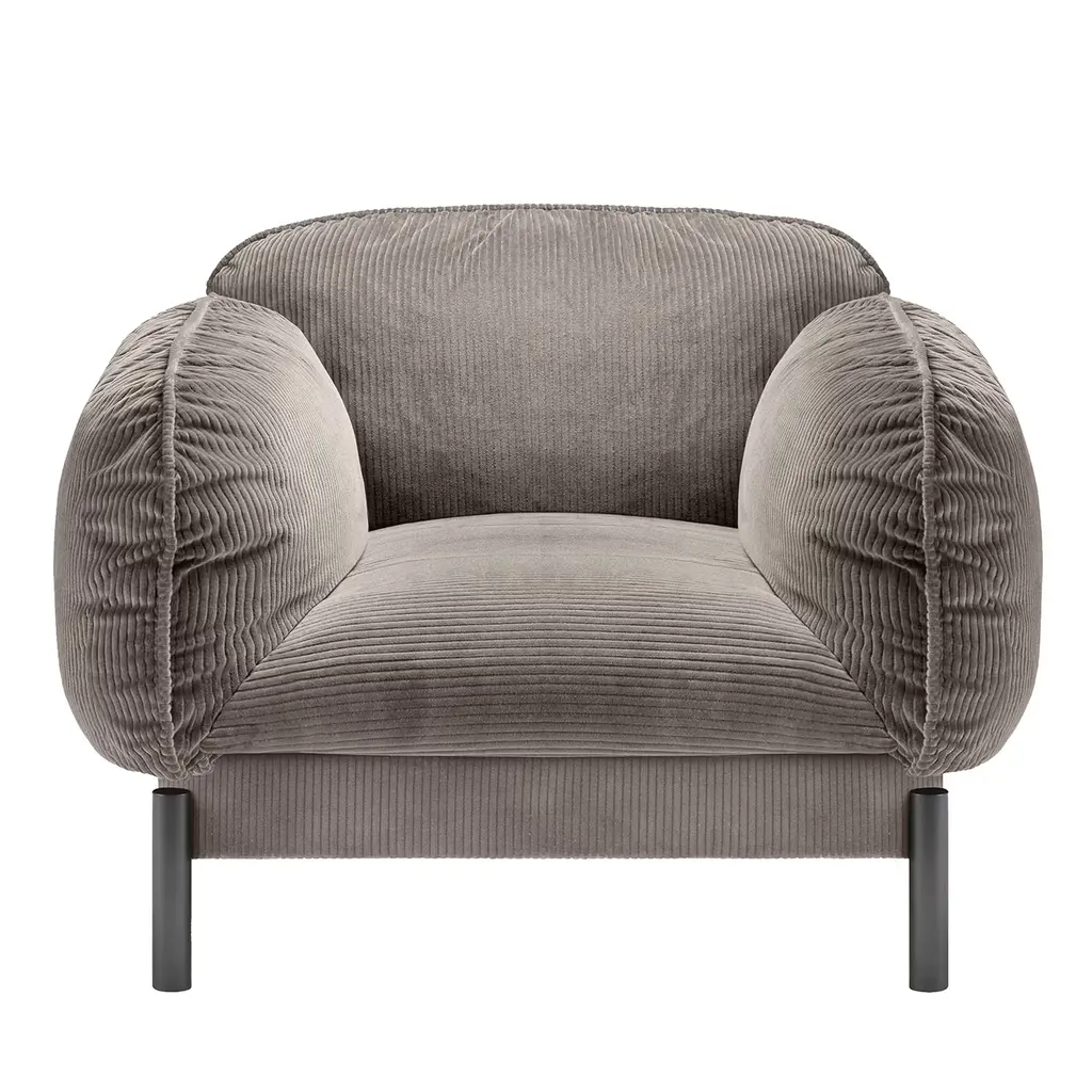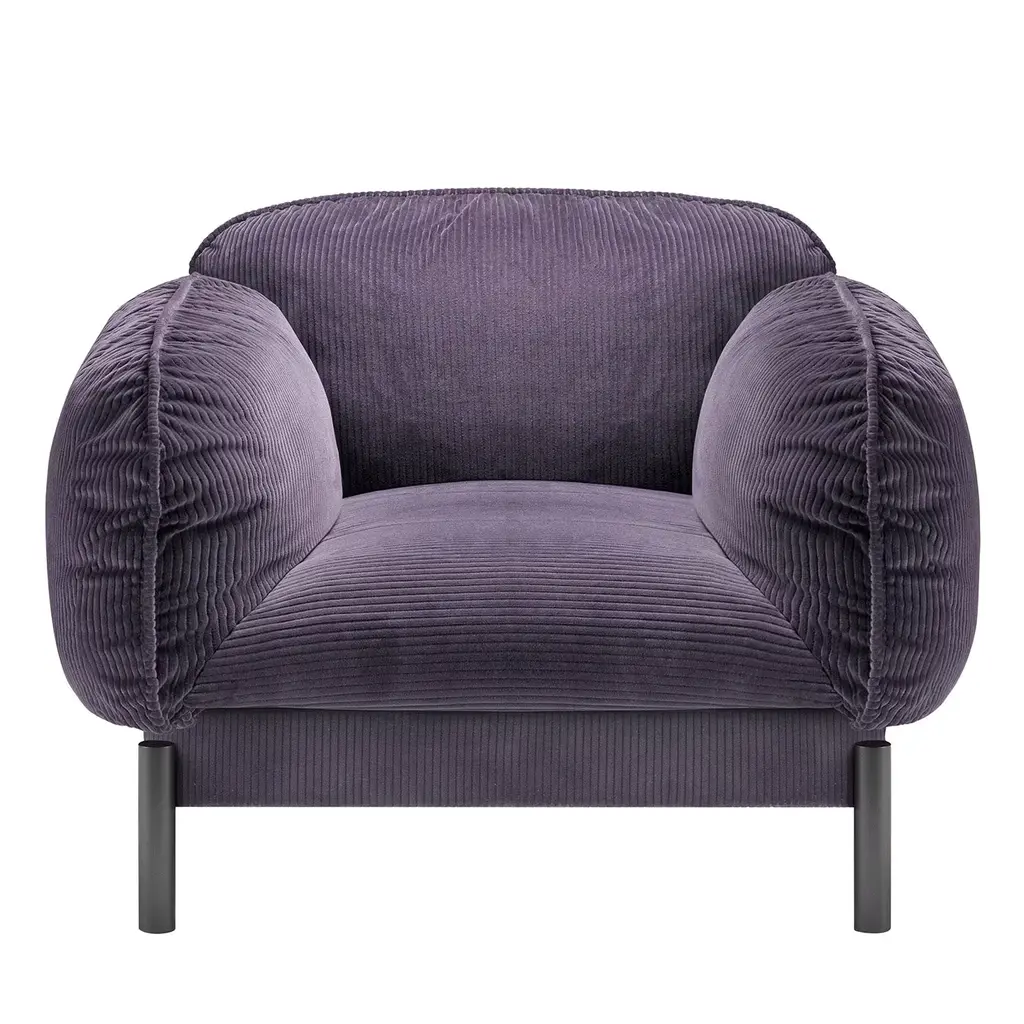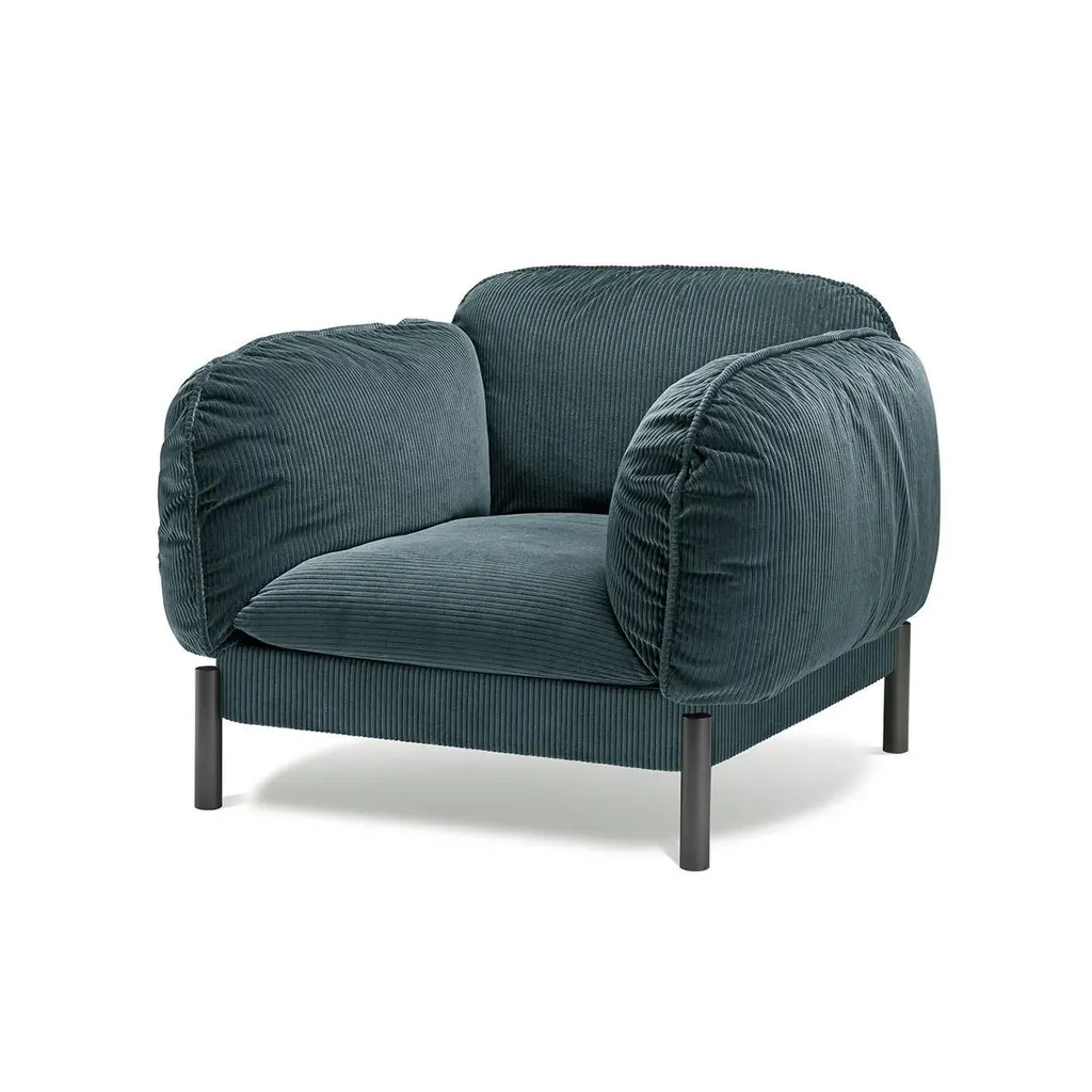 Effortlessly adorning both modern and traditional decors, this splendid lounge chair will infuse a dining room or office reception area with unparalleled sophistication. Timeless and versatile, it rests on a brass structure with short cylindrical feet and features a welcoming padded seat with back and armrests entirely upholstered in a regal-blue velvet.
