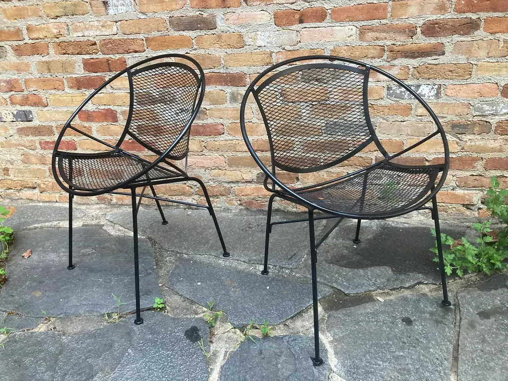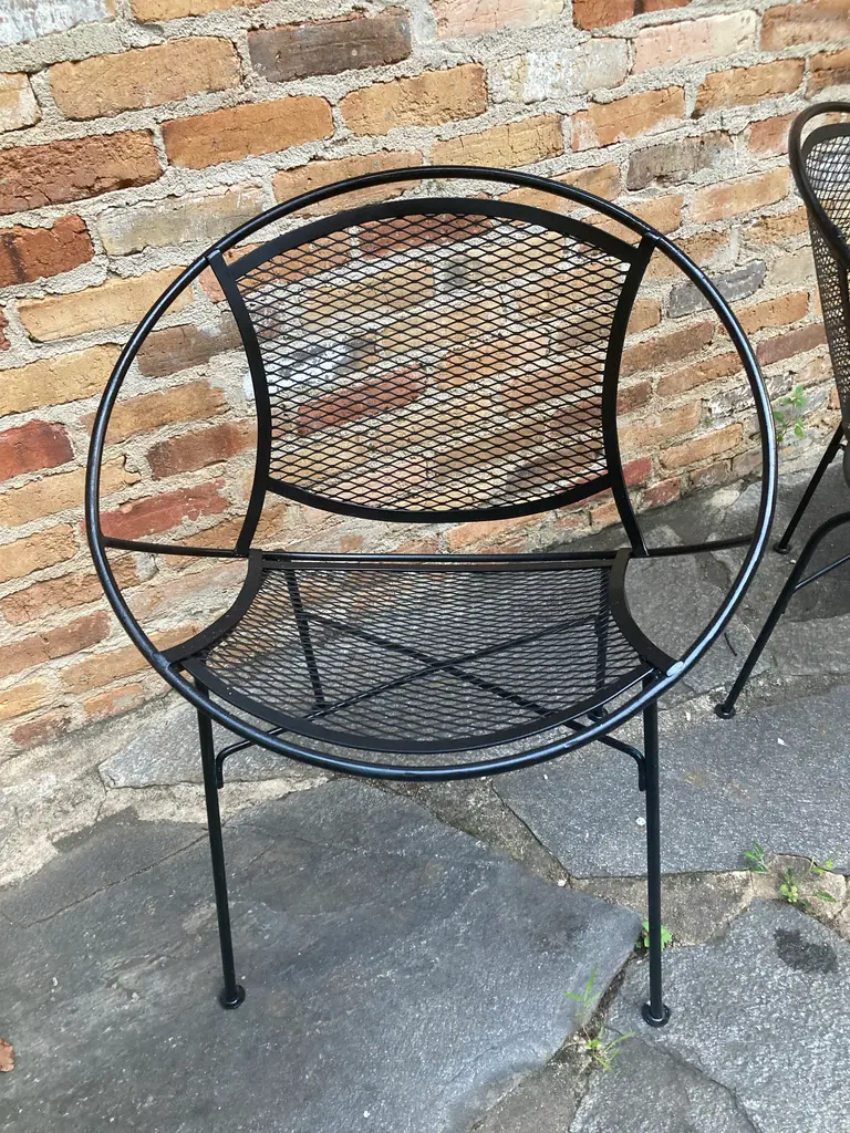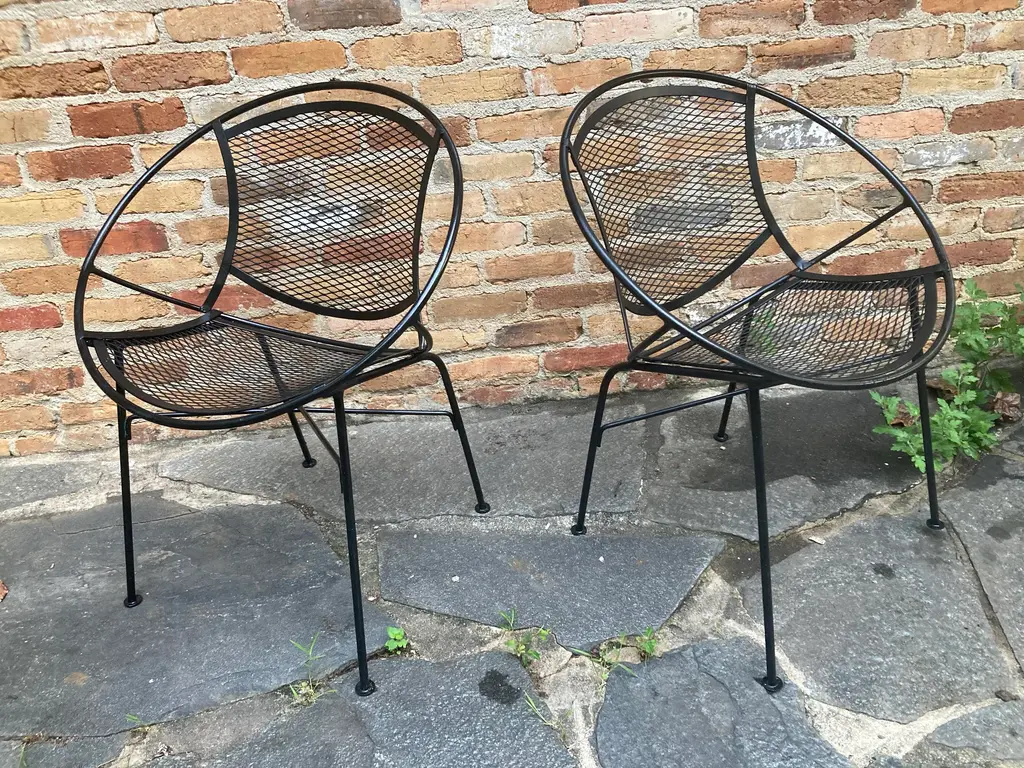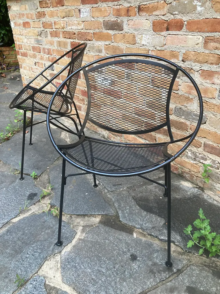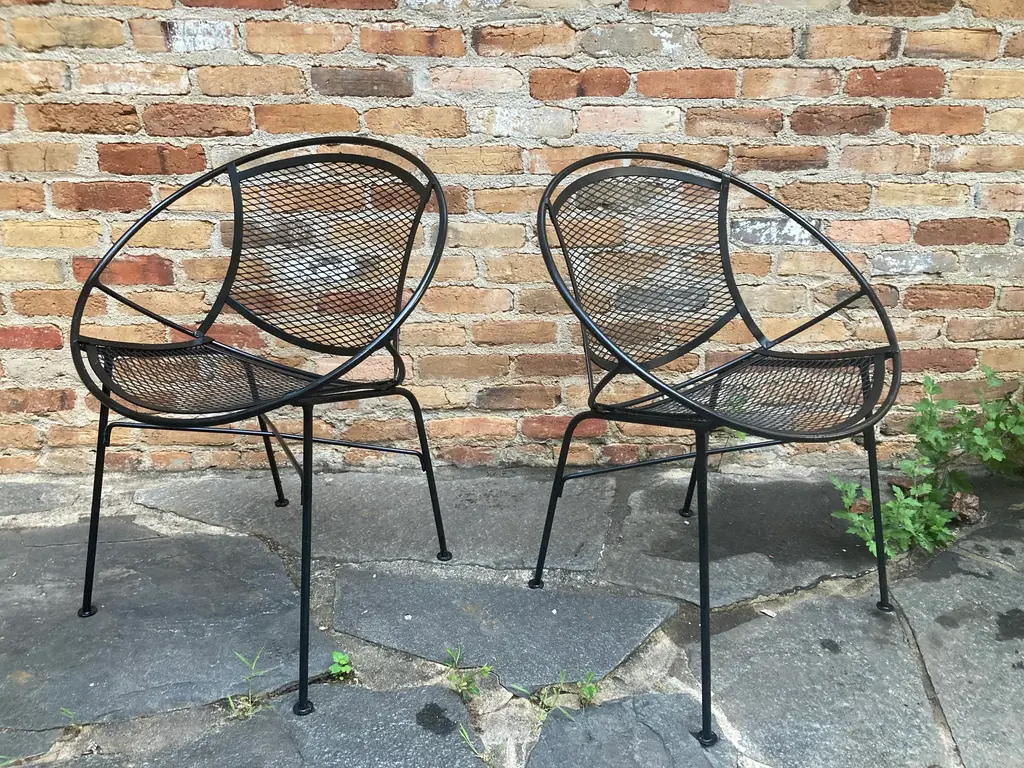 recently sandblasted, primed and professionally painted set of 2 in semi-gloss black from tempestini for salterini, often referred to as radar chair no maker’s mark 24ʺW × 22.5ʺD × 29.5ʺH i have several sets of these, all restored.