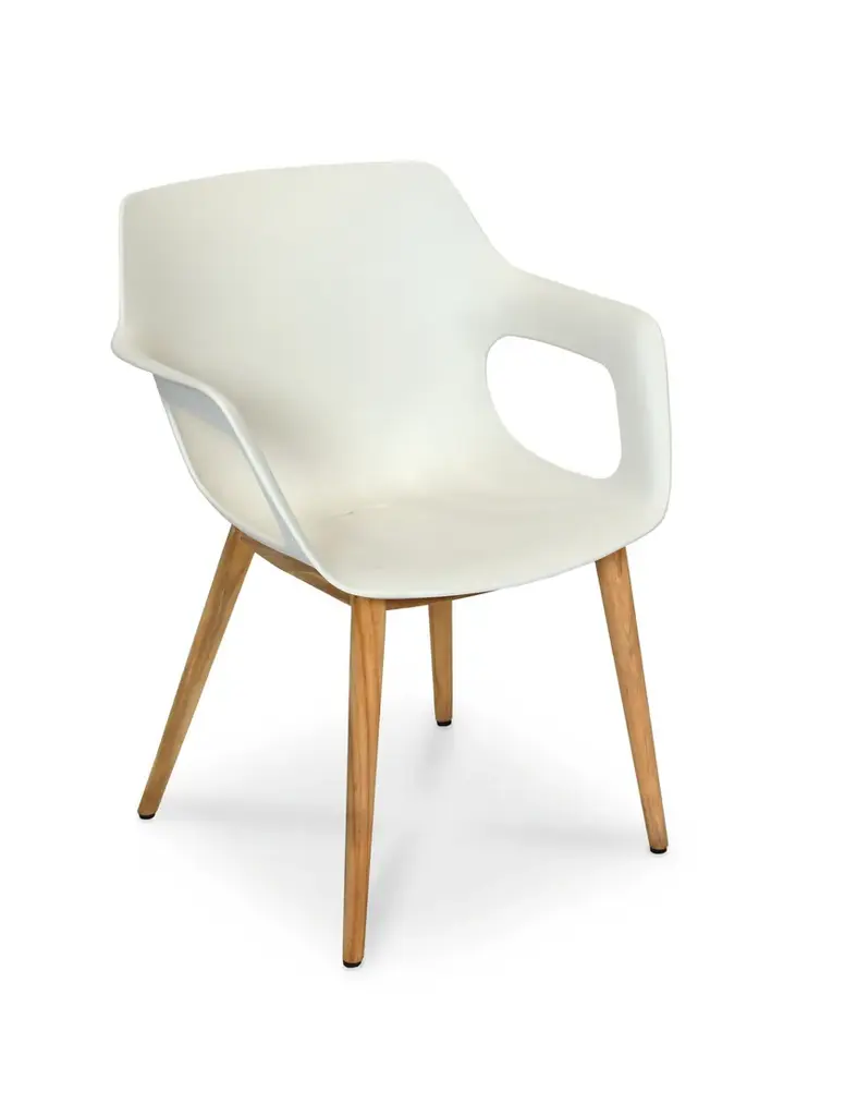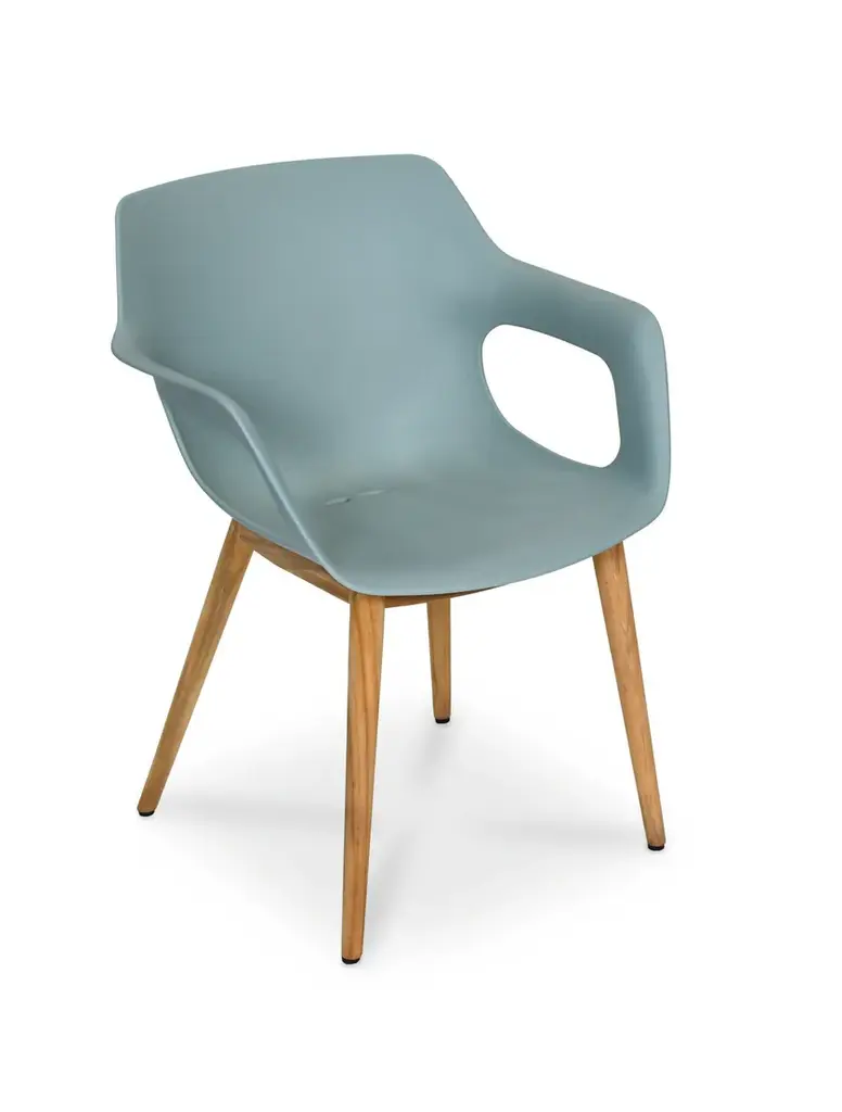 Tempus is a stackable armchair with an ergonomic seat shell made of recyclable plastic.The frame is made of teak, and the seat shell is available in four colors.