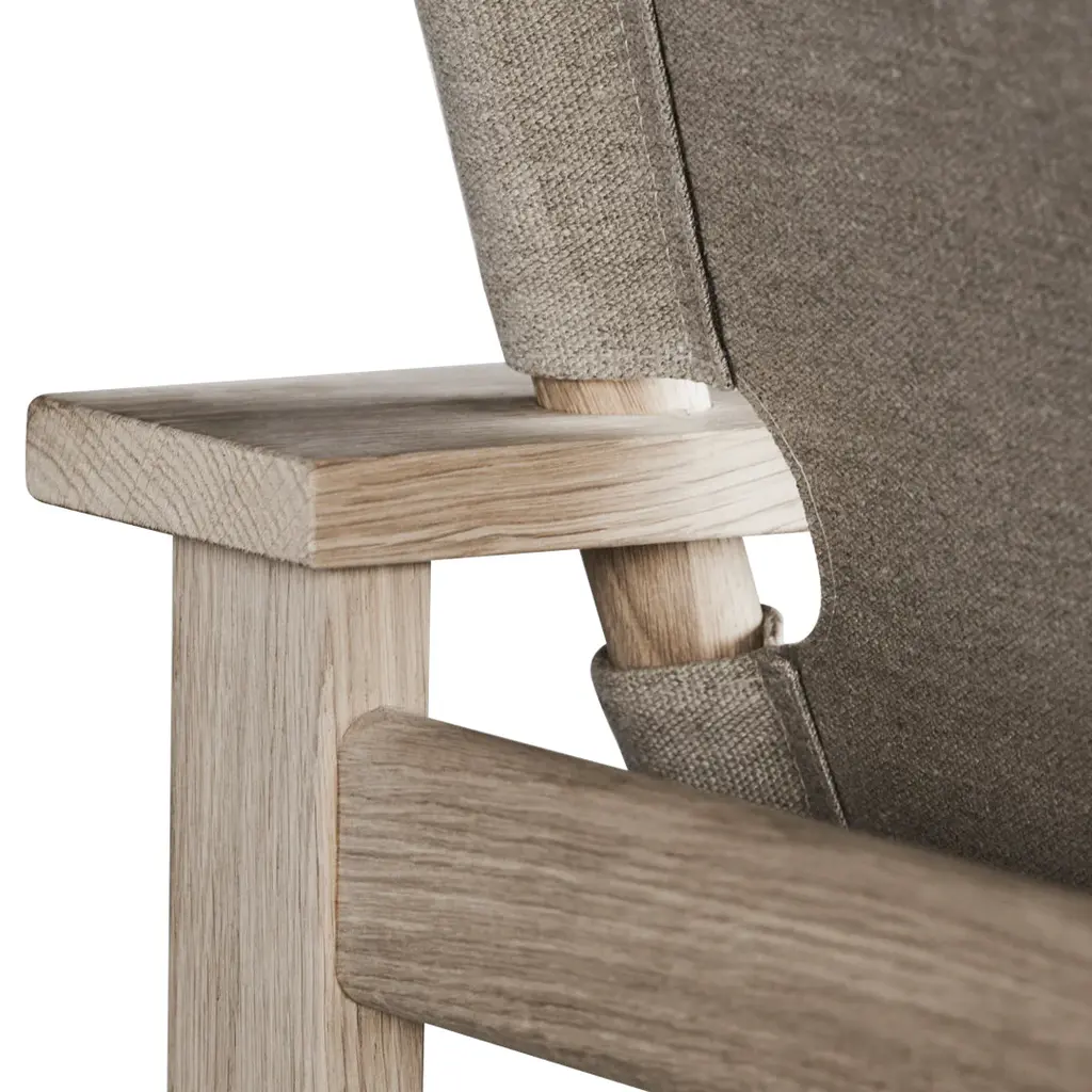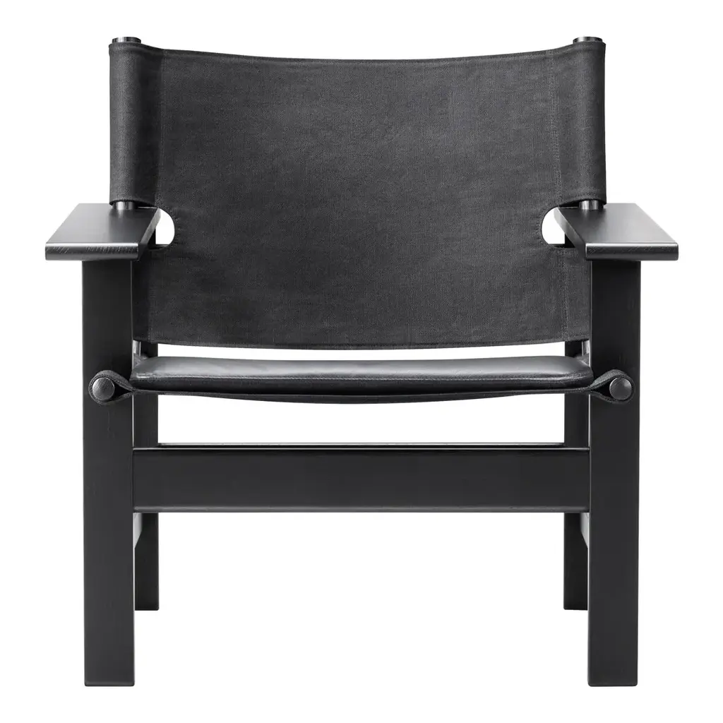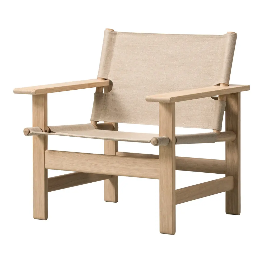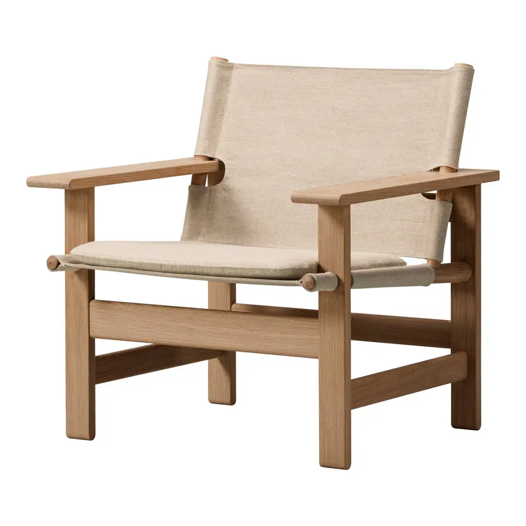 The Canvas Chair exemplifies Borge Mogensen's talent for functionally-driven designs with a focus on simple forms that capture the essence of an idea. With nothing to add or subtract. Drawing on his preference for natural materials, Mogensen used flat canvas as the seat and back suspended between round pieces of wood, together with his trademark use of horizontal and vertical lines for the frame. The result is contrast and a remarkable sense of balance. The Canvas Chair exemplifies Borge Mogensen's talent for functionally-driven designs with a focus on simple, structural forms that capture the essence of an idea. With nothing to add or subtract. Drawing on his preference for natural materials, Mogensen used flat canvas as the seat and back suspended between round pieces of wood, together with his trademark use of horizontal and vertical lines for the frame. The result is contrast and an uncanny sense of balance. Although it was designed in 1970 as a reaction to flashy furniture from the 1960s, The Canvas Chair takes on even more relevance today, given its earthy informality and honest materials. Boasting an unadorned authenticity which modern audiences find especially appealing. Prime European oak and linen canvas are both available in black or natural coloured versions, with an optional loose seating cushion in canvas or leather. One of the last pieces Mogensen designed before his untimely death in 1972, The Canvas Chair has remained in our archives ever since – until now. Whether in a hotel, lounge, retail space or private home, it's a statement piece with a strong presence.