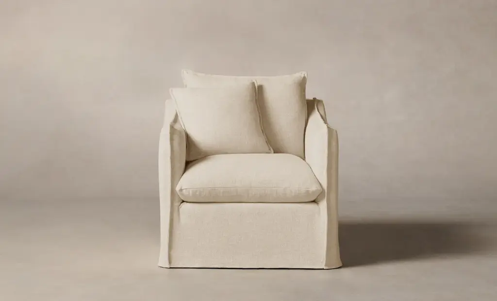 The Dune Chair is a vision of effortlessness and ease. It boasts a deep seat, plush cushioning, and relaxed slipcover with hand-sewn flange seams for an elegant finish. Handcrafted in North Carolina.