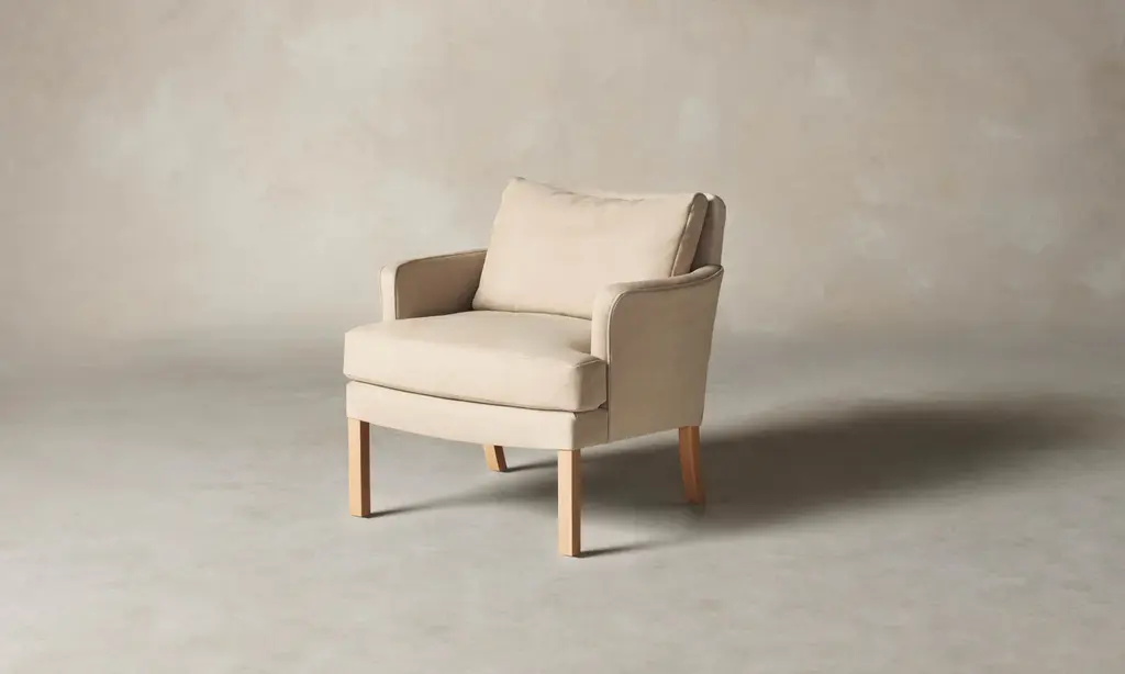 The Kaye Chair pays homage to mid-century Danish design with its simple form. Gently curved along the back and arms, it envelops the body in masterful upholstery and generous cushioning. Slender white oak legs lend the design a classic appeal. Handcrafted in North Carolina.
