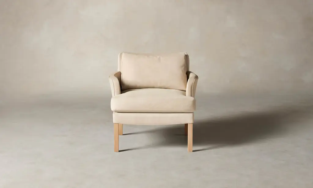 The Kaye Chair pays homage to mid-century Danish design with its simple form. Gently curved along the back and arms, it envelops the body in masterful upholstery and generous cushioning. Slender white oak legs lend the design a classic appeal. Handcrafted in North Carolina.