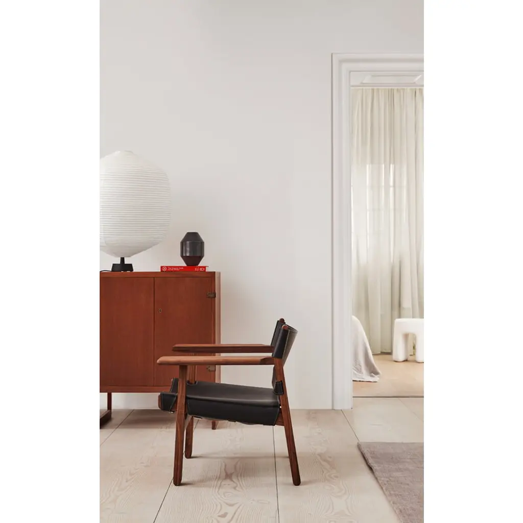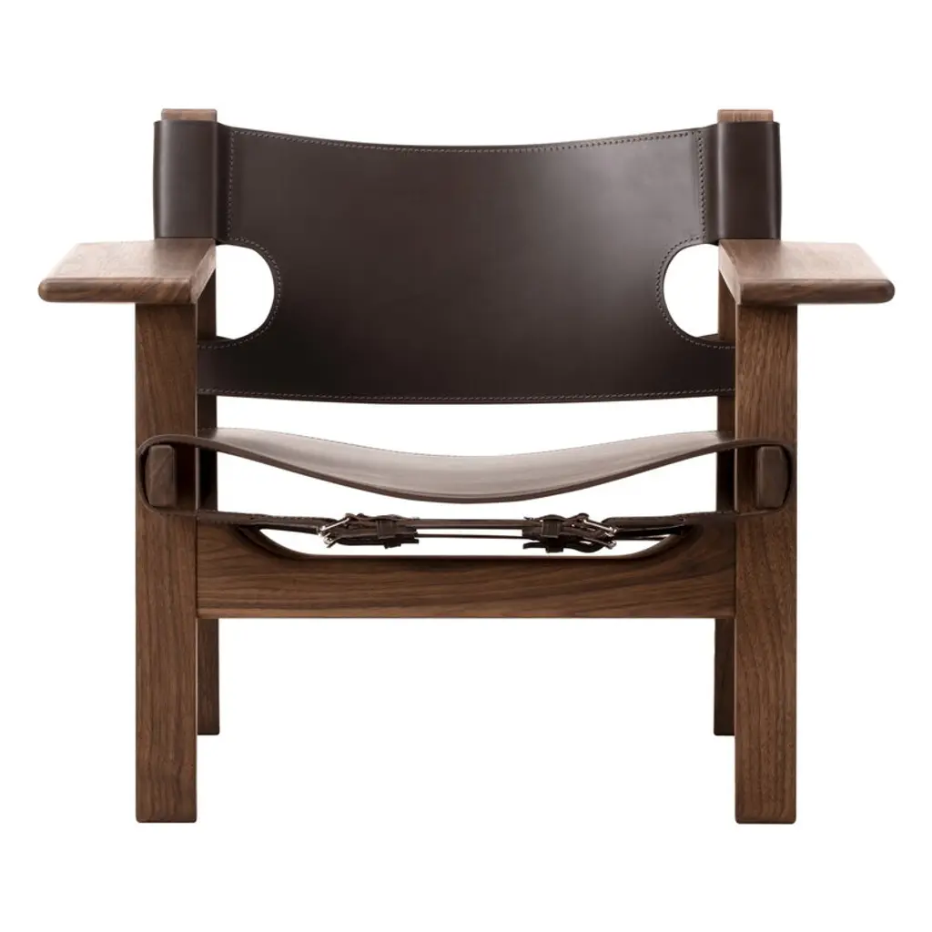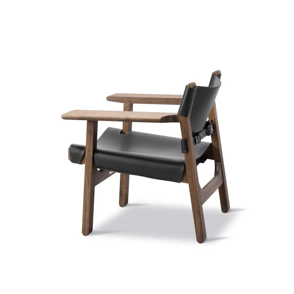 The Spanish Chair, designed by Børge Mogensen for Fredericia, is a Danish design icon from 1958. The Spanish Chair consists of a sturdy walnut frame with a leather seat and backrest, complemented with wide armrests which also function as practical little tables. Mogensen found the inspiration for the armrests from the chairs he saw while traveling in Spain through areas influenced by old Islamic culture. Due to the broad armrests, the Spanish Chair can be used without a separate side table, making the surrounding space more open. The name of the chair also refers to a medieval Spanish furniture technique in which saddle leather was attached to a solid wooden frame. Mogensen created several variations of the technique, the first time already in the Hunting Lodge collection in 1950 – the Spanish Chair has influences from the rustic lodge atmosphere, but its refined appearance makes it also a pure, timeless classic. The chair has been manufactured in Denmark.